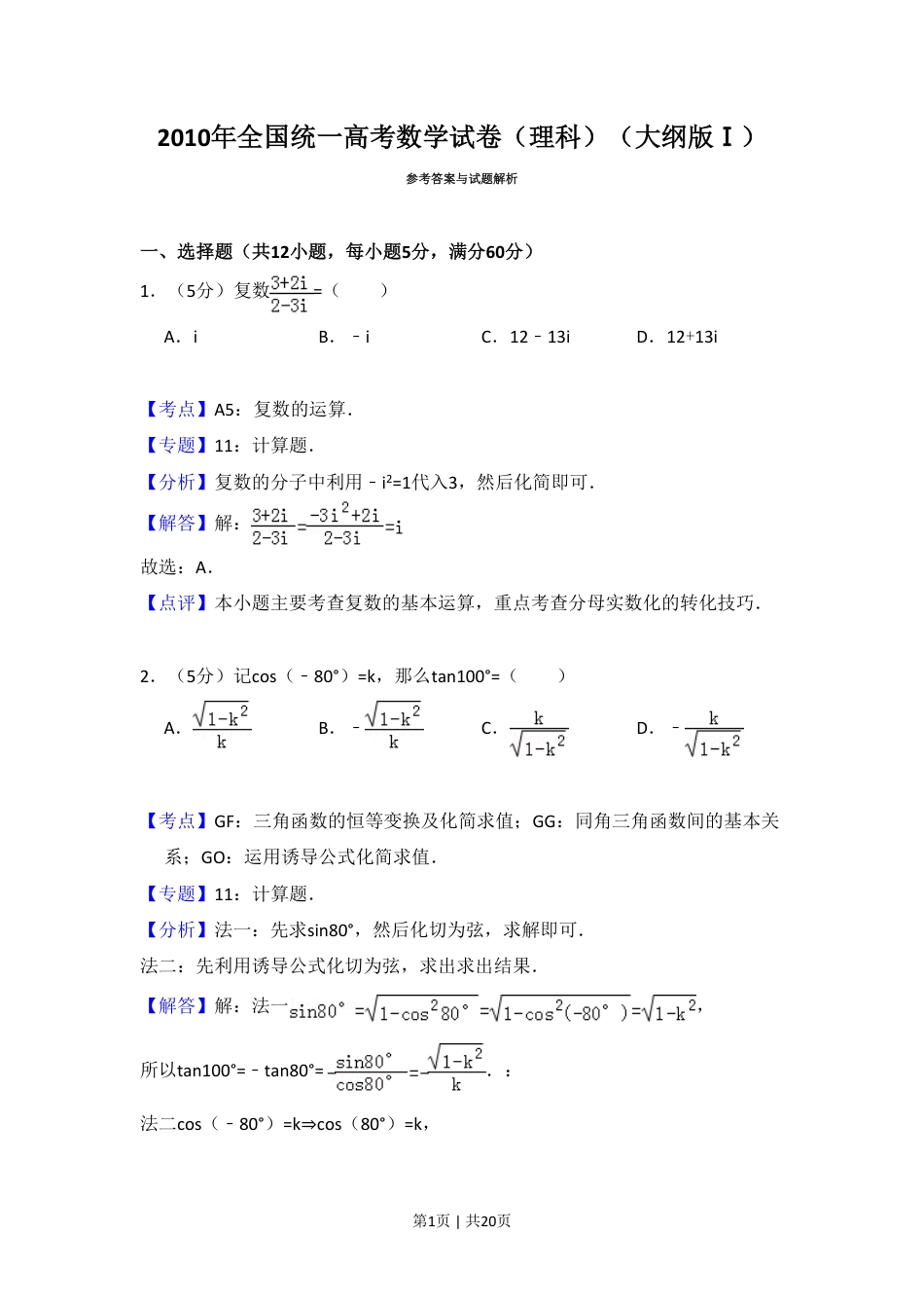 第1页|共20页2010年全国统一高考数学试卷(理科)(大纲版Ⅰ)参考答案与试题解析一、选择题(共12小题,每小题5分,满分60分)1.(5分)复数=()A.iB.﹣iC.12﹣13iD.12+13i【考点】A5:复数的运算.菁优网版权所有【专题】11:计算题.【分析】复数的分子中利用﹣i2=1代入3,然后化简即可.【解答】解:故选:A.【点评】本小题主要考查复数的基本运算,重点考查分母实数化的转化技巧.2.(5分)记cos(﹣80°)=k,那么tan100°=()A.B.﹣C.D.﹣【考点】GF:三角函数的恒等变换及化简求值;GG:同角三角函数间的基本关系;GO:运用诱导公式化简求值.菁优网版权所有【专题】11:计算题.【分析】法一:先求sin80°,然后化切为弦,求解即可.法二:先利用诱导公式化切为弦,求出求出结果.【解答】解:法一,所以tan100°=﹣tan80°=.:法二cos(﹣80°)=k⇒cos(80°)=k,第2页|共20页=【点评】本小题主要考查诱导公式、同角三角函数关系式等三角函数知识,并突出了弦切互化这一转化思想的应用.3.(5分)若变量x,y满足约束条件,则z=x﹣2y的最大值为()A.4B.3C.2D.1【考点】7C:简单线性规划.菁优网版权所有【专题】11:计算题;31:数形结合.【分析】先根据约束条件画出可行域,再利用几何意义求最值,z=x﹣2y表示直线在y轴上的截距,只需求出可行域直线在y轴上的截距最小值即可.【解答】解:画出可行域(如图),z=x﹣2y⇒y=x﹣z,由图可知,当直线l经过点A(1,﹣1)时,z最大,且最大值为zmax=1﹣2×(﹣1)=3.故选:B.【点评】本小题主要考查线性规划知识、作图、识图能力及计算能力,以及利用几何意义求最值,属于基础题.第3页|共20页4.(5分)已知各项均为正数的等比数列{an},a1a2a3=5,a7a8a9=10,则a4a5a6=()A.B.7C.6D.【考点】87:等比数列的性质.菁优网版权所有【分析】由数列{an}是等比数列,则有a1a2a3=5⇒a23=5;a7a8a9=10⇒a83=10.【解答】解:a1a2a3=5⇒a23=5;a7a8a9=10⇒a83=10,a52=a2a8,∴,∴,故选:A.【点评】本小题主要考查等比数列的性质、指数幂的运算、根式与指数式的互化等知识,着重考查了转化与化归的数学思想.5.(5分)(1+2)3(1﹣)5的展开式中x的系数是()A.﹣4B.﹣2C.2D.4【考点】DA:二项式定理.菁优网版权所有【专题】11:计算题.【分析】利用完全平方公式展开,利用二项展开式的通项公式求出x的系数.【解答】解:(1+2)3(1﹣)5=(1+6+12x+8x)(1﹣)5故(1+2)3(1﹣)5的展开式中含x的项为1×C53()3+12x=﹣10x+12xC50=2x,所以x的系数为2.故选:C.【点评】本小题主要考查了考生对二项式定理的掌握情况,尤其是展开式的通项公式的灵活应用,以及能否区分展开式中项的系数与其二项式系数,同时也考查了考生的一些基本运算能力第4页|共20页6.(5分)某校开设A类选修课3门,B类选择课4门,一位同学从中共选3门,若要求两类课程中各至少选一门,则不同的选法共有()A.30种B.35种C.42种D.48种【考点】D1:分类加法计数原理.菁优网版权所有【专题】11:计算题.【分析】两类课程中各至少选一门,包含两种情况:A类选修课选1门,B类选修课选2门;A类选修课选2门,B类选修课选1门,写出组合数,根据分类计数原理得到结果.【解答】解:可分以下2种情况:①A类选修课选1门,B类选修课选2门,有C31C42种不同的选法;②A类选修课选2门,B类选修课选1门,有C32C41种不同的选法.∴根据分类计数原理知不同的选法共有C31C42+C32C41=18+12=30种.故选:A.【点评】本小题主要考查分类计数原理、组合知识,以及分类讨论的数学思想.本题也可以从排列的对立面来考虑,写出所有的减去不合题意的,可以这样解:C73﹣C33﹣C43=30.7.(5分)正方体ABCD﹣A1B1C1D1中,BB1与平面ACD1所成角的余弦值为()A.B.C.D.【考点】MI:直线与平面所成的角;MK:点、线、面间的距离计算.菁优网版权所有【专题】5G:空间角.【分析】正方体上下底面中心的连线平行于BB1,上下底面中心的连线与平面ACD1所成角,即为BB1与平面ACD1所成角,直角三角形中,利用边角关系求出此角的余弦值.【解答】解...