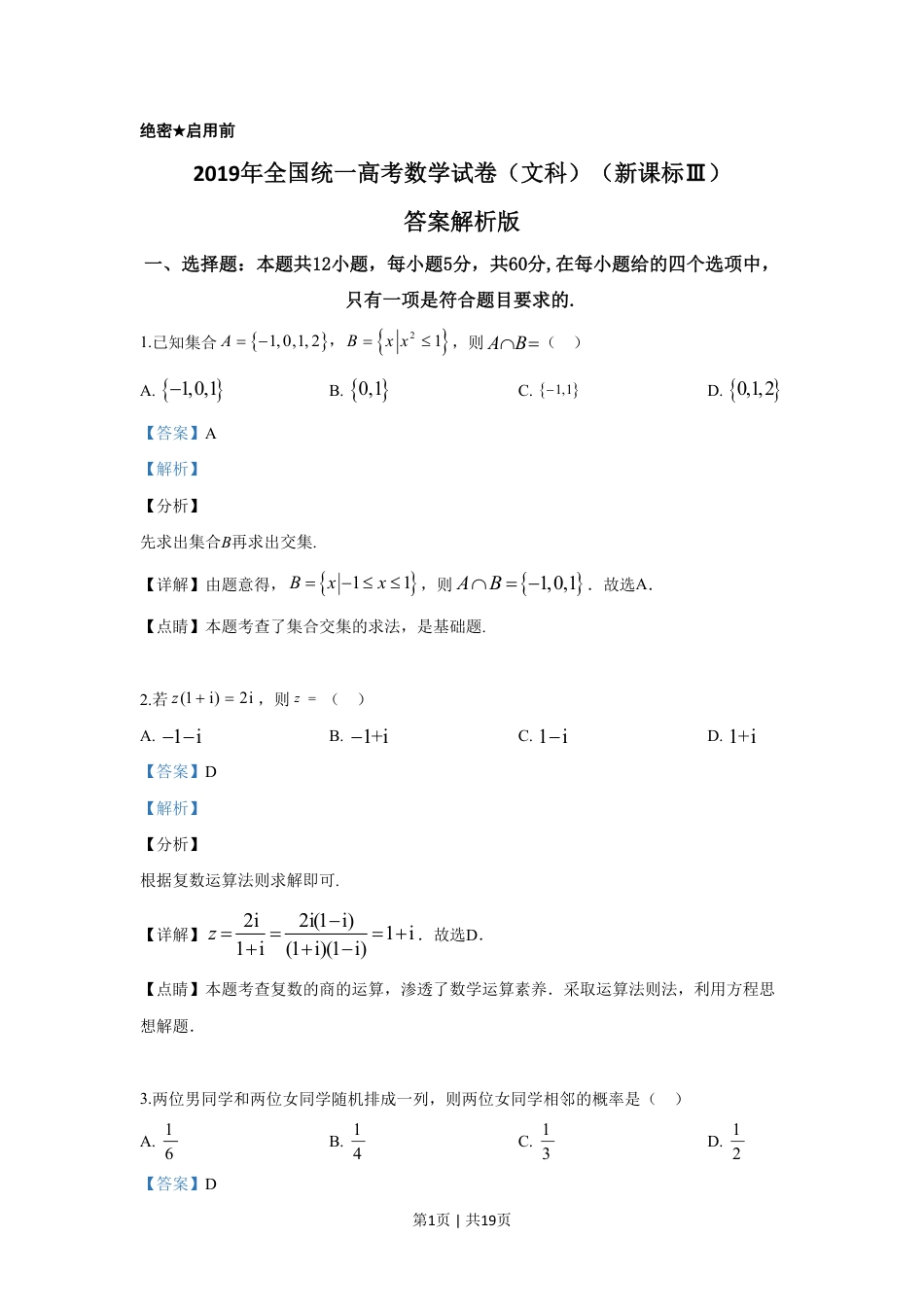 2019年高考数学试卷(文)(新课标Ⅲ)(解析卷) (2).pdf本文件免费下载 【共19页】