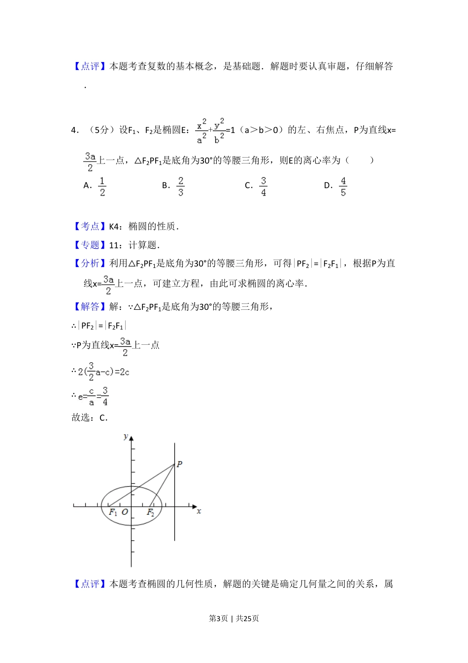 第1页|共25页2012年全国统一高考数学试卷(理科)(新课标)参考答案与试题解析一、选择题:本大题共12小题,每小题5分,在每小题给同的四个选项中,只有一项是符合题目要求的.1.(5分)已知集合A={1,2,3,4,5},B={(x,y)|x∈A,y∈A,x﹣y∈A},则B中所含元素的个数为()A.3B.6C.8D.10【考点】12:元素与集合关系的判断.菁优网版权所有【专题】5J:集合.【分析】由题意,根据集合B中的元素属性对x,y进行赋值得出B中所有元素,即可得出B中所含有的元素个数,得出正确选项【解答】解:由题意,x=5时,y=1,2,3,4,x=4时,y=1,2,3,x=3时,y=1,2,x=2时,y=1综上知,B中的元素个数为10个故选:D.【点评】本题考查元素与集合的关系的判断,解题的关键是理解题意,领会集合B中元素的属性,用分类列举的方法得出集合B中的元素的个数.2.(5分)将2名教师,4名学生分成2个小组,分别安排到甲、乙两地参加社会实践活动,每个小组由1名教师和2名学生组成,不同的安排方案共有()A.12种B.10种C.9种D.8种【考点】D9:排列、组合及简单计数问题.菁优网版权所有【专题】11:计算题.第2页|共25页【分析】将任务分三步完成,在每步中利用排列和组合的方法计数,最后利用分步计数原理,将各步结果相乘即可得结果【解答】解:第一步,为甲地选一名老师,有=2种选法;第二步,为甲地选两个学生,有=6种选法;第三步,为乙地选1名教师和2名学生,有1种选法故不同的安排方案共有2×6×1=12种故选:A.【点评】本题主要考查了分步计数原理的应用,排列组合计数的方法,理解题意,恰当分步是解决本题的关键,属基础题3.(5分)下面是关于复数z=的四个命题:其中的真命题为(),p1:|z|=2,p2:z2=2i,p3:z的共轭复数为1+i,p4:z的虚部为﹣1.A.p2,p3B.p1,p2C.p2,p4D.p3,p4【考点】2K:命题的真假判断与应用;A5:复数的运算.菁优网版权所有【专题】11:计算题.【分析】由z===﹣1﹣i,知,,p3:z的共轭复数为﹣1+i,p4:z的虚部为﹣1,由此能求出结果.【解答】解: z===﹣1﹣i,∴,,p3:z的共轭复数为﹣1+i,p4:z的虚部为﹣1,故选:C.第3页|共25页【点评】本题考查复数的基本概念,是基础题.解题时要认真审题,仔细解答.4.(5分)设F1、F2是椭圆E:+=1(a>b>0)的左、右焦点,P为直线x=上一点,△F2PF1是底角为30°的等腰三角形,则E的离心率为()A.B.C.D.【考点】K4:椭圆的性质.菁优网版权所有【专题】11:计算题.【分析】利用△F2PF1是底角为30°的等腰三角形,可得|PF2|=|F2F1|,根据P为直线x=上一点,可建立方程,由此可求椭圆的离心率.【解答】解: △F2PF1是底角为30°的等腰三角形,∴|PF2|=|F2F1| P为直线x=上一点∴∴故选:C.【点评】本题考查椭圆的几何性质,解题的关键是确定几何量之间的关系,属第4页|共25页于基础题.5.(5分)已知{an}为等比数列,a4+a7=2,a5a6=﹣8,则a1+a10=()A.7B.5C.﹣5D.﹣7【考点】87:等比数列的性质;88:等比数列的通项公式.菁优网版权所有【专题】11:计算题.【分析】由a4+a7=2,及a5a6=a4a7=﹣8可求a4,a7,进而可求公比q,代入等比数列的通项可求a1,a10,即可【解答】解: a4+a7=2,由等比数列的性质可得,a5a6=a4a7=﹣8∴a4=4,a7=﹣2或a4=﹣2,a7=4当a4=4,a7=﹣2时,,∴a1=﹣8,a10=1,∴a1+a10=﹣7当a4=﹣2,a7=4时,q3=﹣2,则a10=﹣8,a1=1∴a1+a10=﹣7综上可得,a1+a10=﹣7故选:D.【点评】本题主要考查了等比数列的性质及通项公式的应用,考查了基本运算的能力.6.(5分)如果执行右边的程序框图,输入正整数N(N≥2)和实数a1,a2,…,an,输出A,B,则()第5页|共25页A.A+B为a1,a2,…,an的和B.为a1,a2,…,an的算术平均数C.A和B分别是a1,a2,…,an中最大的数和最小的数D.A和B分别是a1,a2,…,an中最小的数和最大的数【考点】E7:循环结构.菁优网版权所有【专题】5K:算法和程序框图.【分析】分析程序中各变量、各语句的作用,再根据流程图所示的顺序,可知:该程序的作用是求出a1,a2,…,an中最大的数和最小的数.【解答】解:分析程序中...