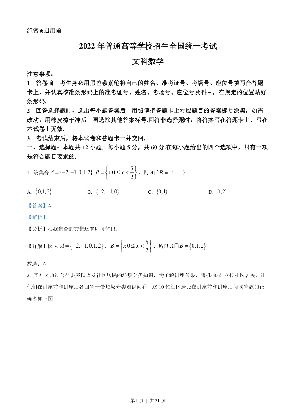 第1页|共21页绝密★启用前2022年普通高等学校招生全国统一考试文科数学注意事项:1.答卷前,考生务必用黑色碳素笔将自己的姓名、准考证号、考场号、座位号填写在答题卡上,并认真核准条形码上的准考证号、姓名、考场号、座位号及科目,在规定的位置贴好条形码.2.回答选择题时,选出每小题答案后,用铅笔把答题卡上对应题目的答案标号涂黑,如需改动,用橡皮擦干净后,再选涂其他答案标号.回答非选择题时,将答案写在答题卡上、写在本试卷上无效.3.考试结束后,将本试卷和答题卡一并交回.一、选择题:本题共12小题,每小题5分,共60分.在每小题给出的四个选项中,只有一项是符合题目要求的.1.设集合5{2,1,0,1,2},02ABxxìü=--=£<íýîþ∣,则AB=I()A.0,1,2B.{2,1,0}--C.{0,1}D.{1,2}【答案】A【解析】【分析】根据集合的交集运算即可解出.【详解】因2,1,0,1,2A=--,502Bxxìü=£<íýîþ∣,所以0,1,2AB=I.故选:A.2.某社区通过公益讲座以普及社区居民的垃圾分类知识.为了解讲座效果,随机抽取10位社区居民,让他们在讲座前和讲座后各回答一份垃圾分类知识问卷,这10位社区居民在讲座前和讲座后问卷答题的正确率如下图:为第2页|共21页则()A.讲座前问卷答题的正确率的中位数小于70%B.讲座后问卷答题的正确率的平均数大于85%C.讲座前问卷答题的正确率的标准差小于讲座后正确率的标准差D.讲座后问卷答题的正确率的极差大于讲座前正确率的极差【答案】B【解析】【分析】由图表信息,结合中位数、平均数、标准差、极差的概念,逐项判断即可得解.【详解】讲座前中位数为70%75%70%2+>,所以A错;讲座后问卷答题的正确率只有一个是80%,4个85%,剩下全部大于等于90%,所以讲座后问卷答题的正确率的平均数大于85%,所以B对;讲座前问卷答题的正确率更加分散,所以讲座前问卷答题的正确率的标准差大于讲座后正确率的标准差,所以C错;讲座后问卷答题的正确率的极差为100%80%20%-=,讲座前问卷答题的正确率的极差为95%60%35%20%-=>,所以D错.故选:B.3.若1iz=+.则|i3|zz+=()A.45B.42C.25D.22第3页|共21页【答案】D【解析】【分析】根据复数代数形式的运算法则,共轭复数的概念以及复数模的计算公式即可求出.【详解】因为1iz=+,所以i3i1i31i22izz+=++-=-,所以i34422zz+=+=.故选:D.4.如图,网格纸上绘制的是一个多面体的三视图,网格小正方形的边长为1,则该多面体的体积为()A.8B.12C.16D.20【答案】B【解析】【分析】由三视图还原几何体,再由棱柱的体积公式即可得解.【详解】由三视图还原几何体,如图,则该直四棱柱的体积2422122V+=´´=.故选:B.第4页|共21页5.将函数π()sin(0)3fxxwwæö=+>ç÷èø的图像向左平移π2个单位长度后得到曲线C,若C关于y轴对称,则w的最小值是()A.16B.14C.13D.12【答案】C【解析】【分析】先由平移求出曲线C的解析式,再结合对称性得,232kkwpppp+=+ÎZ,即可求出w的最小值.【详解】由题意知:曲线C为sinsin()2323yxxppwppwwéùæö=++=++ç÷êúèøëû,又C关于y轴对称,则,232kkwpppp+=+ÎZ,解得12,3kkw=+ÎZ,又0>w,故当0k=时,w的最小值为13.故选:C.6.从分别写有1,2,3,4,5,6的6张卡片中无放回随机抽取2张,则抽到的2张卡片上的数字之积是4的倍数的概率为()A.15B.13C.25D.23【答案】C【解析】【分析】先列举出所有情况,再从中挑出数字之积是4的倍数的情况,由古典概型求概率即可.【详解】从6张卡片中无放回抽取2张,共有1,2,1,3,1,4,1,5,1,6,2,3,2,4,2,5,2,6,3,4,3,5,3,6,4,5,4,6,5,615种情况,其中数字之积为4的倍数的有1,4,2,4,2,6,3,4,4,5,4,66种情况,故概率为62155=.故选:C.7.函数33cosxxyx-=-在区间ππ,22éù-êúëû的图象大致为()第5页|共21页A.B.C.D.【答案】A【解析】【分析】由函数的奇偶性结合指数函数、三角函数的性质逐项排除即可得解.【详解】令33cos,,22xxfxxxpp-éù=-Î-êúëû,则33cos33cosxxxxfxxxfx---=--=--=-,所以fx为奇函数,排除BD...