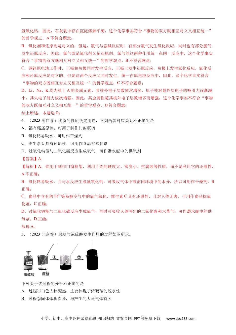 小学、初中、高中各种试卷真题知识归纳文案合同PPT等免费下载www.doc985.com五年(2019-2023)年高考真题分项汇编专题05常见无机物的性质、用途与转化〖2023年高考真题〗考点一常见无机物的性质与用途1.(2023·山东卷)实验室中使用盐酸、硫酸和硝酸时,对应关系错误的是A.稀盐酸:配制溶液B.稀硫酸:蔗糖和淀粉的水解C.稀硝酸:清洗附有银镜的试管D.浓硫酸和浓硝酸的混合溶液:苯的磺化【答案】D【解析】A.实验室配制AlCl3溶液时向其中加入少量的稀盐酸以抑制Al3+水解,A不合题意;B.蔗糖和淀粉的水解时常采用稀硫酸作催化剂,B不合题意;C.清洗附有银镜的试管用稀硝酸,反应原理为:3Ag+4HNO3(稀)=3AgNO3+NO↑+2H2O,C不合题意;D.苯的磺化是苯和浓硫酸共热,反应生成苯磺酸的反应,故不需要用到浓硫酸和浓硝酸的混合溶液,D符合题意;故答案为:D。2.(2023·浙江卷)氯化铁是一种重要的盐,下列说法不正确的是A.氯化铁属于弱电解质B.氯化铁溶液可腐蚀覆铜板C.氯化铁可由铁与氯气反应制得D.氯化铁溶液可制备氢氧化铁胶体【答案】A【解析】A.氯化铁能完全电离出铁离子和氯离子,属于强电解质,A错误;B.氯化铁溶液与铜反应生成氯化铜和氯化亚铁,可用来蚀刻铜板,B正确;C.氯气具有强氧化性,氯气与铁单质加热生成氯化铁,C正确;D.向沸水中滴加饱和氯化铁溶液,继续加热呈红褐色,铁离子发生水解反应可得到氢氧化铁胶体,D正确;故选:A。3.(2023·湖北卷)下列化学事实不符合“事物的双方既相互对立又相互统一”的哲学观点的是A.石灰乳中存在沉淀溶解平衡B.氯气与强碱反应时既是氧化剂又是还原剂C.铜锌原电池工作时,正极和负极同时发生反应D.Li、Na、K的金属性随其核外电子层数增多而增强【答案】D【解析】A.电解质的沉淀和溶解是对立的,当电解质的沉淀速率和溶解速率相等时,电解质建立了沉淀溶解平衡,因此,沉淀和溶解又互相统一在这个平衡体系中;石灰乳中存在着未溶解的氢氧化钙和溶解的小学、初中、高中各种试卷真题知识归纳文案合同PPT等免费下载www.doc985.com氢氧化钙,因此,石灰乳中存在沉淀溶解平衡,这个化学事实符合“事物的双方既相互对立又相互统一”的哲学观点,A不符合题意;B.氧化剂和还原剂是对立的,但是,氯气与强碱反应时,有部分氯气发生氧化反应,同时也有部分氯气发生还原反应,因此,氯气既是氧化剂又是还原剂,氯气的这两种作用统一在同一反应中,这个化学事实符合“事物的双方既相互对立又相互统一”的哲学观点,B不符合题意;C.铜锌原电池工作时,正极和负极同时发生反应,正极上发生还原反应,负极上发生氧化反应,氧化反应和还原反应是对立的,但是这两个反应又同时发生,统一在原电池反应中,因此,这个化学事实符合“事物的双方既相互对立又相互统一”的哲学观点,C不符合题意;D.Li、Na、K均为第ⅠA的金属元素,其核外电子层数依次增多,原子核对最外层电子的吸引力逐渐减小,其失电子能力依次增强,因此,其金属性随其核外电子层数增多而增强,这个化学事实不符合“事物的双方既相互对立又相互统一”的哲学观点,D符合题意;综上所述,本题选D。4.(2023·浙江卷)物质的性质决定用途,下列两者对应关系不正确的是A.铝有强还原性,可用于制作门窗框架B.氧化钙易吸水,可用作干燥剂C.维生素C具有还原性,可用作食品抗氧化剂D.过氧化钠能与二氧化碳反应生成氧气,可作潜水艇中的供氧剂【答案】A【解析】A.铝用于制作门窗框架,利用了铝的硬度大、密度小、抗腐蚀等性质,而不是利用它的还原性,A不正确;B.氧化钙易吸水,并与水反应生成氢氧化钙,可吸收气体中或密闭环境中的水分,所以可用作干燥剂,B正确;C.食品中含有的Fe2+等易被空气中的氧气氧化,维生素C具有还原性,且对人体无害,可用作食品抗氧化剂,C正确;D.过氧化钠能与二氧化碳反应生成氧气,同时可吸收人体呼出的二氧化碳和水蒸气,可作潜水艇中的供氧剂,D正确;故选A。5.(2023·北京卷)蔗糖与浓硫酸发生作用的过程如图所示。下列关于该过程的分析不正确的是A.过程①白色固体变黑,主要体现了浓硫酸的脱水性B.过程②固体体积膨...