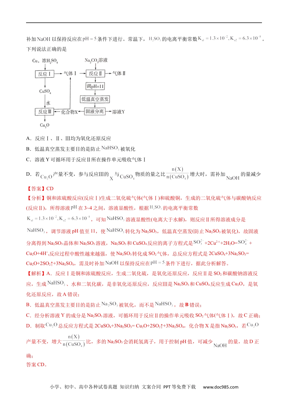 小学、初中、高中各种试卷真题知识归纳文案合同PPT等免费下载www.doc985.com五年(2019-2023)年高考真题分项汇编专题04氧化还原反应〖2023年高考真题〗考点一氧化还原反应基础知识1.(2023·全国乙卷)下列应用中涉及到氧化还原反应的是A.使用明矾对水进行净化B.雪天道路上撒盐融雪C.暖贴中的铁粉遇空气放热D.荧光指示牌被照发光【答案】C【解析】A.使用明矾对水进行净化过程中,明矾电离出的铝离子发生水解生成氢氧化铝胶体,氢氧化铝胶体粒子吸附水中的悬浮颗粒并沉降下来而水变得澄清,该过程中没有任何一种元素的化合价发生变化,因此没有涉及到氧化还原反应,A不符合题意;B.雪天道路上撒盐融雪,是因为雪遇到盐而使其熔点降低并熔化,该过程中没有任何一种元素的化合价发生变化,因此没有涉及到氧化还原反应,B不符合题意;C.暖贴中的铁粉遇空气放热,是因为暖贴中含有的铁粉、碳粉、氯化钠、水等物质,形成当这些物质遇到空气后形成无数微小原电池并开始工作,化学能转化为电能,无数微小原电池堆积在一起使得电能又转化为热能,该过程中铁元素和氧元素的化合价发生变化,因此,该过程涉及到氧化还原反应,C符合题意;D.荧光指示牌被照发光,是因为光被指示牌发生了反射,该过程中没有任何一种元素的化合价发生变化,因此没有涉及到氧化还原反应,D不符合题意;综上所述,本题选C。2.(2023·湖北卷)下列化学事实不符合“事物的双方既相互对立又相互统一”的哲学观点的是A.石灰乳中存在沉淀溶解平衡B.氯气与强碱反应时既是氧化剂又是还原剂C.铜锌原电池工作时,正极和负极同时发生反应D.Li、Na、K的金属性随其核外电子层数增多而增强【答案】D【解析】A.电解质的沉淀和溶解是对立的,当电解质的沉淀速率和溶解速率相等时,电解质建立了沉淀溶解平衡,因此,沉淀和溶解又互相统一在这个平衡体系中;石灰乳中存在着未溶解的氢氧化钙和溶解的氢氧化钙,因此,石灰乳中存在沉淀溶解平衡,这个化学事实符合“事物的双方既相互对立又相互统一”的哲学观点,A不符合题意;B.氧化剂和还原剂是对立的,但是,氯气与强碱反应时,有部分氯气发生氧化反应,同时也有部分氯气发生还原反应,因此,氯气既是氧化剂又是还原剂,氯气的这两种作用统一在同一反应中,这个化学事实符合“事物的双方既相互对立又相互统一”的哲学观点,B不符合题意;C.铜锌原电池工作时,正极和负极同时发生反应,正极上发生还原反应,负极上发生氧化反应,氧化反应和还原反应是对立的,但是这两个反应又同时发生,统一在原电池反应中,因此,这个化学事实符合“事物的双方既相互对立又相互统一”的哲学观点,C不符合题意;小学、初中、高中各种试卷真题知识归纳文案合同PPT等免费下载www.doc985.comD.Li、Na、K均为第ⅠA的金属元素,其核外电子层数依次增多,原子核对最外层电子的吸引力逐渐减小,其失电子能力依次增强,因此,其金属性随其核外电子层数增多而增强,这个化学事实不符合“事物的双方既相互对立又相互统一”的哲学观点,D符合题意;综上所述,本题选D。考点二氧化还原方程式的配平与计算3.(2023·湖南卷)油画创作通常需要用到多种无机颜料。研究发现,在不同的空气湿度和光照条件下,颜料雌黄褪色的主要原因是发生了以下两种化学反应:下列说法正确的是A.和的空间结构都是正四面体形B.反应Ⅰ和Ⅱ中,元素和S都被氧化C.反应Ⅰ和Ⅱ中,参加反应的:Ⅰ<ⅡD.反应Ⅰ和Ⅱ中,氧化转移的电子数之比为3∶7【答案】D【解析】A.的中心原子S形成的4个σ键的键长不一样,故其空间结构不是正四面体形,A错误;B.中As的化合价为+3价,反应Ⅰ产物中As的化合价为+3价,故该过程中As没有被氧化,B错误;C.根据题给信息可知,反应I的方程式为:,反应Ⅱ的方程式为:,则反应Ⅰ和Ⅱ中,参加反应的:Ⅰ>Ⅱ,C错误;D.中As为+3价,S为-2价,在经过反应Ⅰ后,As的化合价没有变,S变为+2价,则1mol失电子3×4mol=12mol;在经过反应Ⅱ后,As变为+5价,S变为+6价,则1mol失电子2×2mol+3×8mol=28mol,则反应Ⅰ和Ⅱ中,氧化转移的电子数之比为3∶7,D正确;故选D。考点三氧化还原反应的应用...