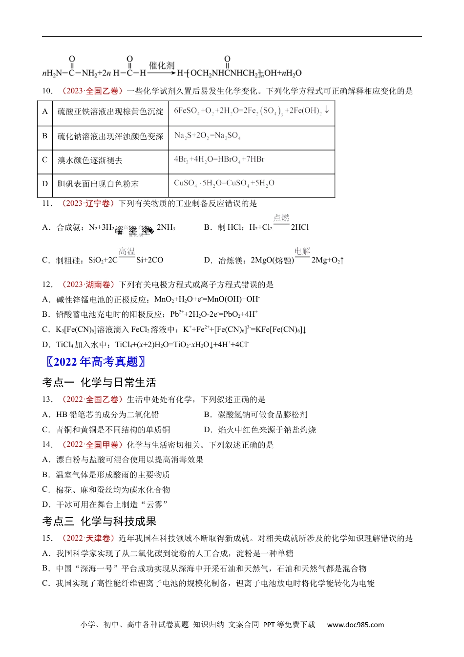 小学、初中、高中各种试卷真题知识归纳文案合同PPT等免费下载www.doc985.com五年(2019-2023)年高考真题分项汇编专题01STSE传统文化化学用语〖2023年高考真题〗考点一化学与日常生活、生产1.(2023·全国甲卷)化学与生活密切相关,下列说法正确的是A.苯甲酸钠可作为食品防腐剂是由于其具有酸性B.豆浆能产生丁达尔效应是由于胶体粒子对光线的散射C.SO2可用于丝织品漂白是由于其能氧化丝织品中有色成分D.维生素C可用作水果罐头的抗氧化剂是由于其难以被氧化考点二化学与科技成果2.(2023·辽宁卷)科技是第一生产力,我国科学家在诸多领域取得新突破,下列说法错误的是A.利用CO2合成了脂肪酸:实现了无机小分子向有机高分子的转变B.发现了月壤中的“嫦娥石[(Ca8Y)Fe(PO4)7]”:其成分属于无机盐C.研制了高效率钙钛矿太阳能电池,其能量转化形式:太阳能→电能D.革新了海水原位电解制氢工艺:其关键材料多孔聚四氟乙烯耐腐蚀考点三化学与传统文化3.(2023·湖南卷)中华文化源远流长,化学与文化传承密不可分。下列说法错误的是A.青铜器“四羊方尊”的主要材质为合金B.长沙走马楼出土的竹木简牍主要成分是纤维素C.蔡伦采用碱液蒸煮制浆法造纸,该过程不涉及化学变化D.铜官窑彩瓷是以黏土为主要原料,经高温烧结而成4.(2023·新课标卷)化学在文物的研究和修复中有重要作用。下列说法错误的是A.竹简的成分之一纤维素属于天然高分子B.龟甲的成分之一羟基磷灰石属于无机物C.古陶瓷修复所用的熟石膏,其成分为Ca(OH)2D.古壁画颜料中所用的铁红,其成分为Fe2O3考点四化学用语5.(2023·辽宁卷)下列化学用语或表述正确的是A.BeCl2的空间结构:V形B.P4中的共价键类型:非极性键C.基态Ni原子价电子排布式:3d10D.顺—2—丁烯的结构简式:6.(2023·北京卷)下列化学用语或图示表达正确的是()小学、初中、高中各种试卷真题知识归纳文案合同PPT等免费下载www.doc985.comA.的电子式为B.的VSEPR模型为C.电子云图为D.基态原子的价层电子轨道表示式为7.(2023·浙江卷)下列化学用语表示正确的是A.分子的球棍模型:B.的价层电子对互斥模型:C.的电子式:D.的名称:3−甲基戊烷8.(2023·湖南卷)下列化学用语表述错误的是A.HClO的电子式:B.中子数为10的氧原子:OC.NH3分子的VSEPR模型:D.基态N原子的价层电子排布图:9.(2023·湖北卷)化学用语可以表达化学过程,下列化学用语的表达错误的是A.用电子式表示的形成:B.用离子方程式表示溶于烧碱溶液:C.用电子云轮廓图表示H-H的s-sσ键形成的示意图:D.用化学方程式表示尿素与甲醛制备线型脲醛树脂:小学、初中、高中各种试卷真题知识归纳文案合同PPT等免费下载www.doc985.com10.(2023·全国乙卷)一些化学试剂久置后易发生化学变化。下列化学方程式可正确解释相应变化的是A硫酸亚铁溶液出现棕黄色沉淀B硫化钠溶液出现浑浊颜色变深C溴水颜色逐渐褪去D胆矾表面出现白色粉末11.(2023·辽宁卷)下列有关物质的工业制备反应错误的是A.合成氨:N2+3H22NH3B.制HCl:H2+Cl22HClC.制粗硅:SiO2+2CSi+2COD.冶炼镁:2MgO(熔融)2Mg+O2↑12.(2023·湖南卷)下列有关电极方程式或离子方程式错误的是A.碱性锌锰电池的正极反应:MnO2+H2O+e-=MnO(OH)+OH-B.铅酸蓄电池充电时的阳极反应:Pb2++2H2O-2e-=PbO2+4H+C.K3[Fe(CN)6]溶液滴入FeCl2溶液中:K++Fe2++[Fe(CN)6]3-=KFe[Fe(CN)6]↓D.TiCl4加入水中:TiCl4+(x+2)H2O=TiO2·xH2O↓+4H++4Cl-〖2022年高考真题〗考点一化学与日常生活13.(2022·全国乙卷)生活中处处有化学,下列叙述正确的是A.HB铅笔芯的成分为二氧化铅B.碳酸氢钠可做食品膨松剂C.青铜和黄铜是不同结构的单质铜D.焰火中红色来源于钠盐灼烧14.(2022·全国甲卷)化学与生活密切相关。下列叙述正确的是A.漂白粉与盐酸可混合使用以提高消毒效果B.温室气体是形成酸雨的主要物质C.棉花、麻和蚕丝均为碳水化合物D.干冰可用在舞台上制造“云雾”考点三化学与科技成果15.(2022·天津卷)近年我国在科技领域不断取得新成就。对相关成就所涉及的化学知识理解错误的是A.我国科学...