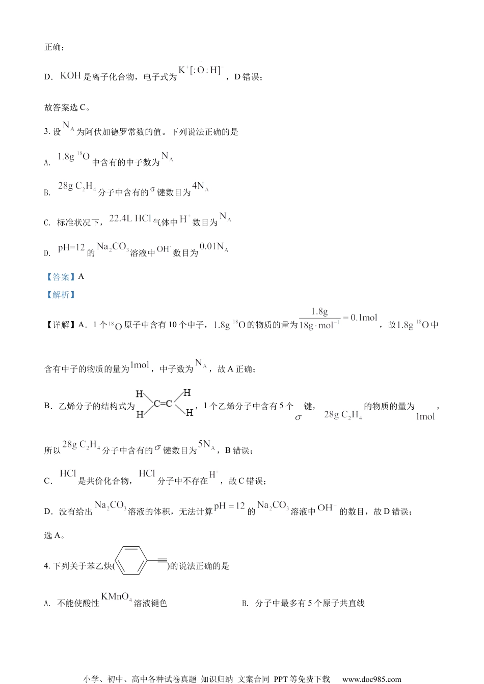 小学、初中、高中各种试卷真题知识归纳文案合同PPT等免费下载www.doc985.com2022年辽宁省普通高等学校招生选择性考试化学本试卷满分100分,考试时间75分钟。可能用到的相对原子质量:H-1B-11C-12N-14O-16Na-23S-32Fe-56一、选择题:本题共15小题,每小题3分,共45分。在每小题给出的四个选项中,只有一项符合题目要求。1.北京冬奥会备受世界瞩目。下列说法错误的是A.冰壶主材料花岗岩属于无机非金属材料B.火炬“飞扬”使用的碳纤维属于有机高分子材料C.冬奥会“同心”金属奖牌属于合金材料D.短道速滑服使用的超高分子量聚乙烯属于有机高分子材料【答案】B【解析】【详解】A.花岗岩的主要成分是石英、云母、长石等矿物,属于无机非金属材料,A正确;B.碳纤维指的是含碳量在90%以上的高强度高模量纤维,属于无机非金属材料,B错误;C.金属奖牌属于合金材料,C正确;D.聚乙烯属于有机高分子材料,D正确;故答案选B。2.下列符号表征或说法正确的是A.电离:B.位于元素周期表p区C.空间结构:平面三角形D.电子式:【答案】C【解析】【详解】A.是二元弱酸,电离分步进行,其一级电离方程式为,A错误;B.基态原子的价电子排布式是,最后一个电子填充在s能级,位于元素周期表s区,B错误;C.中心碳原子的价层电子对数为,故其空间结构为平面三角形,C小学、初中、高中各种试卷真题知识归纳文案合同PPT等免费下载www.doc985.com正确;D.是离子化合物,电子式为,D错误;故答案选C。3.设为阿伏加德罗常数的值。下列说法正确的是A.中含有的中子数为B.分子中含有的键数目为C.标准状况下,气体中数目为D.的溶液中数目为【答案】A【解析】【详解】A.1个原子中含有10个中子,的物质的量为,故中含有中子的物质的量为,中子数为,故A正确;B.乙烯分子的结构式为,1个乙烯分子中含有5个键,的物质的量为,所以分子中含有的键数目为,B错误;C.是共价化合物,分子中不存在,故C错误;D.没有给出溶液的体积,无法计算的溶液中的数目,故D错误;选A。4.下列关于苯乙炔()的说法正确的是A.不能使酸性溶液褪色B.分子中最多有5个原子共直线小学、初中、高中各种试卷真题知识归纳文案合同PPT等免费下载www.doc985.comC.能发生加成反应和取代反应D.可溶于水【答案】C【解析】【分析】根据苯环的性质判断可以发生氧化、加成、取代反应;根据碳碳叁键的特点判断可发生加成反应,能被酸性高锰酸钾钾氧化,对于共线可根据有机碳原子的杂化及官能团的空间结构进行判断;【详解】A.苯乙炔分子中含有碳碳三键,能使酸性溶液褪色,A错误;B.如图所示,,苯乙炔分子中最多有6个原子共直线,B错误;C.苯乙炔分子中含有苯环和碳碳三键,能发生加成反应,苯环上的氢原子能被取代,可发生取代反应,C正确;D.苯乙炔属于烃,难溶于水,D错误;故选答案C;【点睛】本题考查苯乙炔的结构与性质,根据官能团的特点进行判断。5.短周期元素X、Y、Z、W、Q原子序数依次增大。基态X、Z、Q原子均有两个单电子,W简单离子在同周期离子中半径最小,Q与Z同主族。下列说法错误的是A.X能与多种元素形成共价键B.简单氢化物沸点:C.第一电离能:D.电负性:【答案】B【解析】【分析】短周期元素X、Y、Z、W、Q原子序数依次增大,W简单离子在同周期离子中半径最小,说明W为第三周期元素Al。短周期元素的基态原子中有两个单电子,可分类讨论:①为第二周期元素时,最外层电子排布为2s22p2或2s22p4,即C或O;②为第三周期元素时,最外层电子排布为3s23p2或3s23p4,即Si或S。Q与Z同主族,结合原子序数大小关系可知,则X、Z、Q分别为C、O和S,则Y为N。【详解】A.X为C,能与多种元素(H、O、N、P、S等)形成共价键,A正确;B.Z和Q形成的简单氢化物为H2O和H2S,由于H2O分子间能形成氢键,故H2O沸点高于H2S,B错误;C.Y为N,Z为O,N的最外层p轨道电子为半充满结构,比较稳定,故其第一电离能比O大,C正确;D.W为Al,Z为O,O的电负性更大,D正确;故选B。小学、初中、高中各种试卷真题知识归纳文案合同PPT等免费下载www.doc985.com6.镀锌铁钉放入棕色的碘水中,溶液褪色;取出铁钉后加入少量漂白粉,溶液恢复棕色;加入,振荡,静置,液...