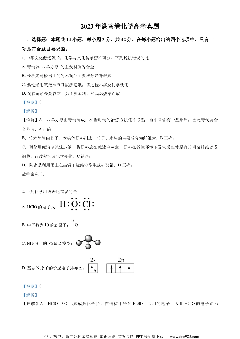小学、初中、高中各种试卷真题知识归纳文案合同PPT等免费下载www.doc985.com2023年湖南卷化学高考真题一、选择题:本题共14小题,每小题3分,共42分。在每小题给出的四个选项中,只有一项是符合题目要求的。1.中华文化源远流长,化学与文化传承密不可分。下列说法错误的是A.青铜器“四羊方尊”的主要材质为合金B.长沙走马楼出土的竹木简牍主要成分是纤维素C.蔡伦采用碱液蒸煮制浆法造纸,该过程不涉及化学变化D.铜官窑彩瓷是以黏土为主要原料,经高温烧结而成【答案】C【解析】【详解】A.四羊方尊由青铜制成,在当时铜的冶炼方法还不成熟,铜中常含有一些杂质,因此青铜属合金范畴,A正确;B.竹木简牍由竹子、木头等原料制成,竹子、木头的主要成分为纤维素,B正确;C.蔡伦用碱液制浆法造纸,将原料放在碱液中蒸煮,原料在碱性环境下发生反应使原有的粗浆纤维变成细浆,该过程涉及化学变化,C错误;D.陶瓷是利用黏土在高温下烧结定型生成硅酸铝,D正确;故答案选C。2.下列化学用语表述错误的是A.HClO的电子式:B.中子数为10的氧原子:OC.NH3分子的VSEPR模型:D.基态N原子的价层电子排布图:【答案】C【解析】【详解】A.HClO中O元素成负化合价,在结构中得到H和Cl共用的电子,因此HClO的电子式为小学、初中、高中各种试卷真题知识归纳文案合同PPT等免费下载www.doc985.com,A正确;B.中子数为10,质子数为8的O原子其相对原子质量为10+8=18,其原子表示为O,B正确;C.根据VSEPR模型计算,NH3分子中有1对故电子对,N还连接有3和H原子,因此NH3的VSEPR模型为四面体型,C错误;D.基态N原子是价层电子排布为2s22p3,其电子排布图为,D正确;故答案选C。3.下列玻璃仪器在相应实验中选用不合理的是A.重结晶法提纯苯甲酸:①②③B.蒸馏法分离CH2Cl2和CCl4:③⑤⑥C.浓硫酸催化乙醇制备乙烯:③⑤D.酸碱滴定法测定NaOH溶液浓度:④⑥【答案】A【解析】【详解】A.粗苯甲酸中含有少量氯化钠和泥沙,需要利用重结晶来提纯苯甲酸,具体操作为加热溶解、趁热过滤和冷却结晶,此时利用的玻璃仪器有漏斗、烧杯、玻璃棒,A选项装置选择不合理;B.蒸馏法需要用到温度计以测量蒸汽温度、蒸馏烧瓶用来盛装混合溶液、锥形瓶用于盛装收集到的馏分,B选项装置选择合理;C.浓硫酸催化制乙烯需要控制反应温度为170℃,需要利用温度计测量反应体系的温度,C选项装置选择合理;D.酸碱滴定法测定NaOH溶液浓度是用已知浓度的酸液滴定未知浓度的碱液,酸液盛装在酸式滴定管中,D选项装置选择合理;故答案选A。小学、初中、高中各种试卷真题知识归纳文案合同PPT等免费下载www.doc985.com4.下列有关物质结构和性质的说法错误的是A.含有手性碳原子的分子叫做手性分子B.邻羟基苯甲醛的沸点低于对羟基苯甲醛的沸点C.酰胺在酸或碱存在并加热的条件下可发生水解反应D.冠醚(18-冠-6)的空穴与K+尺寸适配,两者能通过弱相互作用形成超分子【答案】A【解析】【详解】A.有手性异构体的分子被称为手性分子,当分子中存在两个或两个以上的手性碳原子时,会出现内消旋体,这种含有内消旋体的分子不是手性分子,A错误;B.邻羟基苯甲醛中含有分子内氢键,分子内氢键可以降低物质的熔沸点,因此邻羟基苯甲醛的熔沸点低于对羟基苯甲醛的熔沸点,B正确;C.酰胺在酸性条件下反应生成羧酸和胺,在碱性条件下反应生成羧酸盐和氨气,二者均为水解反应,C正确;D.超分子是由两种或两种以上的分子通过分子间作用力形成的分子聚集体,冠醚(18-冠-6)的空穴大小为260~320pm,可以适配K+(276pm)、Rb+(304pm),冠醚与离子之间以配位的形式结合,D正确;故答案选A。5.下列有关电极方程式或离子方程式错误的是A.碱性锌锰电池的正极反应:MnO2+H2O+e-=MnO(OH)+OH-B.铅酸蓄电池充电时的阳极反应:Pb2++2H2O-2e-=PbO2+4H+C.K3[Fe(CN)6]溶液滴入FeCl2溶液中:K++Fe2++[Fe(CN)6]3-=KFe[Fe(CN)6]↓D.TiCl4加入水中:TiCl4+(x+2)H2O=TiO2·xH2O↓+4H++4Cl-【答案】B【解析】【详解】A.碱性锌锰电池放电时正极得到电子生成MnO(OH),电极方程式为MnO2+H2O+e-=MnO(OH)+OH-,A正确;B.铅酸电池在充电时阳极失电子,其电极式为:PbSO4-2e-+2H2O...