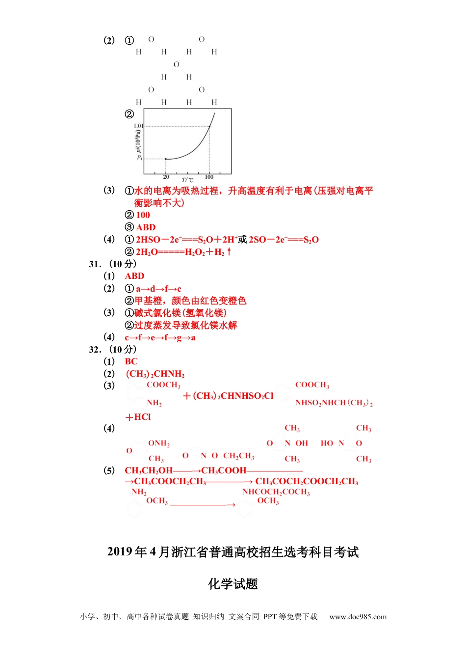小学、初中、高中各种试卷真题知识归纳文案合同PPT等免费下载www.doc985.com化学试题参考答案一、选择题(本大题共25小题,每小题2分,共50分。每个小题列出的四个备选项中只有一个是符合题目要求的,不选、多选、错选均不得分)题号12345678910答案CACDDAABCB题号11121314151617181920答案AADCBDBCDD题号2122232425答案BDCAC二、非选择题(本大题共7小题,共50分)26.(6分)(1)氧化反应羧基(2)+CH2=CHCOOH————→+H2O+CH2=CHCOOH————→+H2O(3)加过量银氨溶液,加热,出现银镜,说明有醛基;用盐酸酸化,过滤,滤液中加入溴水,若溴水褪色,说明有碳碳双键27.(6分)(1)O(2)Cu和NaOH(3)NaCuO22NaCuO2+8HCl===2NaCl+2CuCl+Cl2↑+4H2O28.(4分)(1)滴液漏斗(分液漏斗)液封,防止空气进入装置4(2)在装置2、3之间添加控制开关(3)装置4内的空气没有排尽29.(4分)n(H2)=0.03mol,设X中羟基和羧基的总数为m个(m≥2)则n(X)=(0.03×2)/m=0.06/mmol,M(X)=2.04m/0.06=34mg·mol−1m=4,M(X)=136g·mol−1,含有3个羟基和1个羧基,相对分子质量为136。说明:1.文档中可逆符号均使用ZBFH字体,显示异常请下载字体或对应PDF。2.制图使用ChemDraw和MSVisio。30.(10分)(1)C小学、初中、高中各种试卷真题知识归纳文案合同PPT等免费下载www.doc985.com(2)①②(3)①水的电离为吸热过裎,升高温度有利于电离(压强对电离平衡影响不大)②100③ABD(4)①2HSO-2e−===S2O+2H+或2SO-2e−===S2O②2H2O=====H2O2+H2↑31.(10分)(1)ABD(2)①a→d→f→c②甲基橙,颜色由红色变橙色(3)①碱式氯化镁(氢氧化镁)②过度蒸发导致氯化镁水解(4)c→f→e→f→g→a32.(10分)(1)BC(2)(CH3)2CHNH2(3)+(CH3)2CHNHSO2Cl+HCl(4)(5)CH3CH2OH——→CH3COOH——————→CH3COOCH2CH3————→CH3COCH2COOCH2CH3——————→2019年4月浙江省普通高校招生选考科目考试化学试题小学、初中、高中各种试卷真题知识归纳文案合同PPT等免费下载www.doc985.com可能用到的相对原子质量:H1C12N14O16Na23Mg24S32Cl35.5Ca40Fe56Cu64Ba137选择题部分一、选择题(本大题共25小题,每小题2分,共50分。每个小题列出的四个备选项中只有一个是符合题目要求的,不选、多选、错选均不得分)1.下列属于碱的是A.C2H5OHB.Na2CO3C.Ca(OH)2D.Cu2(OH)2CO3【答案】C【解析】【详解】A.C2H5OH是有机物,属于醇类,A不合题意;B.Na2CO3属于无机盐,B不合题意;C.Ca(OH)2是二元强碱,C符合题意;D.Cu2(OH)2CO3是碱式盐,D不合题意。故答案选C。2.下列属于强电解质的是A.硫酸钡B.食盐水C.二氧化硅D.醋酸【答案】A【解析】【详解】按强电解质的定义可知,强电解质指在水中完全电离的电解质,包含强酸、强碱、大部分盐等。所以对四个选项进行物质分类考查:A.可知硫酸钡是强电解质,A项正确;B.食盐水为混合物,不在强电解质的概念内,B项错误;C.二氧化硅是非电解质,C项错误;D.醋酸在水中不完全电离,为弱电解质,D项错误。故答案选A。3.下列图示表示过滤的是A.B.C.D.【答案】C【解析】小学、初中、高中各种试卷真题知识归纳文案合同PPT等免费下载www.doc985.com【详解】A.该操作是分液,A不合题意;B.该操作是配制一定物质的量浓度溶液中定容步骤,B不合题意;C.该操作是过滤,C符合题意;D.该操作是配制一定物质的量浓度溶液中转移溶液步骤,D不合题意。故答案选C。4.下列属于置换反应的是A.4NH3+5O24NO+6H2OB.2Na2SO3+O22Na2SO4C.2Na2O2+2CO22Na2CO3+O2D.2KI+Cl22KCl+I2【答案】D【解析】【详解】置换反应是指一个单质和一个化合物反应生成另一个单质和化合物,属于氧化还原反应,前者在后者的概念范围内;A.该反应属于氧化还原反应,但不是置换反应,A不合题意;B.该反应是化合反应,B不合题意;C.该反应属于氧化还原反应,但不是置换反应,C不合题意;D.该反应符合置换反应定义,属于非金属单质之间的置换反应,活泼性强的非金属单质置换出活泼性较弱的非金属单质,D符合题意。故答案选D。5.下列溶液呈碱性的是A.NH4NO3B.(NH4)2SO4C.KClD.K2CO3【答案】D【解析】【分析】盐类水解是指弱酸阴离子或弱碱阳离子发...