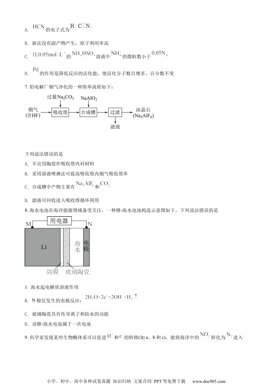 小学、初中、高中各种试卷真题知识归纳文案合同PPT等免费下载www.doc985.com湖南省2022年普通高中学业水平选择性考试化学注意事项:1.答卷前,考生务必将自己的姓名、准考证号填写在本试卷和答题卡上。2.回答选择题时,选出每小题答案后,用铅笔把答题卡上对应题目的答案标号涂黑。如需改动,用橡皮擦干净后,再选涂其他答案标号。回答非选择题时,将答案写在答题卡上,写在本试卷上无效。3.考试结束后,将本试卷和答题卡一并交回。可能用到的相对原子质量:H1C12N14O16S32Cl35.5K39Fe56Se79Ba137一、选择题:本题共10小题,每小题3分,共30分。在每小题给出的四个选项中,只有一项是符合题目要求的。1.化学促进了科技进步和社会发展,下列叙述中没有涉及化学变化的是A.《神农本草经》中记载的“石胆能化铁为铜”B.利用“侯氏联合制碱法”制备纯碱C.科学家成功将转化为淀粉或葡萄糖D.北京冬奥会场馆使用跨临界直冷制冰2.下列说法错误的是A.氢键,离子键和共价键都属于化学键B.化学家门捷列夫编制了第一张元素周期表C.药剂师和营养师必须具备化学相关专业知识D.石灰石是制造玻璃和水泥的主要原料之一3.聚乳酸是一种新型的生物可降解高分子材料,其合成路线如下:下列说法错误的是小学、初中、高中各种试卷真题知识归纳文案合同PPT等免费下载www.doc985.comA.B.聚乳酸分子中含有两种官能团C.乳酸与足量的反应生成D.两分子乳酸反应能够生成含六元环的分子4.化学实验操作是进行科学实验的基础。下列操作符合规范的是A.碱式滴定管排气泡B.溶液加热C.试剂存放D.溶液滴加A.AB.BC.CD.D5.科学家合成了一种新的共价化合物(结构如图所示),X、Y、Z、W为原子序数依次增大的短周期元素,W的原子序数等于X与Y的原子序数之和。下列说法错误的是A.原子半径:B.非金属性:C.Z的单质具有较强的还原性D.原子序数为82的元素与W位于同一主族6.甲基丙烯酸甲酯是合成有机玻璃的单体。旧法合成的反应:新法合成的反应:下列说法错误的是(阿伏加德罗常数的值为)小学、初中、高中各种试卷真题知识归纳文案合同PPT等免费下载www.doc985.comA.的电子式为B.新法没有副产物产生,原子利用率高C.的溶液中的微粒数小于D.的作用是降低反应的活化能,使活化分子数目增多,百分数不变7.铝电解厂烟气净化的一种简单流程如下:下列说法错误的是A.不宜用陶瓷作吸收塔内衬材料B.采用溶液喷淋法可提高吸收塔内烟气吸收效率C.合成槽中产物主要有和D.滤液可回收进入吸收塔循环利用8.海水电池在海洋能源领域备受关注,一种锂-海水电池构造示意图如下。下列说法错误的是A.海水起电解质溶液作用B.N极仅发生的电极反应:C.玻璃陶瓷具有传导离子和防水的功能D.该锂-海水电池属于一次电池9.科学家发现某些生物酶体系可以促进和的转移(如a、b和c),能将海洋中的转化为进入小学、初中、高中各种试卷真题知识归纳文案合同PPT等免费下载www.doc985.com大气层,反应过程如图所示。下列说法正确的是A.过程Ⅰ中发生氧化反应B.a和b中转移的数目相等C.过程Ⅱ中参与反应的D.过程Ⅰ→Ⅲ的总反应为10.室温时,用的标准溶液滴定浓度相等的、和混合溶液,通过电位滴定法获得与的关系曲线如图所示(忽略沉淀对离子的吸附作用。若溶液中离子浓度小于时,认为该离子沉淀完全。,,)。下列说法正确的是A.a点:有白色沉淀生成小学、初中、高中各种试卷真题知识归纳文案合同PPT等免费下载www.doc985.comB.原溶液中的浓度为C.当沉淀完全时,已经有部分沉淀D.b点:二、选择题,本题共4小题,每小题4分,共16分。在每小题给出的四个选项中,有一个或两个选项符合题目要求。全部选对的得4分,选对但不全的得2分,有选错的得0分。11.下列离子方程式正确的是A.通入冷的溶液:B.用醋酸和淀粉溶液检验加碘盐中的:C.溶液中加入产生沉淀:D.溶液与少量的溶液混合:12.反应物(S)转化为产物(P或P·Z)的能量与反应进程的关系如下图所示:下列有关四种不同反应进程的说法正确的是A.进程Ⅰ是放热反应B.平衡时P的产率:Ⅱ>ⅠC.生成P的速率:Ⅲ>ⅡD.进程Ⅳ中,Z没有催化作用13.为探究的性质,进行了如下实验(和溶液浓度均为)。实验操作与现象①在水中滴加2滴溶液,呈棕黄色...