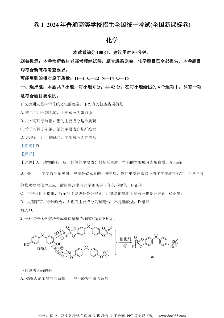 小学、初中、高中各种试卷真题知识归纳文案合同PPT等免费下载www.doc985.com卷12024年普通高等学校招生全国统一考试(全国新课标卷)化学本试卷满分100分,建议用时50分钟。刷卷提示:本卷为新教材老高考理综试卷,题号遵循原卷,化学题目已全部提供。本卷题目均符合新高考考查要求。可能用到的相对原子质量:H—1C—12N—14O—16一、选择题:本题共7小题,每小题6分,共42分。在每小题给出的4个选项中,只有一项是符合题目要求的。1.文房四宝是中华传统文化的瑰宝。下列有关叙述错误的是A.羊毛可用于制毛笔,主要成分为蛋白质B.松木可用于制墨,墨的主要成分是单质碳C.竹子可用于造纸,纸的主要成分是纤维素D.大理石可用于制砚台,主要成分为硅酸盐【答案】D【解析】【详解】A.动物的毛、皮、角等的主要成分都是蛋白质,羊毛的主要成分为蛋白质,A正确;B.墨的主要成分是炭黑,炭黑是碳元素的一种单质,碳的单质在常温下的化学性质很稳定,不易与其他物质发生化学反应,故用墨汁书写的字画历经千年仍不褪色,B正确;C.竹子可用于造纸,竹子的主要成分是纤维素,用其造的纸的主要成分也是纤维素,C正确;D.大理石可用于制砚台,大理石主要成分为碳酸钙,不是硅酸盐,D错误;故选D。2.一种点击化学方法合成聚硫酸酯(W)的路线如下所示:下列说法正确的是A.双酚A是苯酚的同系物,可与甲醛发生聚合反应小学、初中、高中各种试卷真题知识归纳文案合同PPT等免费下载www.doc985.comB.催化聚合也可生成WC.生成W的反应③为缩聚反应,同时生成D.在碱性条件下,W比聚苯乙烯更难降解【答案】B【解析】【详解】A.同系物之间的官能团的种类与数目均相同,双酚A有2个羟基,故其不是苯酚的同系物,A不正确;B.题干中两种有机物之间通过缩聚反应生成W,根据题干中的反应机理可知,也可以通过缩聚反应生成W,B正确;C.生成W的反应③为缩聚反应,同时生成,C不正确;D.W为聚硫酸酯,酯类物质在碱性条件下可以发生水解反应,因此,在碱性条件下,W比聚苯乙烯易降解,D不正确;综上所述,本题选B。3.实验室中利用下图装置验证铁与水蒸气反应。下列说法错误的是A.反应为B.酒精灯移至湿棉花下方实验效果更好C.用木柴点燃肥皂泡检验生成的氢气D.使用硬质玻璃试管盛装还原铁粉【答案】B小学、初中、高中各种试卷真题知识归纳文案合同PPT等免费下载www.doc985.com【解析】【详解】A.铁和水蒸气在高温下发生反应生成和,该反应的化学方程式为,A正确;B.酒精灯放在铁粉下方加热可以产生高温,且不影响水的蒸发,若移至湿棉花下方则难以产生高温,则实验效果不好,B错误;C.用木柴点燃肥皂泡,若产生尖锐的爆鸣声,则可检验生成的气体为氢气,C正确;D.由于该实验中的反应要在高温下发生,因此要使用硬质玻璃试管盛装还原铁粉,D正确;故选B。4.对于下列过程中发生的化学反应,相应离子方程式正确的是A.试管壁上的银镜用稀硝酸清洗:B.工业废水中的用去除:C.海水提溴过程中将溴吹入吸收塔:D.用草酸标准溶液测定高锰酸钾溶液的浓度:【答案】C【解析】【详解】A.试管壁上的银镜用稀硝酸清洗,银溶于稀硝酸生成硝酸银和一氧化氮气体,该反应的离子方程式为,A不正确;B.由于的溶解度远远小于,因此,工业废水中的用去除,该反应的离子方程式为,B不正确;C.海水提溴过程中将溴吹入吸收塔,在水溶液中将还原为,该反应的离子方程式为,C正确;小学、初中、高中各种试卷真题知识归纳文案合同PPT等免费下载www.doc985.comD.用草酸标准溶液测定高锰酸钾溶液的浓度,被氧化为,属于弱酸,该反应的离子方程式为,D不正确;综上所述,本题选C。5.我国科学家最近研究的一种无机盐纳米药物具有高效的细胞内亚铁离子捕获和抗氧化能力。W、X、Y、Z的原子序数依次增加,且W、X、Y属于不同族的短周期元素。W的外层电子数是其内层电子数的2倍,X和Y的第一电离能都比左右相邻元素的高。Z的M层未成对电子数为4。下列叙述错误的是A.W、X、Y、Z四种元素的单质中Z的熔点最高B.在X的简单氢化物中X原子轨道杂化类型为C.Y的氢氧化物难溶于NaCl溶液,可以溶于溶液D.中提供电子对与形成配位键【答案】A【解析】【分析】W...