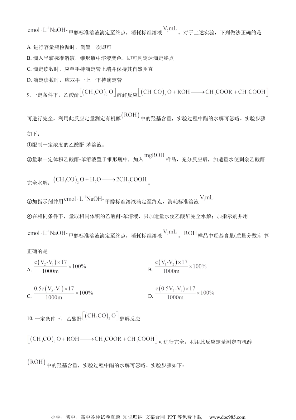 小学、初中、高中各种试卷真题知识归纳文案合同PPT等免费下载www.doc985.com山东省2023年普通高中学业水平等级考试化学可能用到的相对原子质量:H-1C-12N-14O-16F-19Si-28S-32C1-35.5K-39Cu-64一、选择题:本题共10小题,每小题2分,共20分。每小题只有一个选项符合题目要求。1.下列之物具有典型的齐鲁文化特色,据其主要化学成分不能与其他三种归为一类的是A.泰山墨玉B.龙山黑陶C.齐国刀币D.淄博琉璃2.实验室中使用盐酸、硫酸和硝酸时,对应关系错误的是A.稀盐酸:配制溶液B.稀硫酸:蔗糖和淀粉的水解C.稀硝酸:清洗附有银镜的试管D.浓硫酸和浓硝酸的混合溶液:苯的磺化3.下列分子属于极性分子的是A.B.C.D.4.实验室安全至关重要,下列实验室事故处理方法错误的是A.眼睛溅进酸液,先用大量水冲洗,再用饱和碳酸钠溶液冲洗B.皮肤溅上碱液,先用大量水冲洗,再用的硼酸溶液冲洗C.电器起火,先切断电源,再用二氧化碳灭火器灭火D.活泼金属燃烧起火,用灭火毯(石棉布)灭火5.石墨与F2在450℃反应,石墨层间插入F得到层状结构化合物(CF)x,该物质仍具润滑性,其单层局部结构如图所示。下列关于该化合物的说法正确的是A.与石墨相比,(CF)x导电性增强B.与石墨相比,(CF)x抗氧化性增强小学、初中、高中各种试卷真题知识归纳文案合同PPT等免费下载www.doc985.comC.(CF)x中的键长比短D.1mol(CF)x中含有2xmol共价单键6.鉴别浓度均为的、三种溶液,仅用下列一种方法不可行的是A.测定溶液B.滴加酚酞试剂C.滴加溶液D.滴加饱和溶液7.抗生素克拉维酸的结构简式如图所示,下列关于克拉维酸的说法错误的是A.存在顺反异构B.含有5种官能团C.可形成分子内氢键和分子间氢键D.1mol该物质最多可与1molNaOH反应8.一定条件下,乙酸酐醇解反应可进行完全,利用此反应定量测定有机醇中的羟基含量,实验过程中酯的水解可忽略。实验步骤如下:①配制一定浓度的乙酸酐-苯溶液。②量取一定体积乙酸酐-苯溶液置于锥形瓶中,加入样品,充分反应后,加适量水使剩余乙酸酐完全水解:。③加指示剂并用甲醇标准溶液滴定至终点,消耗标准溶液。④在相同条件下,量取相同体积的乙酸酐-苯溶液,只加适量水使乙酸酐完全水解;加指示剂并用小学、初中、高中各种试卷真题知识归纳文案合同PPT等免费下载www.doc985.com甲醇标准溶液滴定至终点,消耗标准溶液。对于上述实验,下列做法正确的是A.进行容量瓶检漏时,倒置一次即可B.滴入半滴标准溶液,锥形瓶中溶液变色,即可判定达滴定终点C.滴定读数时,应单手持滴定管上端并保持其自然垂直D.滴定读数时,应双手一上一下持滴定管9.一定条件下,乙酸酐醇解反应可进行完全,利用此反应定量测定有机醇中的羟基含量,实验过程中酯的水解可忽略。实验步骤如下:①配制一定浓度的乙酸酐-苯溶液。②量取一定体积乙酸酐-苯溶液置于锥形瓶中,加入样品,充分反应后,加适量水使剩余乙酸酐完全水解:。③加指示剂并用甲醇标准溶液滴定至终点,消耗标准溶液。④在相同条件下,量取相同体积的乙酸酐-苯溶液,只加适量水使乙酸酐完全水解;加指示剂并用甲醇标准溶液滴定至终点,消耗标准溶液。样品中羟基含量(质量分数)计算正确的是A.B.C.D.10.一定条件下,乙酸酐醇解反应可进行完全,利用此反应定量测定有机醇中的羟基含量,实验过程中酯的水解可忽略。实验步骤如下:小学、初中、高中各种试卷真题知识归纳文案合同PPT等免费下载www.doc985.com①配制一定浓度的乙酸酐-苯溶液。②量取一定体积乙酸酐-苯溶液置于锥形瓶中,加入样品,充分反应后,加适量水使剩余乙酸酐完全水解:。③加指示剂并用甲醇标准溶液滴定至终点,消耗标准溶液。④在相同条件下,量取相同体积的乙酸酐-苯溶液,只加适量水使乙酸酐完全水解;加指示剂并用-甲醇标准溶液滴定至终点,消耗标准溶液。根据上述实验原理,下列说法正确的是A.可以用乙酸代替乙酸酐进行上述实验B.若因甲醇挥发造成标准溶液浓度发生变化,将导致测定结果偏小C.步骤③滴定时,不慎将锥形瓶内溶液溅出,将导致测定结果偏小D.步骤④中,若加水量不足,将导致测定结果偏大二、选择题:本题共5小题,每小题4分,共20分。每小题有一个或两个选项符合题目要...