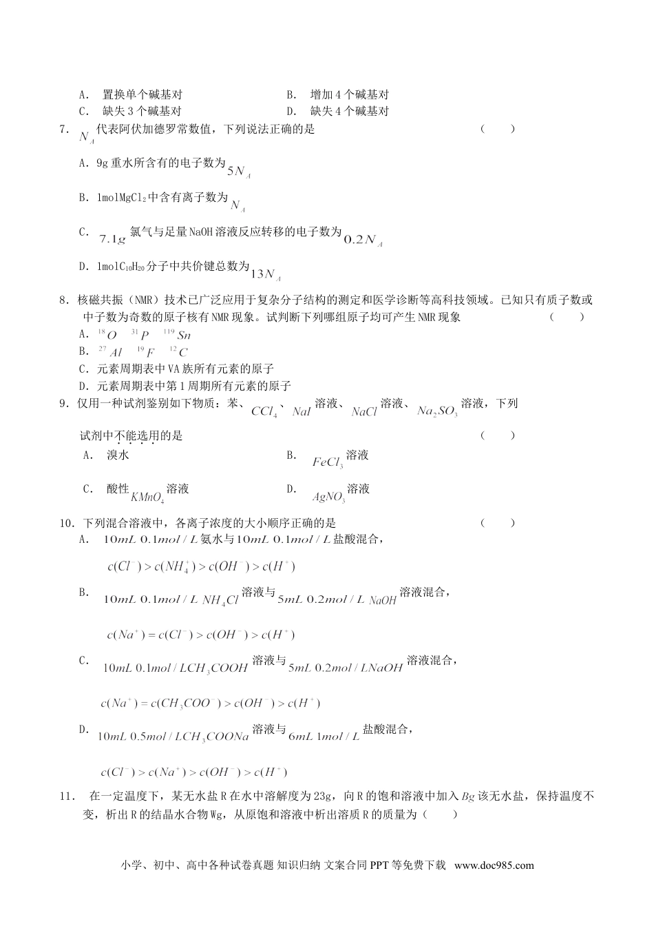 2004年天津高考理科综合真题及答案本试卷分第I卷(选择题)和第II卷两部分,共300分,考试用时150分钟。第I卷(选择题共21题每题6分共126分)在下列各题的四个选项中,只有一个选项是最符合题目要求的。以下数据可供解题时参考:相对原子质量:H1C12N14O16Cl35.5Cu641.下列技术依据DNA分子杂交原理的是()A.②③B.①③C.③④D.①④①用DNA分子探针诊断疾病②B淋巴细胞与骨髓瘤细胞的杂交③快速灵敏地检测饮用水中病毒的含量④目的基因与运载体结合形成重组DNA分子2.粗糙脉孢菌的单倍体细胞中具有7条染色体。两个不同类型的粗糙脉孢菌A和a融合后成为二倍体,随即发生典型的减数分裂,紧接着又进行一次有丝分裂。此过程最终形成的子细胞数及每个子细胞中的染色体数分别为()A.8个、7条B.8个、14条C.4个、7条D.4个、14条3.某个春季低温潮湿、夏季高温干旱的地区生长着一种春、夏季叶型不同的植物,其叶型数据如下表。试推断()A.甲型叶生长在春季,利于光合作用B.乙型叶生长在春季,利于光合作用C.甲型叶生长在夏季,降低蒸腾作用D.乙型叶生长在夏季,增强蒸腾作用项目甲型叶乙型叶表面积()292144体积()6463表皮厚度()14244.风湿性心脏病、系统性红斑狼疮等一类疾病是()A.病原体感染机体而引发的疾病,有传染性B.机体免疫功能不足或缺乏而引发的疾病、无传染性C.人体免疫系统对自身的组织和器官造成损伤而引发的疾病D.已免疫的机体再次接受相同物质的刺激而引发的过敏反应5.关于下丘脑功能的叙述,正确的是()A.①②B.②③C.②④D.①③①可参与血糖平衡的调节②有调节躯体运动的高级中枢③可合成和分泌促甲状腺激素④垂体通过下丘脑控制性腺的生长发育6.原核生物中某一基因的编码区起始端插入了一个碱基对。在插入位点的附近,再发生下列哪种情况有可能对其编码的蛋白质结构影响最小()小学、初中、高中各种试卷真题知识归纳文案合同PPT等免费下载www.doc985.comA.置换单个碱基对B.增加4个碱基对C.缺失3个碱基对D.缺失4个碱基对7.代表阿伏加德罗常数值,下列说法正确的是()A.9g重水所含有的电子数为B.1molMgCl2中含有离子数为C.氯气与足量NaOH溶液反应转移的电子数为D.1molC10H20分子中共价键总数为8.核磁共振(NMR)技术已广泛应用于复杂分子结构的测定和医学诊断等高科技领域。已知只有质子数或中子数为奇数的原子核有NMR现象。试判断下列哪组原子均可产生NMR现象()A.B.C.元素周期表中VA族所有元素的原子D.元素周期表中第1周期所有元素的原子9.仅用一种试剂鉴别如下物质:苯、、溶液、溶液、溶液,下列试剂中不能选用的是()A.溴水B.溶液C.酸性溶液D.溶液10.下列混合溶液中,各离子浓度的大小顺序正确的是()A.氨水与盐酸混合,B.溶液与溶液混合,C.溶液与溶液混合,D.溶液与盐酸混合,11.在一定温度下,某无水盐R在水中溶解度为23g,向R的饱和溶液中加入该无水盐,保持温度不变,析出R的结晶水合物Wg,从原饱和溶液中析出溶质R的质量为()小学、初中、高中各种试卷真题知识归纳文案合同PPT等免费下载www.doc985.comA.B.C.D.12.下图为氢氧燃料电池原理示意图,按照此图的提示,下列叙述不正确的是()A.a电极是负极B.b电极的电极反应为:C.氢氧燃料电池是一种具有应用前景的绿色电源D.氢氧燃料电池是一种不需要将还原剂和氧化剂全部储藏在电池内的新型发电装置13.一定条件下,向一带活塞的密闭容器中充入2molSO2和1molO2,发生下列反应:2SO2(g)+O2(g)2SO3(g)达到平衡后改变下述条件,SO3气体平衡浓度不改变的是()A.保持温度和容器体积不变,充入1molSO2(g)B.保持温度和容器内压强不变,充入1molSO3(g)C.保持温度和容器内压强不变,充入1molO2(g)D.保持温度和容器内压强不变,充入1molAr(g)14.在静电场中,将一电子从A点移到B点,电场力做了正功,则A.电场强度的方向一定是由A点指向B点B.电场强度的方向一定是由B点指向A点C.电子在A点的电势能一定比在B点高D.电子在B点的电势能一定比在A点高15.下列说法正确的是()A.热量不能由低温物体传递到高温物体B.外界对物体做功,物体的内...