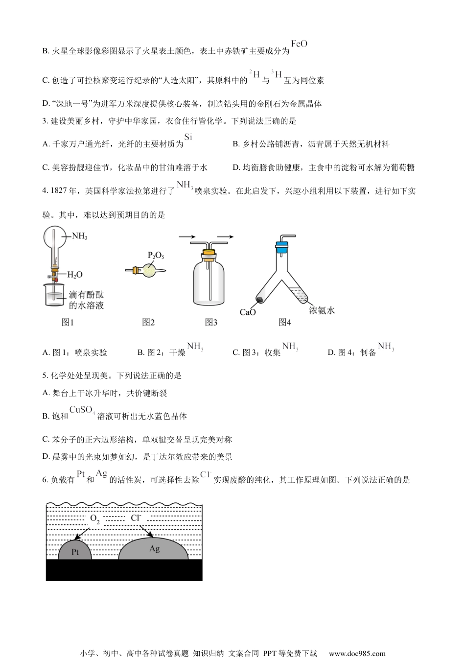 小学、初中、高中各种试卷真题知识归纳文案合同PPT等免费下载www.doc985.com2023年广东省普通高中学业水平选择性考试化学满分100分,考试用时75分钟注意事项:1.答卷前,考生务必用黑色字迹钢笔或签字笔将自己的姓名、考生号、考场号和座位号填写在答题卡上。用2B铅笔将试卷类型(B)填涂在答题卡相应位置上。将条形码横贴在答题卡右上角“条形码粘贴处”。2.作答选择题时,选出每小题答案后,用2B铅笔把答题卡上对应题目选项的答案信息点涂黑:如需改动,用橡皮擦干净后,再选涂其他答案,答案不能答在试卷上。3.非选择题必须用黑色字迹钢笔或签字笔作答,答案必须写在答题卡各题目指定区域内相应位置上:如需改动,先划掉原来的答案,然后再写上新的答案,不准使用铅笔和涂改液。不按以上要求作答的答案无效。4.考生必须保持答题卡的整洁。考试结束后,将试卷和答题卡一并交回。可能用到的相对原子质量:H-1C-12N-14O-16S-32Cl-35.5Fe-56Cu-64Zn-65一、选择题:本题共16小题,共44分。第1~10小题,每小题2分;第11~16小题,每小题4分。在每小题给出的四个选项中,只有一项是符合题目要求的。1.“高山流水觅知音”。下列中国古乐器中,主要由硅酸盐材料制成的是A.九霄环佩木古琴B.裴李岗文化骨笛C.商朝后期陶埙D.曾侯乙青铜编钟A.AB.BC.CD.D2.科教兴国,“可上九天揽月,可下五洋捉鳖”。下列说法正确的是A.“天舟六号”为中国空间站送去推进剂气,是第族元素小学、初中、高中各种试卷真题知识归纳文案合同PPT等免费下载www.doc985.comB.火星全球影像彩图显示了火星表土颜色,表土中赤铁矿主要成分为C.创造了可控核聚变运行纪录的“人造太阳”,其原料中的与互为同位素D.“深地一号”为进军万米深度提供核心装备,制造钻头用的金刚石为金属晶体3.建设美丽乡村,守护中华家园,衣食住行皆化学。下列说法正确的是A.千家万户通光纤,光纤的主要材质为B.乡村公路铺沥青,沥青属于天然无机材料C.美容扮靓迎佳节,化妆品中的甘油难溶于水D.均衡膳食助健康,主食中的淀粉可水解为葡萄糖4.1827年,英国科学家法拉第进行了喷泉实验。在此启发下,兴趣小组利用以下装置,进行如下实验。其中,难以达到预期目的的是A.图1:喷泉实验B.图2:干燥C.图3:收集D.图4:制备5.化学处处呈现美。下列说法正确的是A.舞台上干冰升华时,共价键断裂B.饱和溶液可析出无水蓝色晶体C.苯分子的正六边形结构,单双键交替呈现完美对称D.晨雾中的光束如梦如幻,是丁达尔效应带来的美景6.负载有和的活性炭,可选择性去除实现废酸的纯化,其工作原理如图。下列说法正确的是小学、初中、高中各种试卷真题知识归纳文案合同PPT等免费下载www.doc985.comA.作原电池正极B.电子由经活性炭流向C.表面发生的电极反应:D.每消耗标准状况下的,最多去除7.劳动有利于“知行合一”。下列劳动项目与所述的化学知识没有关联的是选项劳动项目化学知识A帮厨活动:帮食堂师傅煎鸡蛋准备午餐加热使蛋白质变性B环保行动:宣传使用聚乳酸制造的包装材料聚乳酸在自然界可生物降解C家务劳动:擦干已洗净的铁锅,以防生锈铁丝在中燃烧生成D学农活动:利用秸秆、厨余垃圾等生产沼气沼气中含有的可作燃料A.AB.BC.CD.D8.2022年诺贝尔化学奖授予研究“点击化学”的科学家。图所示化合物是“点击化学”研究中的常用分子。关于该化合物,说法不正确的是A.能发生加成反应B.最多能与等物质的量的反应C.能使溴水和酸性溶液褪色D.能与氨基酸和蛋白质中的氨基反应9.按图装置进行实验。将稀硫酸全部加入Ⅰ中的试管,关闭活塞。下列说法正确的是小学、初中、高中各种试卷真题知识归纳文案合同PPT等免费下载www.doc985.comA.Ⅰ中试管内的反应,体现的氧化性B.Ⅱ中品红溶液褪色,体现的还原性C.在Ⅰ和Ⅲ的试管中,都出现了浑浊现象D.撤掉水浴,重做实验,Ⅳ中红色更快褪去10.部分含或含物质的分类与相应化合价关系如图所示。下列推断不合理的是A.可存在c→d→e的转化B.能与反应生成c的物质只有bC.新制的d可用于检验葡萄糖中的醛基D.若b能与反应生成,则b中含共价键11.设为阿伏加德罗常数的值。侯氏制碱法涉及和等物质。下列叙述正确的是A.含有的共价键数...