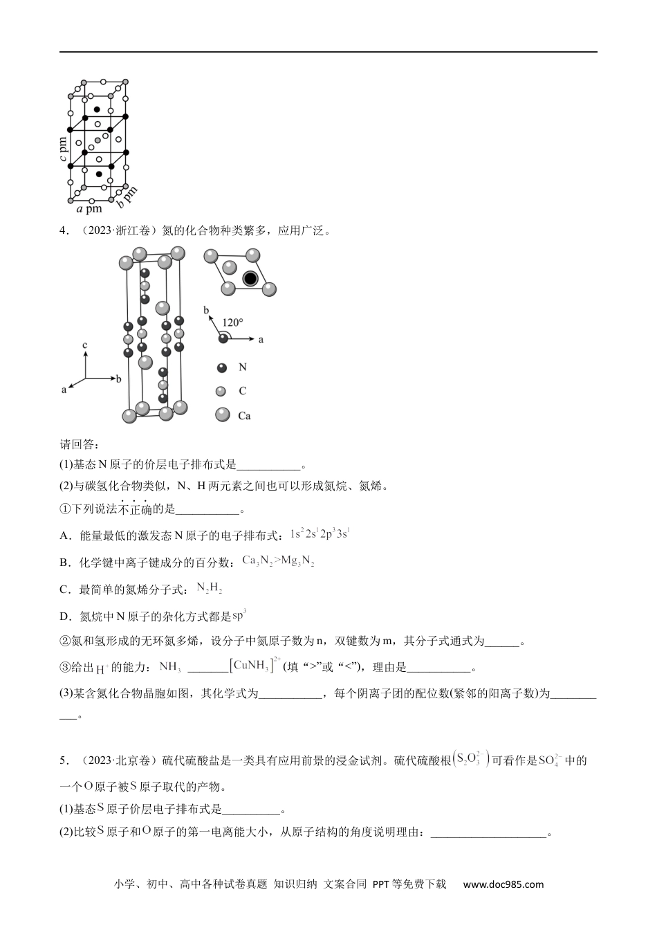 小学、初中、高中各种试卷真题知识归纳文案合同PPT等免费下载www.doc985.com五年(2019-2023)年高考真题分项汇编专题16物质结构与性质综合题〖2023年高考真题〗1.(2023·全国甲卷)将酞菁—钴钛—三氯化铝复合嵌接在碳纳米管上,制得一种高效催化还原二氧化碳的催化剂。回答下列问题:(1)图1所示的几种碳单质,它们互为_______,其中属于原子晶体的是_______,间的作用力是_______。(2)酞菁和钴酞菁的分子结构如图2所示。酞菁分子中所有原子共平面,其中轨道能提供一对电子的原子是_______(填图2酞菁中原子的标号)。钴酞菁分子中,钴离子的化合价为_______,氮原子提供孤对电子与钴离子形成_______键。(3)气态通常以二聚体的形式存在,其空间结构如图3a所示,二聚体中的轨道杂化类型为_______。的熔点为,远高于的,由此可以判断铝氟之间的化学键为_______键。结构属立方晶系,晶胞如图3b所示,的配位数为_______。若晶胞参数为,晶体密度_______(列出计算式,阿伏加德罗常数的值为)。小学、初中、高中各种试卷真题知识归纳文案合同PPT等免费下载www.doc985.com2.(2023·全国乙卷)中国第一辆火星车“祝融号”成功登陆火星。探测发现火星上存在大量橄榄石矿物()。回答下列问题:(1)基态原子的价电子排布式为_______。橄榄石中,各元素电负性大小顺序为_______,铁的化合价为_______。(2)已知一些物质的熔点数据如下表:物质熔点/℃800.7与均为第三周期元素,熔点明显高于,原因是_______。分析同族元素的氯化物、、熔点变化趋势及其原因_______。的空间结构为_______,其中的轨道杂化形式为_______。(3)一种硼镁化合物具有超导性能,晶体结构属于立方晶系,其晶体结构、晶胞沿c轴的投影图如下所示,晶胞中含有_______个。该物质化学式为_______,B-B最近距离为_______。3.(2023·山东卷)卤素可形成许多结构和性质特殊的化合物。回答下列问题:(1)时,与冰反应生成利。常温常压下,为无色气休,固态的晶体类型为_____,水解反应的产物为_____(填化学式)。(2)中心原子为,中心原子为,二者均为形结构,但中存在大键。中原子的轨道杂化方式_____;为键角_____键角(填“>”“<”或“=”)。比较与中键的键长并说明原因_____。(3)一定条件下,和反应生成和化合物。已知属于四方晶系,晶胞结构如图所示(晶胞参数),其中化合价为。上述反应的化学方程式为_____。若阿伏加德罗常数的值为,化合物的密度_____(用含的代数式表示)。小学、初中、高中各种试卷真题知识归纳文案合同PPT等免费下载www.doc985.com4.(2023·浙江卷)氮的化合物种类繁多,应用广泛。请回答:(1)基态N原子的价层电子排布式是___________。(2)与碳氢化合物类似,N、H两元素之间也可以形成氮烷、氮烯。①下列说法不正确的是___________。A.能量最低的激发态N原子的电子排布式:B.化学键中离子键成分的百分数:C.最简单的氮烯分子式:D.氮烷中N原子的杂化方式都是②氮和氢形成的无环氮多烯,设分子中氮原子数为n,双键数为m,其分子式通式为______。③给出的能力:_______(填“>”或“<”),理由是___________。(3)某含氮化合物晶胞如图,其化学式为___________,每个阴离子团的配位数(紧邻的阳离子数)为___________。5.(2023·北京卷)硫代硫酸盐是一类具有应用前景的浸金试剂。硫代硫酸根可看作是中的一个原子被原子取代的产物。(1)基态原子价层电子排布式是__________。(2)比较原子和原子的第一电离能大小,从原子结构的角度说明理由:____________________。小学、初中、高中各种试卷真题知识归纳文案合同PPT等免费下载www.doc985.com(3)的空间结构是__________。(4)同位素示踪实验可证实中两个原子的化学环境不同,实验过程为。过程ⅱ中,断裂的只有硫硫键,若过程ⅰ所用试剂是和,过程ⅱ含硫产物是__________。(5)的晶胞形状为长方体,边长分别为、,结构如图所示。晶胞中的个数为__________。已知的摩尔质量是,阿伏加德罗常数为,该晶体的密度为__________。(6)浸金时,作为配体可提供孤电子对与形成。分别判断中的中心原子和端基原子能否做配位原子并说明理由:____________________。〖2022年...