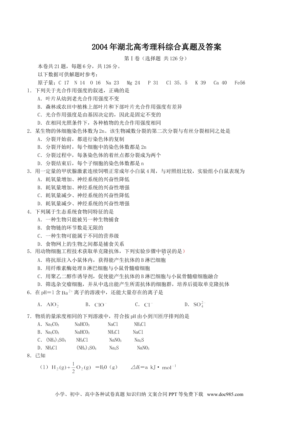 2004年湖北高考理科综合真题及答案第Ⅰ卷(选择题共126分)本卷共21题,每题6分,共126分。以下数据可供解题时参考:原子量;C17N14O16Na23Mg24P31Cl35.5K39Ca40Fe56l.下列关于光合作用强度的叙述,正确的是A.叶片从幼到老光合作用强度不变B.森林或农田中植株上部叶片和下部叶片光合作用强度有差异C.光合作用强度是由基因决定的,因此是固定不变的D.在相同光照条件下,各种植物的光合作用强度相同2.某生物的体细胞染色体数为2n。该生物减数分裂的第二次分裂与有丝分裂相同之处是A.分裂开始前,都进行染色体的复制B.分裂开始时,每个细胞中的染色体数都是2nC.分裂过程中,每条染色体的着丝点都分裂成为两个D.分裂结束后,每个子细胞的染色体数都是n3.用一定量的甲状腺激素连续饲喂正常成年小白鼠4周,与对照组比较,实验组小白鼠表现为A.耗氧量增加、神经系统的兴奋性降低B.耗氧量增加、神经系统的兴奋性增强C.耗氧量减少、神经系统的兴奋性降低D.耗氧量减少、神经系统的兴奋性增强4.下列属于生态系统食物同特征的是A.一种生物只能被另一种生物捕食B.食物链的环节数是无限的C.一种生物可能属于不同的营养级D.食物网上的生物之间都是捕食关系5.用动物细胞工程技术获取单克隆抗体,下列实验步骤中错误的是)A.将抗原注入小鼠体内,获得能产生抗体的B淋巴细胞B.用纤维素酶处理B淋巴细胞与小鼠骨髓瘤细胞C.用聚乙二醇作诱导剂,促使能产生抗体的B淋巴细胞与小鼠骨髓瘤细胞融合D.筛选杂交瘤细胞,并从中选出能产生所需抗体的细胞群,培养后提取单克隆抗体6.在pH=l含离子的溶液中,还能大量存在的离子是A.B.C.D.7.物质的量浓度相同的下列溶液中,符合按pH由小到川匝序排列的是A.Na2CO3NaHCO3NaClNH4ClB.Na2CO3NaHCO3NH4ClNaClC.(NH4)2SO4NH4ClNaNO3Na2SD.NH4Cl(NH4)2SO4Na2SNaNO38.已知(l)=H2O(g)△H1=akJ·小学、初中、高中各种试卷真题知识归纳文案合同PPT等免费下载www.doc985.com(2)=2H2O(g)△H2=bkJ·(3)=H2O(l)△H3=ckJ·(4)=2H2O(l)△H4=dkJ·下列关系式中正确的是A.a<c<0B.b>d>0C.2a=b<0D.2c=d>09.将0.lmol·醋酸溶液加水稀释,下列说法正确的是A.溶液中c(H+)和c()都减小B.溶液中c(H+)增大C.醋酸电离平衡向左移动D.溶液的pH增大10.下列叙述正确的是A.同温同压下,相同体积的物质,它们的物质的量必相等B.任何条件下,等物质的量的乙烯和一氧化碳所含的分子数必相等C.1L一氧化碳气体一定比1L氧气的质量小D.等体积、等物质的量浓度的强酸中所含的H+数一定相等11.若1mol某气态烃CxHy完全燃烧,需用3molO2,则A.x=2,y=2B.x=2,y=4C.x=3,y=6D.2=3,y=812.下列分子中,所有原子不可能共处在同一平面上的是A.C2H2B.CS2C.NH3D.C6H613.常温下,下列各组物质不能用一种试剂通过化学反应区别的是A.MnO2CuOFeOB.(NH4)2SO4K2SO4NH4ClC.AgNO3KNO3Na2CO3D.Na2CO3NaHCO3K2CO314.现有1200个氢原子被激发到量子数为4的能级上,若这些受激氢原子最后都回到基态,则在此过程中发出的光子总数是多少?假定处在量子数为n的激发态的氢原子跃迁到各较低能级的原子数都是处在该激发态能级上的原子总数的。A.2200B.2000C.1200D.240015.下面是四种与光有关的事实:①用光导纤维传播信号②用透明的标准样板和单色光检查平面的平整度③一束白光通过三棱镜形成彩色光带④水面上的油膜呈现彩色其中,与光的干涉有关的是A.①④B.②④C.①③D.②③16.一定量的气体吸收热量,体积膨胀并对外做功,则此过程的末态与初态相比,A.气体内能一定增加B.气体内能一定减小C.气体内能一定不变D.气体内能是增是减不能确定17.如图,一简谐横波在x轴上传播,轴上a、b两点相距12m。t=0时a点为波峰,b点为波谷;t=0.5s时,a点为波谷,b点为波峰。则下列判断中正确的是小学、初中、高中各种试卷真题知识归纳文案合同PPT等免费下载www.doc985.comA.波一定沿x轴正方向传播B.波长可能是8mC.周期可能是0.5sD.波速一定是24m/s18.如图所示,四个完全相同的弹簧都处于水平位置,它们的右端受...