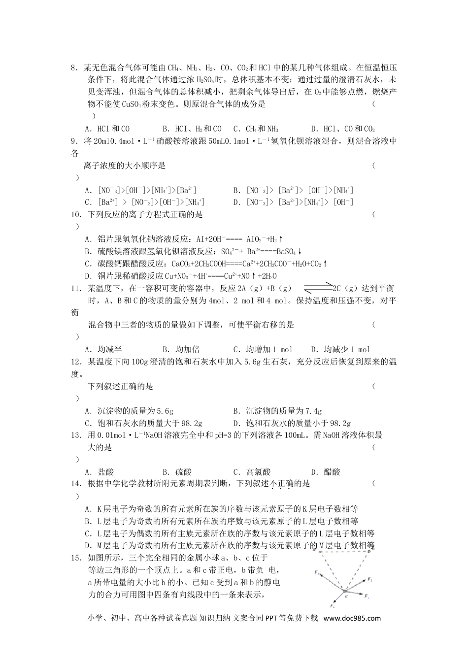 2003年四川高考理综真题及答案1.水后萌发,(丁)浸水萌发后煮着冷却,消毒。然后分别放入4个保温瓶中。一段时间后,种子堆内温度最高的是()A.甲B.乙C.丙D.丁2.植物叶片从幼到老的整个生命活动过程中()A.有机物输出也输入,矿质元素只输入B.有机物只输出,矿质元素只输入C.有机物只输出,矿质元素输入也输出D.有机物与矿质元素都既输入,又输出3.下列关于叶绿素合成和功能的叙述。错误的是()A.光是叶绿素合成的必要条件B.低温抑制叶绿素的合成C.矿质元素影响叶绿素的合成D.提取的叶绿素溶液,给予适宜的温度、光照和CO2,可进行光合作用4.一只成年雄狗仍然保持幼年的体态,且精神萎靡、反应迟钝、行动呆笨,无求偶行为,其原因是()A.睾丸发育不全B.甲状腺功能低下C.生长激素分泌不足D.生长激素分泌不足、睾丸发育不全5.据图判断,下列叙述不符合生态学原理的是()A.物质经过了多级利用,实现了良性循环B.每一级生产环节都获得产品,提高了生态经济效益C.由于食物链延长,能量逐级损耗,系统总能量利用效率降低D.由于各级产物都可以利用,减少了废物和污染6.人类探测月球发现,在月球的土壤中含有较丰富的质量数为3的氦,它可以作为未来核聚变的重要原料之一。氦的该种同位素应表示为()A.B.C.D.7.在两个容积相同的容器中,一个盛有HCl气体,另一个盛有H2和Cl2的混合气体。在同温同压下,两容器内的气体一定具有相同的()A.原子数B.密度C.质量D.质子数小学、初中、高中各种试卷真题知识归纳文案合同PPT等免费下载www.doc985.com8.某无色混合气体可能由CH4、NH3、H2、CO、CO2和HCl中的某几种气体组成。在恒温恒压条件下,将此混合气体通过浓H2SO4时,总体积基本不变;通过过量的澄清石灰水,未见变浑浊,但混合气体的总体积减小,把剩余气体导出后,在O2中能够点燃,燃烧产物不能使CuSO4粉末变色。则原混合气体的成份是()A.HCl和COB.HCI、H2和COC.CH4和NH3D.HCl、CO和CO29.将20ml0.4mol·L-1硝酸铵溶液跟50mL0.1mol·L-1氢氧化钡溶液混合,则混合溶液中各离子浓度的大小顺序是()A.[NO-3]>[OH-]>[NH4+]>[Ba2+]B.[NO-3]>[Ba2+]>[OH-]>[NH4+]C.[Ba2+]>[NO-3]>[OH-]>[NH4+]D.[NO-3]>[Ba2+]>[NH4+]>[OH-]10.下列反应的离子方程式正确的是()A.铝片跟氢氧化钠溶液反应:AI+2OH-====AIO2-+H2↑B.硫酸镁溶液跟氢氧化钡溶液反应:SO42-+Ba2+====BaSO4↓C.碳酸钙跟醋酸反应:CaCO3+2CH3COOH====Ca2++2CH3COO-+H2O+CO2↑D.铜片跟稀硝酸反应Cu+NO3-+4H+====Cu2++NO↑+2H2O11.某温度下,在一容积可变的容器中,反应2A(g)+B(g)2C(g)达到平衡时,A、B和C的物质的量分别为4mol、2mol和4mol。保持温度和压强不变,对平衡混合物中三者的物质的量做如下调整,可使平衡右移的是()A.均减半B.均加倍C.均增加1molD.均减少1mol12.某温度下向100g澄清的饱和石灰水中加入5.6g生石灰,充分反应后恢复到原来的温度。下列叙述正确的是()A.沉淀物的质量为5.6gB.沉淀物的质量为7.4gC.饱和石灰水的质量大于98.2gD.饱和石灰水的质量小于98.2g13.用0.01mol·L-1NaOH溶液完全中和pH=3的下列溶液各100mL。需NaOH溶液体积最大的是()A.盐酸B.硫酸C.高氯酸D.醋酸14.根据中学化学教材所附元素周期表判断,下列叙述不正确的是()A.K层电子为奇数的所有元素所在族的序数与该元素原子的K层电子数相等B.L层电子为奇数的所有元素所在族的序数与该元素原子的L层电子数相等C.L层电子为偶数的所有主族元素所在族的序数与该元素原子的L层电子数相等D.M层电子为奇数的所有主族元素所在族的序数与该元素原子的M层电子数相等15.如图所示,三个完全相同的金属小球a、b、c位于等边三角形的一个顶点上。a和c带正电,b带负电,a所带电量的大小比b的小。已知c受到a和b的静电力的合力可用图中四条有向线段中的一条来表示,小学、初中、高中各种试卷真题知识归纳文案合同PPT等免费下载www.doc985.com它应是A.F1B.F2C.F3D.F416.下面列出的是一些核反应方程()A.X质子,Y是中子Z是正电子B.X是正电子、Y是质子、Z是中...