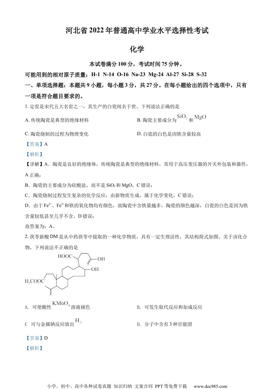小学、初中、高中各种试卷真题知识归纳文案合同PPT等免费下载www.doc985.com河北省2022年普通高中学业水平选择性考试化学本试卷满分100分,考试时间75分钟。可能用到的相对原子质量:H-1N-14O-16Na-23Mg-24Al-27Si-28S-32一、单项选择题:本题共9小题,每小题3分,共27分。在每小题给出的四个选项中,只有一项是符合题目要求的。1.定窑是宋代五大名窑之一,其生产的白瓷闻名于世。下列说法正确的是A.传统陶瓷是典型的绝缘材料B.陶瓷主要成分为和C.陶瓷烧制的过程为物理变化D.白瓷的白色是因铁含量较高【答案】A【解析】【详解】A.陶瓷是良好的绝缘体,传统陶瓷是典型的绝缘材料,常用于高压变压器的开关外包装和器件,A正确;B.陶瓷的主要成分为硅酸盐,而不是SiO2和MgO,C错误;C.陶瓷烧制过程发生复杂的化学反应,由新物质生成,属于化学变化,C错误;D.由于Fe2+、Fe3+和铁的氧化物均有颜色,故陶瓷中含铁量越多,陶瓷的颜色越深,白瓷的白色是因为铁含量较低甚至几乎不含,D错误;故答案为:A。2.茯苓新酸DM是从中药茯苓中提取的一种化学物质,具有一定生理活性,其结构简式如图。关于该化合物,下列说法不正确的是A.可使酸性溶液褪色B.可发生取代反应和加成反应C.可与金属钠反应放出D.分子中含有3种官能团【答案】D【解析】小学、初中、高中各种试卷真题知识归纳文案合同PPT等免费下载www.doc985.com【详解】A.由题干有机物的结构简式可知,分子中含有碳碳双键,故可使酸性高锰酸钾溶液褪色,A正确;B.由题干有机物的结构简式可知,分子中含有碳碳双键,故可发生加成反应,含有羧基和羟基故能发生酯化反应,酯化反应属于取代反应,B正确;C.由题干有机物的结构简式可知,分子中含有羧基和羟基,故能与金属钠反应放出H2,C正确;D.由题干有机物的结构简式可知,分子中含有碳碳双键、羧基、羟基和酯基等四种官能团,D错误;故答案为:D。3.化学是材料科学的基础。下列说法错误的是A.制造5G芯片的氮化铝晶圆属于无机非金属材料B.制造阻燃或防火线缆的橡胶不能由加聚反应合成C.制造特种防护服的芳纶纤维属于有机高分子材料D.可降解聚乳酸塑料的推广应用可减少“白色污染”【答案】B【解析】【详解】A.氮化铝是一种高温结构陶瓷,属于新型的无机非金属材料,A正确;B.天然橡胶的单体为异戊二烯,合成橡胶的单体如顺丁烯等中均含有碳碳双键,通过加聚反应合成制得橡胶,B错误;C.“涤纶”“锦纶”“腈纶”“丙纶”“维纶”“氯纶”“芳纶”等均为合成纤维,属于有机高分子材料,C正确;D.可降解聚乳酸塑料的推广应用,可以减少难以降解塑料的使用,从而减少“白色污染”,D正确;故答案为:B。暂无4-7题,后续如有题目会及时更新4.溶液可作为替代氟利昂的绿色制冷剂。合成工艺流程如下:下列说法错误的是A.还原工序逸出的用溶液吸收,吸收液直接返回还原工序B.除杂工序中产生的滤渣可用煤油进行组分分离C.中和工序中的化学反应为小学、初中、高中各种试卷真题知识归纳文案合同PPT等免费下载www.doc985.comD.参与反应的为1∶1∶1【答案】A【解析】【分析】由流程可知,氢溴酸中含有少量的溴,加入硫化钡将溴还原生成溴化钡和硫,再加入硫酸除杂,得到的滤渣为硫酸钡和硫;加入碳酸锂进行中和,得到的溴化锂溶液经浓缩等操作后得到产品溴化锂。【详解】A.还原工序逸出的Br2用NaOH溶液吸收,吸收液中含有溴化钠和次溴酸钠等物质,若直接返回还原工序,则产品中会有一定量的溴化钠,导致产品的纯度降低,A说法错误;B.除杂工序中产生的滤渣为硫酸钡和硫,硫属于非极性分子形成的分子晶体,而硫酸钡属于离子晶体,根据相似相溶原理可知,硫可溶于煤油,而硫酸钡不溶于煤油,因此可用煤油进行组分分离,B说法正确;C.中和工序中,碳酸锂和氢溴酸发生反应生成溴化锂、二氧化碳和水,该反应的化学方程式为Li2CO3+2HBr=CO2↑+2LiBr+H2O,C说法正确;D.根据电子转化守恒可知,溴和硫化钡反应时物质的量之比为1:1;根据硫酸钡的化学组成及钡元素守恒可知,n(BaS):n(H2SO4)为1:1,因此,参与反应的n(Br2):n(BaS):n(H2SO4)为1:1:1,D说法正确;综上所述,本题选A。暂无9题,后续如...