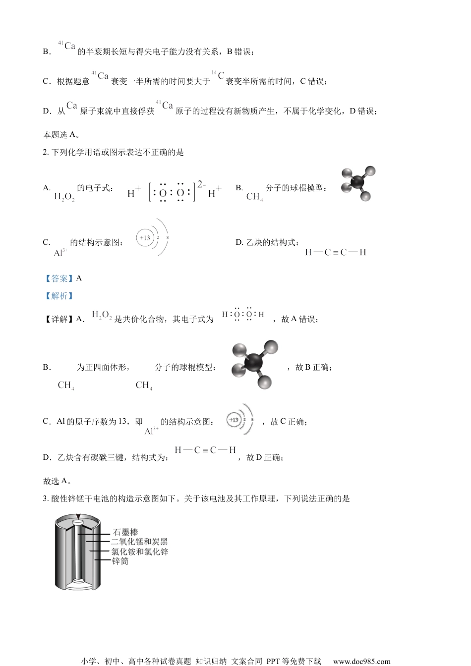 小学、初中、高中各种试卷真题知识归纳文案合同PPT等免费下载www.doc985.com2024年普通高中学业水平等级性考试(北京卷)化学本试卷满分100分,考试时间90分钟。可能用到的相对原子质量:第一部分本部分共14题,每题3分,共42分。在每题列出的四个选项中,选出最符合题目要求的一项。1.我国科研人员利用激光操控方法,从原子束流中直接俘获原子,实现了对同位素的灵敏检测。的半衰期(放射性元素的原子核有半数发生衰变所需的时间)长达10万年,是的17倍,可应用于地球科学与考古学。下列说法正确的是20钙40.08A.的原子核内有21个中子B.的半衰期长,说明难以失去电子C.衰变一半所需的时间小于衰变一半所需的时间D.从原子束流中直接俘获原子的过程属于化学变化【答案】A【解析】【详解】A.的质量数为41,质子数为20,所以中子数为,A正确;小学、初中、高中各种试卷真题知识归纳文案合同PPT等免费下载www.doc985.comB.的半衰期长短与得失电子能力没有关系,B错误;C.根据题意衰变一半所需的时间要大于衰变半所需的时间,C错误;D.从原子束流中直接俘获原子的过程没有新物质产生,不属于化学变化,D错误;本题选A。2.下列化学用语或图示表达不正确的是A.的电子式:B.分子的球棍模型:C.的结构示意图:D.乙炔的结构式:【答案】A【解析】【详解】A.是共价化合物,其电子式为,故A错误;B.为正四面体形,分子的球棍模型:,故B正确;C.Al的原子序数为13,即的结构示意图:,故C正确;D.乙炔含有碳碳三键,结构式为:,故D正确;故选A。3.酸性锌锰干电池的构造示意图如下。关于该电池及其工作原理,下列说法正确的是小学、初中、高中各种试卷真题知识归纳文案合同PPT等免费下载www.doc985.comA.石墨作电池的负极材料B.电池工作时,向负极方向移动C.发生氧化反应D.锌筒发生的电极反应为【答案】D【解析】【详解】A.酸性锌锰干电池,锌筒为负极,石墨电极为正极,故A错误;B.原电池工作时,阳离子向正极(石墨电极)方向移动,故B错误;C.发生得电子的还原反应,故C错误;D.锌筒为负极,负极发生失电子的氧化反应,故D正确;故选D。4.下列说法不正确的是A.葡萄糖氧化生成和的反应是放热反应B.核酸可看作磷酸、戊糖和碱基通过一定方式结合而成的生物大分子C.由氨基乙酸形成的二肽中存在两个氨基和两个羧基D.向饱和的溶液中加入少量鸡蛋清溶液会发生盐析【答案】C【解析】【详解】A.葡萄糖氧化生成CO2和H2O是放热反应,在人体内葡萄糖缓慢氧化成CO2和H2O为人体提供能量,A项正确;B.核酸是一种生物大分子,分析核酸水解的产物可知,核酸是由许多核苷酸单体形成的聚合物,核苷酸进一步水解得到磷酸和核苷,核苷进一步水解得到戊糖和碱基,故核酸可看作磷酸、戊糖和碱基通过一定方式结合而成的生物大分子,B项正确;C.氨基乙酸的结构简式为H2NCH2COOH,形成的二肽的结构简式为H2NCH2CONHCH2COOH,该二肽中含1个氨基、1个羧基和1个肽键,C项错误;D.鸡蛋清溶液为蛋白质溶液,NaCl溶液属于轻金属盐溶液,向饱和NaCl溶液中加入少量鸡蛋清溶液,蛋白质发生盐析,D项正确;答案选C。5.下列方程式与所给事实不相符的是小学、初中、高中各种试卷真题知识归纳文案合同PPT等免费下载www.doc985.comA.海水提溴过程中,用氯气氧化苦卤得到溴单质:B.用绿矾()将酸性工业废水中的转化为C.用溶液能有效除去误食的D.用溶液将水垢中的转化为溶于酸的:【答案】D【解析】【详解】A.氯气氧化苦卤得到溴单质,发生置换反应,离子方程式正确,A正确;B.可以将氧化成,离子方程式正确,B正确;C.结合生成沉淀,可以阻止被人体吸收,离子方程式正确,C正确;D.与反应属于沉淀的转化,不能拆分,正确的离子方程式为CaSO4+=CaCO3+,D错误;本题选D。6.下列实验的对应操作中,不合理的是A.用标准溶液滴定溶液B.稀释浓硫酸小学、初中、高中各种试卷真题知识归纳文案合同PPT等免费下载www.doc985.comC.从提纯后的溶液获得晶体D.配制一定物质的量浓度的溶液A.AB.BC.CD.D【答案】D【解析】【详解】A.用HCl标准溶液滴定NaOH溶液时,眼睛应注视锥形瓶中溶液,以便观察溶液颜色的变化从而判断滴定终点,A项...