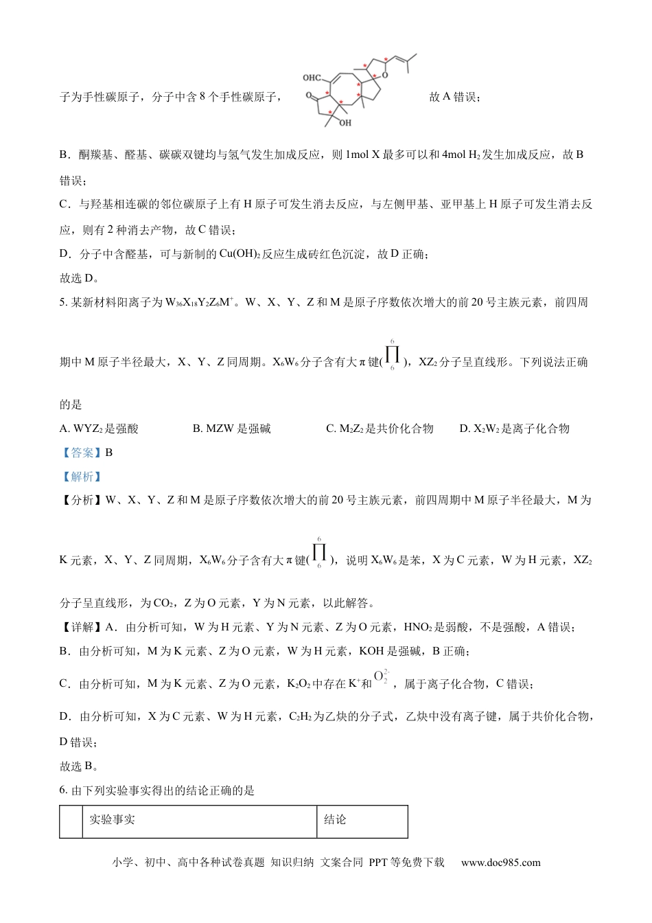 小学、初中、高中各种试卷真题知识归纳文案合同PPT等免费下载www.doc985.com2024年江西省新高考化学试卷一、选择题:本题共14小题,每小题3分,共42分。在每小题给出的四个选项中,只有一项符合题目要求。1.景德镇青花瓷素有“国瓷”的美誉。是以黏土为原料,用含钴、铁的颜料着色,上釉后一次性高温烧制而成的青蓝色彩瓷。下列关于青花瓷说法正确的是A.青蓝色是由于生成了单质钴B.表面的釉属于有机高分子膜C.主要成分为铝硅酸盐D.铁元素的存在形式只有Fe2O3【答案】C【解析】【详解】A.青花瓷上的蓝色花纹是由于使用了含有氧化钴的“青料”绘制而成,与单质钴无直接关系,A错误;B.釉是一种覆盖在陶瓷表面的物质,通常由无机物质组成,如硅酸盐、氧化物等,B错误;C.青花瓷是一种釉面瓷,其材质属于无机非金属材料,主要成分为铝硅酸盐,C正确;D.青花瓷呈现青蓝色,不能确定铁元素的具体存在形式,Fe2O3呈红色,D错误;故选C。2.科学家发现宇宙中存在100多种星际分子。下列关于星际分子说法正确的是A.分子的极性:SiH4>NH3B.键的极性:H—Cl>H—HC.键角:H2O>CH4D.分子中三键的键长:HC≡N>HC≡CH【答案】B【解析】【详解】A.SiH4中四条Si—H键完全相同,均为极性键,但由于SiH4为正四面体结构,故为非极性分子,NH3为三角锥形结构,3条N—H键的极性不能抵消,故为极性分子,故A错误;B.H—H为非极性键,H—Cl为极性键,则键的极性:H—Cl>H—H,故B正确;C.水分子为V形结构,含两对孤对电子,甲烷为正四面体结构,不含孤对电子,孤对电子对成键电子对斥力较大,则键角:H2O<CH4,故C错误;D.原子半径C>N,分子中三键的键长:HC≡N<HC≡CH,故D错误;故选B。3.“稀土之父”徐光宪先生提出了稀土串级萃取理论,其基本操作是利用有机络合剂把稀土离子从水相富集到有机相再进行分离。分离时可用的玻璃装置是小学、初中、高中各种试卷真题知识归纳文案合同PPT等免费下载www.doc985.comA.B.C.D.【答案】C【解析】【分析】利用有机络合剂把稀土离子从水相富集到有机相再进行分离,有机相与水相分层,可分液分离,以此来解答。【详解】A.图为蒸馏,不能分离稀土离子,故A错误;B.图中为过滤,不能分离稀土离子,故B错误;C.图中分液漏斗可萃取、分液分离稀土离子,故C正确;D.图中为抽滤装置,不能分离稀土离子,故D错误;故选C。4.蛇孢菌素(X)是一种具有抗癌活性的天然植物毒素。下列关于X说法正确的是A.含有4种官能团,8个手性碳原子B.1molX最多可以和3molH2发生加成反应C.只有1种消去产物D.可与新制的Cu(OH)2反应生成砖红色沉淀【答案】D【解析】【详解】A.分子中含酮羰基、羟基、醛基、醚键、碳碳双键,共5种官能团,连接4个不同基团的碳原小学、初中、高中各种试卷真题知识归纳文案合同PPT等免费下载www.doc985.com子为手性碳原子,分子中含8个手性碳原子,故A错误;B.酮羰基、醛基、碳碳双键均与氢气发生加成反应,则1molX最多可以和4molH2发生加成反应,故B错误;C.与羟基相连碳的邻位碳原子上有H原子可发生消去反应,与左侧甲基、亚甲基上H原子可发生消去反应,则有2种消去产物,故C错误;D.分子中含醛基,可与新制的Cu(OH)2反应生成砖红色沉淀,故D正确;故选D。5.某新材料阳离子为W36X18Y2Z6M+。W、X、Y、Z和M是原子序数依次增大的前20号主族元素,前四周期中M原子半径最大,X、Y、Z同周期。X6W6分子含有大π键(),XZ2分子呈直线形。下列说法正确的是A.WYZ2是强酸B.MZW是强碱C.M2Z2是共价化合物D.X2W2是离子化合物【答案】B【解析】【分析】W、X、Y、Z和M是原子序数依次增大的前20号主族元素,前四周期中M原子半径最大,M为K元素,X、Y、Z同周期,X6W6分子含有大π键(),说明X6W6是苯,X为C元素,W为H元素,XZ2分子呈直线形,为CO2,Z为O元素,Y为N元素,以此解答。【详解】A.由分析可知,W为H元素、Y为N元素、Z为O元素,HNO2是弱酸,不是强酸,A错误;B.由分析可知,M为K元素、Z为O元素,W为H元素,KOH是强碱,B正确;C.由分析可知,M为K元素、Z为O元素,K2O2中存在K+和,属于离子化合物,C错误;D.由分析可知,X为C元素、W为H元素,C2H2为乙炔的分...