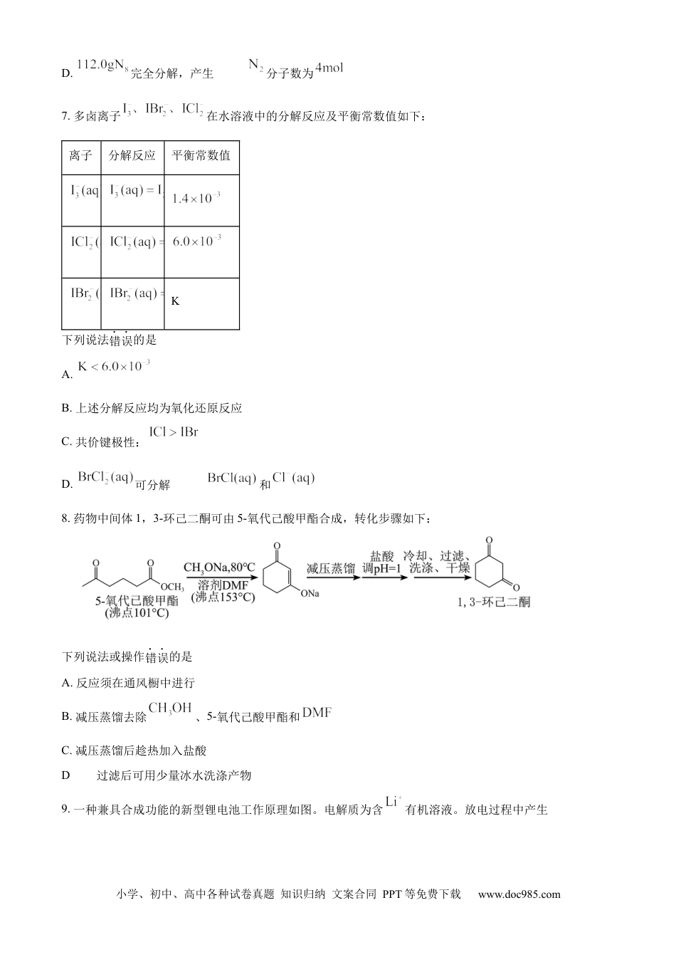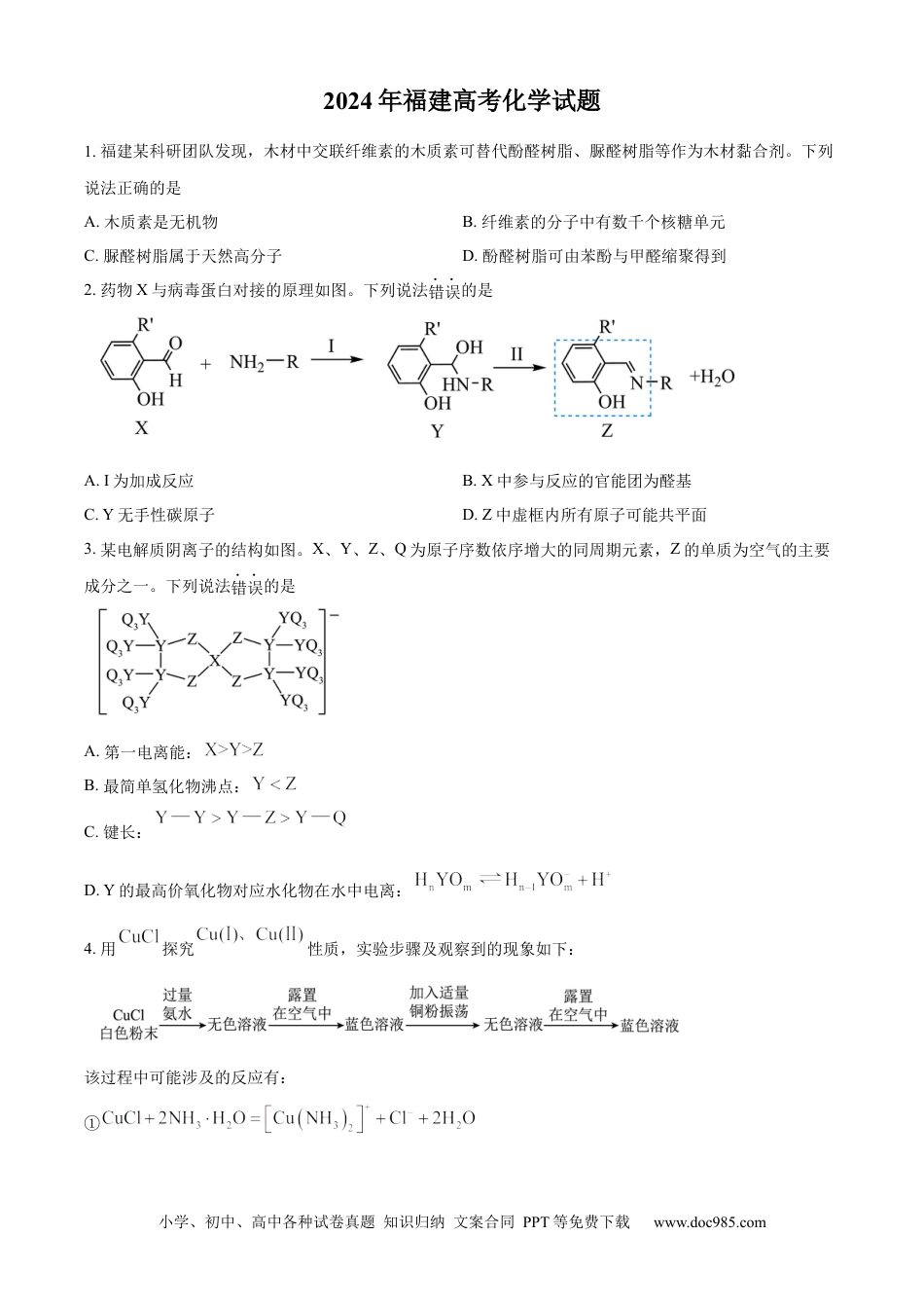 小学、初中、高中各种试卷真题知识归纳文案合同PPT等免费下载www.doc985.com2024年福建高考化学试题1.福建某科研团队发现,木材中交联纤维素的木质素可替代酚醛树脂、脲醛树脂等作为木材黏合剂。下列说法正确的是A.木质素是无机物B.纤维素的分子中有数千个核糖单元C.脲醛树脂属于天然高分子D.酚醛树脂可由苯酚与甲醛缩聚得到2.药物X与病毒蛋白对接的原理如图。下列说法错误的是A.Ⅰ为加成反应B.X中参与反应的官能团为醛基C.Y无手性碳原子D.Z中虚框内所有原子可能共平面3.某电解质阴离子的结构如图。X、Y、Z、Q为原子序数依序增大的同周期元素,Z的单质为空气的主要成分之一。下列说法错误的是A.第一电离能:B.最简单氢化物沸点:C.键长:D.Y的最高价氧化物对应水化物在水中电离:4.用探究性质,实验步骤及观察到的现象如下:该过程中可能涉及的反应有:①小学、初中、高中各种试卷真题知识归纳文案合同PPT等免费下载www.doc985.com②③④下列说法错误的是A.与的配位能力:B.无色C.氧化性:D.探究过程未发生反应②5.从废线路板(主要成分为铜,含少量铅锡合金、铝、锌和铁)中提取铜的流程如下:已知“滤液2”主要含和。下列说法正确的是A.“机械粉碎”将铅锡合金转变为铅和锡单质B.“酸溶”时产生和离子C.“碱溶”时存在反应:D.“电解精炼”时,粗铜在阴极发生还原反应6.我国科学家预测了稳定的氮单质分子(结构如图)。设为阿伏加德罗常数的值。下列说法错误的是A.的键电子数为B.的(价层)孤电子对数为C.的杂化N原子数为小学、初中、高中各种试卷真题知识归纳文案合同PPT等免费下载www.doc985.comD.完全分解,产生的分子数为7.多卤离子在水溶液中的分解反应及平衡常数值如下:离子分解反应平衡常数值K下列说法错误的是A.B.上述分解反应均为氧化还原反应C.共价键极性:D.可分解为和8.药物中间体1,3-环己二酮可由5-氧代己酸甲酯合成,转化步骤如下:下列说法或操作错误的是A.反应须在通风橱中进行B.减压蒸馏去除、5-氧代己酸甲酯和C.减压蒸馏后趁热加入盐酸D.过滤后可用少量冰水洗涤产物9.一种兼具合成功能的新型锂电池工作原理如图。电解质为含有机溶液。放电过程中产生小学、初中、高中各种试卷真题知识归纳文案合同PPT等免费下载www.doc985.com,充电过程中电解LiCl产生。下列说法正确的是A.交换膜为阴离子交换膜B.电解质溶液可替换为LiCl水溶液C.理论上每生成,需消耗2molLiD.放电时总反应:10.将草酸钙固体溶于不同初始浓度的盐酸中,平衡时部分组分的关系如图。已知草酸。下列说法错误的是A.时,溶液的B.任意下均有:C.的平衡常数为小学、初中、高中各种试卷真题知识归纳文案合同PPT等免费下载www.doc985.comD.时,11.锂云母的主要成分为,实验室探索一种碱浸分解锂云母制备的工艺流程如下:(1)“高压浸出”中:①“滤渣1”中卤化物Y为_______。(填化学式)②一定条件下,元素浸出率与用量的关系如图,为提高锂浸出率,最佳用量为_______g。(保留小数点后一位)③精矿颗粒尺寸对锂浸出率的主要影响如下:i.尺寸越小,颗粒总表面积越大,有利于反应液接触ii.尺寸越小,颗粒聚集趋势越大,不利于反应液渗入一定条件下,颗粒尺寸与锂浸出率关系如图。区域Ⅰ中,锂浸出率随颗粒尺寸减小而降低的原因是_______。(2)“沉锂”生成磷酸锂的化学方程式为_______。小学、初中、高中各种试卷真题知识归纳文案合同PPT等免费下载www.doc985.com(3)“沉淀转化”反应的平衡常数_______。(列出计算式)已知:时,。(4)“操作Z”为加热、趁热过滤和_______;趁热过滤的主要目的是_______。(分解温度约为)(5)的晶胞结构如图所示。①晶体中与一个O紧邻的有_______个。②一个与所有紧邻O形成的空间结构为_______。③晶体中微粒间作用力有_______。(填标号)a.氢键b.离子键c.金属键d.范德华力e.极性共价键f.非极性共价键12.实验室用发光二极管(LED)的生产废料(主要成分为难溶于水的GaN,含少量In、Mg金属)制备Ga2O3,过程如下。已知:Ga与In为同族元素,In难溶于NaOH溶液。(1)①基态镓(Ga)原子的价电子排布式为_______。②Ⅰ中GaN反应生成[Ga(OH)4]-的离子方程式为_______。③Ⅰ使用装...