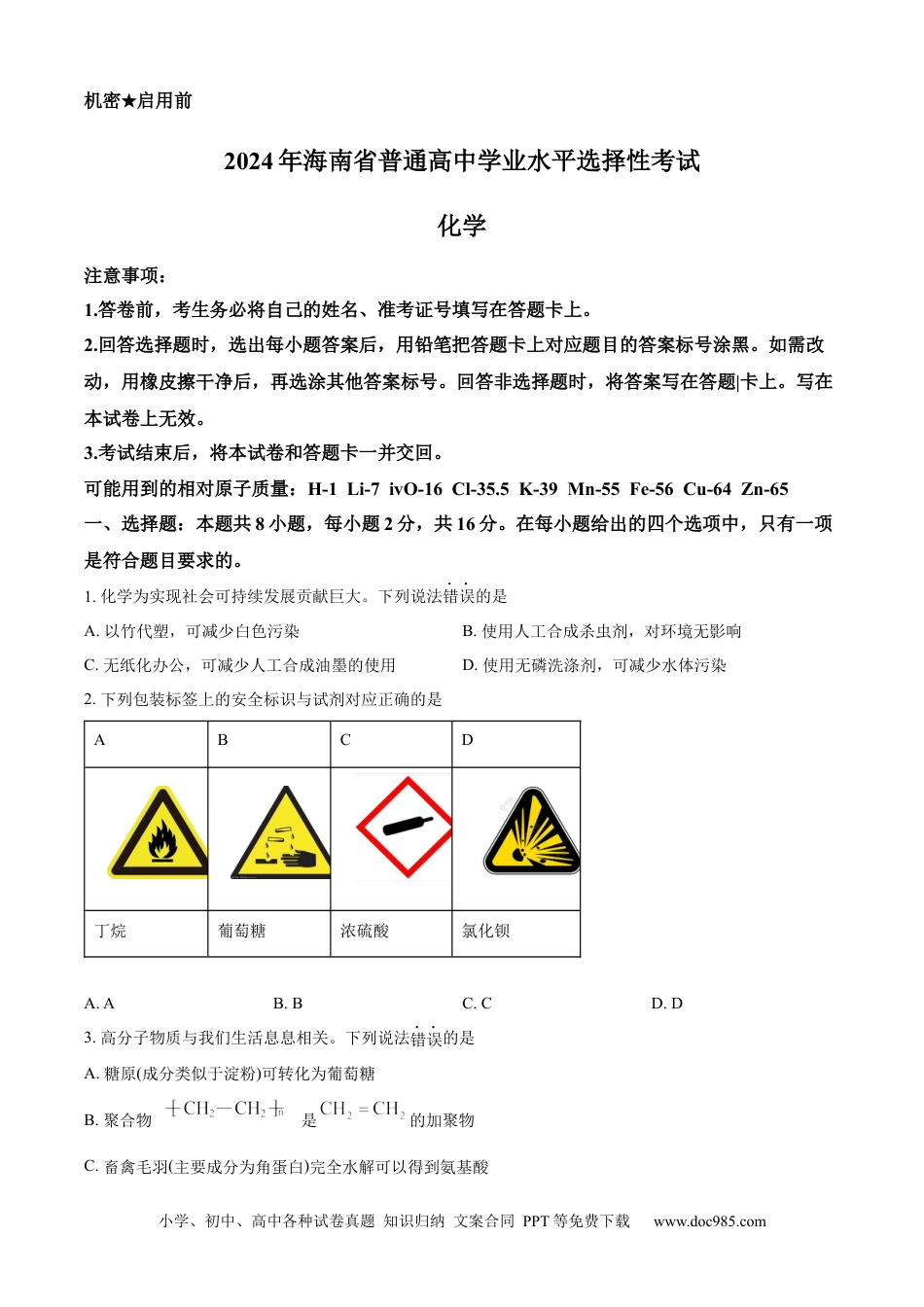 小学、初中、高中各种试卷真题知识归纳文案合同PPT等免费下载www.doc985.com机密★启用前2024年海南省普通高中学业水平选择性考试化学注意事项:1.答卷前,考生务必将自己的姓名、准考证号填写在答题卡上。2.回答选择题时,选出每小题答案后,用铅笔把答题卡上对应题目的答案标号涂黑。如需改动,用橡皮擦干净后,再选涂其他答案标号。回答非选择题时,将答案写在答题|卡上。写在本试卷上无效。3.考试结束后,将本试卷和答题卡一并交回。可能用到的相对原子质量:H-1Li-7ⅳO-16Cl-35.5K-39Mn-55Fe-56Cu-64Zn-65一、选择题:本题共8小题,每小题2分,共16分。在每小题给出的四个选项中,只有一项是符合题目要求的。1.化学为实现社会可持续发展贡献巨大。下列说法错误的是A.以竹代塑,可减少白色污染B.使用人工合成杀虫剂,对环境无影响C.无纸化办公,可减少人工合成油墨的使用D.使用无磷洗涤剂,可减少水体污染2.下列包装标签上的安全标识与试剂对应正确的是ABCD丁烷葡萄糖浓硫酸氯化钡A.AB.BC.CD.D3.高分子物质与我们生活息息相关。下列说法错误的是A.糖原(成分类似于淀粉)可转化为葡萄糖B.聚合物是的加聚物C.畜禽毛羽(主要成分为角蛋白)完全水解可以得到氨基酸小学、初中、高中各种试卷真题知识归纳文案合同PPT等免费下载www.doc985.comD.聚合物的单体是和4.过氧化脲[]是一种常用的消毒剂,可由过氧化氢()和脲加合而成,代表性结构如图所示。下列关于过氧化脲的说法正确的是A.所有原子处于同一平面B.氧的化合价均为-2价C.杀菌能力源于其氧化性D.所有共价键均为极性键5.下列化学应用实例与方程式不匹配的是选项应用实例方程式A海上油气1工平台海葵一号的钢壳外壁铺装锌锭减缓腐蚀B用硫磺粉减少破损水银体温计洒落的Hg的危害C用浓溶液洗除实验服上的黑色银斑D烘焙糕点时,以食品级作膨松剂A.AB.BC.CD.D6.代表阿伏加德罗常数的值。下列说法正确的是小学、初中、高中各种试卷真题知识归纳文案合同PPT等免费下载www.doc985.comA.超重水()所含的电子数目为B.溶液中的数目为C.过量C与充分反应转移电子数目为D.与足量发生取代反应生成HCl分子的数目为7.已知298K,101kPa时,。该反应在密闭的刚性容器中分别于T1、T2温度下进行,CO2的初始浓度为,关系如图所示。下列说法错误的是A.T1>T2B.T1下反应达到平衡时C.使用催化剂1的反应活化能比催化剂2的大D.使用催化剂2和催化剂3的反应历程相同8.已知时,,的临界温度(能够液化的最高温度)为,下列说法错误的是A.氢气燃烧热B.题述条件下和,在燃料电池中完全反应,电功+放热量C.氢能利用的关键技术在于安全储存与运输D.不同电极材料电解水所需电压不同,产生消耗的电功相同小学、初中、高中各种试卷真题知识归纳文案合同PPT等免费下载www.doc985.com二、选择题:本题共6小题,每小题4分,共24分。每小题有一个或两个选项符合题意。若正确答案只包括一个选项,多选得0分;若正确答案包括两个选项,只选一个且正确得2分,选两个且都正确得4分,但只要选错一个就得0分。9.海南暗罗是一种药用植物,具有抗菌、抗肿瘤活性。从中提取的一种生物活性物质结构简式如图所示。下列关于该分子说法正确的是A.能使酸性高锰酸钾溶液褪色B.分子式为C.含有4个手性碳原子D.预测在不同溶剂中的溶解度10.根据下列实验及现象,所得结论错误的是选项实验及现象结论A将通入溴水至过量,溶液的橙色褪去有漂白性B自热米饭附带的热源包(主要成分CaO,少许、Al粉)加水后,未产生气体Al粉已经变质C浓溶液呈黄绿色,加水稀释后溶液呈蓝色配体与间存在配位平衡移动D淀粉-KI试纸遇的混合液不变色配离子氧化能力弱小学、初中、高中各种试卷真题知识归纳文案合同PPT等免费下载www.doc985.comA.AB.BC.CD.D11.某温控质子驱动反应如图所示,下列说法错误的是A.I转化为Ⅱ后,键长变短B.基态离子的核外电子排式为C.I具备在热敏指示剂方面的应用前景D.加热时,Ⅰ的与结合,键断开12.下列实验装置或操作不能达到实验目的的是选项AB目的提纯含砂的粗碘观察气体扩散现象装置或操作选项CD目的制取少量乙酸乙酯测定中和反应的反应热装置或操作A.AB.BC.CD.D13.电解溶液得到,是早期制备的重要...