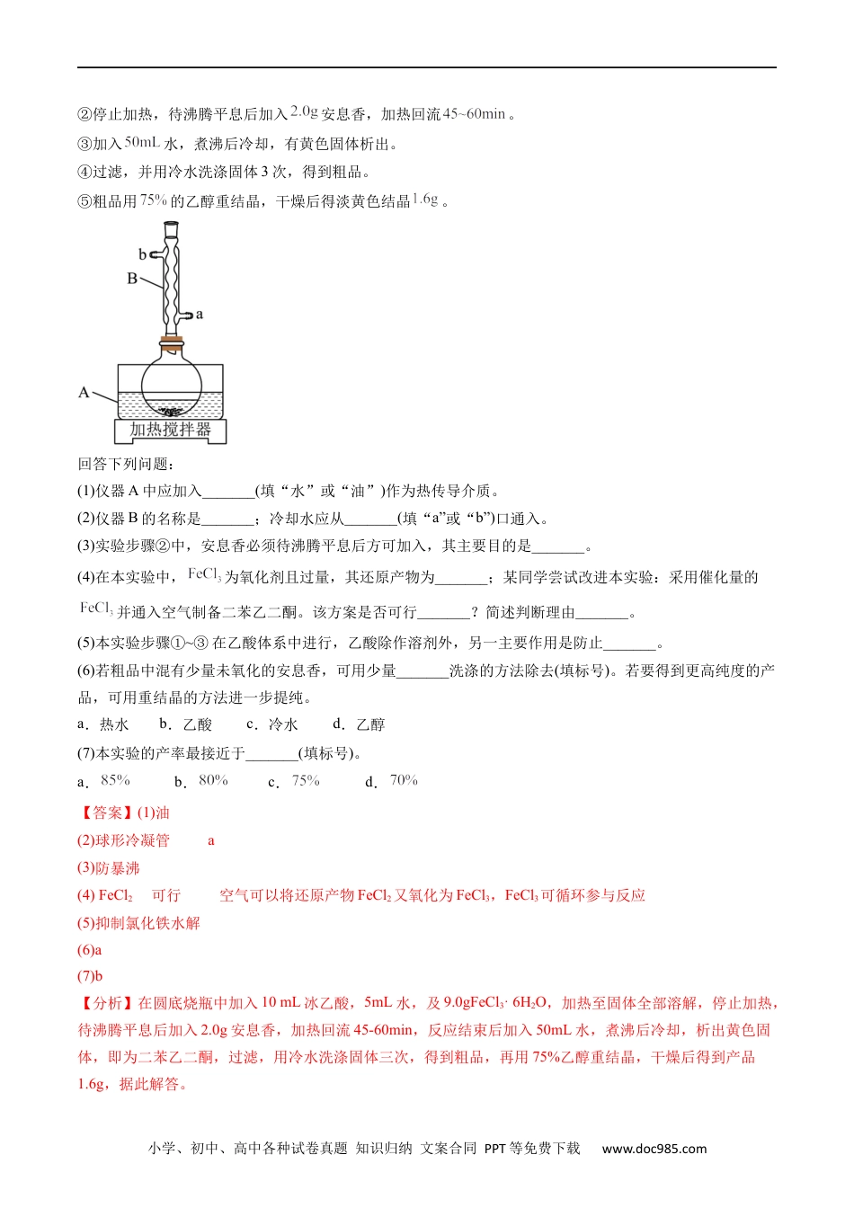 小学、初中、高中各种试卷真题知识归纳文案合同PPT等免费下载www.doc985.com五年(2019-2023)年高考真题分项汇编专题14化学实验综合题〖2023年高考真题〗考点一物质的制备1.(2023·全国甲卷)钴配合物溶于热水,在冷水中微溶,可通过如下反应制备:。具体步骤如下:Ⅰ.称取,用水溶解。Ⅱ.分批加入后,将溶液温度降至以下,加入活性炭、浓氨水,搅拌下逐滴加入的双氧水。Ⅲ.加热至反应。冷却,过滤。Ⅳ.将滤得的固体转入含有少量盐酸的沸水中,趁热过滤。Ⅴ.滤液转入烧杯,加入浓盐酸,冷却、过滤、干燥,得到橙黄色晶体。回答下列问题:(1)步骤Ⅰ中使用的部分仪器如下。仪器a的名称是_______。加快NH4Cl溶解的操作有_______。(2)步骤Ⅱ中,将温度降至10℃以下以避免_______、_______;可选用_______降低溶液温度。(3)指出下列过滤操作中不规范之处:_______。(4)步骤Ⅳ中,趁热过滤,除掉的不溶物主要为_______。(5)步骤Ⅴ中加入浓盐酸的目的是_______。【答案】(1)锥形瓶升温,搅拌等(2)浓氨水分解和挥发双氧水分解冰水浴小学、初中、高中各种试卷真题知识归纳文案合同PPT等免费下载www.doc985.com(3)玻璃棒没有紧靠三层滤纸处,漏斗末端较长处(尖嘴部分)没有紧靠在“盛滤液”的烧杯内壁(4)活性炭(5)利用同离子效应,促进钴配合物[Co(NH3)6]Cl3尽可能完全析出,提高产率【分析】称取2.0g氯化铵,用5mL水溶解后,分批加入3.0gCoCl2·6H2O后,降温,在加入1g活性炭,7mL浓氨水,搅拌下逐滴加入10mL6%的双氧水,加热反应20min,反应完成后,冷却,过滤,钴配合物在冷水中会析出固体,过滤所得固体为钴配合物[Co(NH3)6]Cl3和活性炭的混合物,将所得固体转入有少量盐酸的沸水中,趁热过滤,除去活性炭,将滤液转入烧杯中,加入浓盐酸,可促进钴配合物[Co(NH3)6]Cl3析出,提高产率,据此解答。【详解】(1)由图中仪器的结构特征可知,a为锥形瓶;加快氯化铵溶解可采用升温,搅拌等,故答案为:锥形瓶;升温,搅拌等;(2)步骤Ⅱ中使用了浓氨水和双氧水,他们高温下易挥发,易分解,所以控制在10℃以下,避免浓氨水分解和挥发,双氧水分解,要控制温度在10℃以下,通常采用冰水浴降温,故答案为:浓氨水分解和挥发;双氧水分解;冰水浴;(3)下图为过滤装置,图中玻璃棒没有紧靠三层滤纸处,可能戳破滤纸,造成过滤效果不佳。还有漏斗末端较长处(尖嘴部分)没有紧靠在“盛滤液”的烧杯内壁,可能导致液滴飞溅,故答案为:玻璃棒没有紧靠三层滤纸处,漏斗末端较长处(尖嘴部分)没有紧靠在“盛滤液”的烧杯内壁;(4)步骤Ⅳ中,将所得固体转入有少量盐酸的沸水中,根据题目信息,钴配合物[Co(NH3)6]Cl3溶于热水,活性炭不溶于热水,所以趁热过滤可除去活性炭,故答案为:活性炭;(5)步骤Ⅴ中,将滤液转入烧杯,由于钴配合物为[Co(NH3)6]Cl3中含有氯离子,加入4mL浓盐酸,可利用同离子效应,促进钴配合物[Co(NH3)6]Cl3尽可能完全析出,提高产率,钴答案为:利用同离子效应,促进钴配合物[Co(NH3)6]Cl3尽可能完全析出,提高产率。2.(2023·新课标卷)实验室由安息香制备二苯乙二酮的反应式如下:相关信息列表如下:物质性状熔点/℃沸点/℃溶解性安息香白色固体133344难溶于冷水溶于热水、乙醇、乙酸二苯乙二酮淡黄色固体95347不溶于水溶于乙醇、苯、乙酸冰乙酸无色液体17118与水、乙醇互溶装置示意图如下图所示,实验步骤为:①在圆底烧瓶中加入冰乙酸、水及,边搅拌边加热,至固体全部溶解。小学、初中、高中各种试卷真题知识归纳文案合同PPT等免费下载www.doc985.com②停止加热,待沸腾平息后加入安息香,加热回流。③加入水,煮沸后冷却,有黄色固体析出。④过滤,并用冷水洗涤固体3次,得到粗品。⑤粗品用的乙醇重结晶,干燥后得淡黄色结晶。回答下列问题:(1)仪器A中应加入_______(填“水”或“油”)作为热传导介质。(2)仪器B的名称是_______;冷却水应从_______(填“a”或“b”)口通入。(3)实验步骤②中,安息香必须待沸腾平息后方可加入,其主要目的是_______。(4)在本实验中,为氧化剂且过量,其还原产物为_______;某同学尝试改进本实验:采用催化量的并通入空...