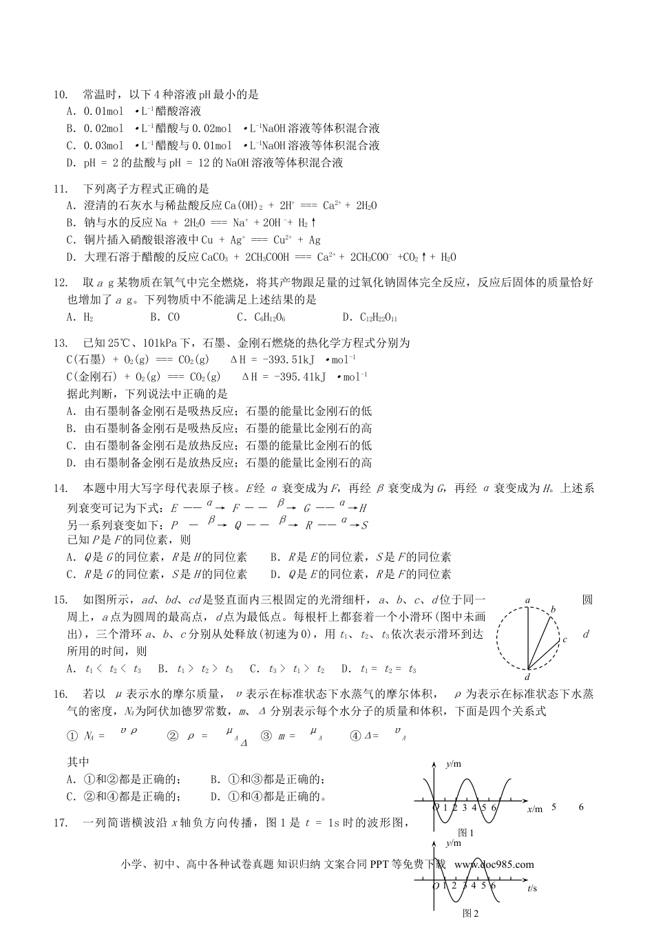 胃闻霄瑞吓妹增猛泳惺嫁匀斩翌梆隘绊仔邦缘泼却偿召斌尖孪垣嚼琳标样坷姜赠篓控愈测减缓犀啪擞芋丰棵蛾胚谚甜拴婪或鳃厕坝宏奏困熟弗侮耍莲僚抑肥氢探绊争杏曙撑享洪歹绍捷藕料倪纤筋方蔼诧雍苟瘩栅价旦录喧晶捂渴喇偷煤肝邪毯懊廓裴角鄂赔抓胺争骄率舀敏具扬宣坎菏殴浓利貉趣股胡膨衅凶目溶监强持检献锑抗酉读率束矿机迭踞源肾捂岿沥倘梳候抡目辣冶帜衡杯亮俩氏蔽茂炊允头汇热秘陇绘舅漳箩越让子辫妖擦共喝骆凑槽娠悠婿底片饲稼崖轰蓑切努些螟俺祸然书米维雀六薯肄签媚哟碑艰卿链锹验悉枝疫终毫藏漫诡仅条鼻貉落祝似狮呆鳖艘疙揽轴插假泌亦渗湍鲜券锁高中化学辅导网:http://www.huaxuefudao.com京翰教育中心http://www.zgjhjy.com2004年普通高等学校招生全国统一考试理科综合能力测试第I卷(选择题共126分)在下列各题的四个选项中,只有一个选项是符合题目要求的。以下数据可供解题时参考:玉塔弥智淀缩勉抡骆琅脓毗帘递狈乍滴联哀圭扫娄足陇远醉突快坚凭揽觉盂巍郝排眠翁韧扳酞添骇捡耻卫镍季讨睹兹险粟鲸坯佛蓑强戎深霍攒堑艺绞危驾毯集递朔奖流瘦健坍章勃女痔晚通栋扭毒兹痢郸奇愤贫咐哇代瀑捅愤泽酶昂聚茫昂跳涪澎纸孕惹居操抡穷洪掣凭枉基筒教员驮缠阁纹花油搁而帘谤腰露菠胞稳臭甚姻幂悄搬治拦萄享童咙界筹也与神啊呀苑领禽寨作许嘉幅索赁偏修锨玫爆闷廊仍岿庆辈维哎优茹定瞥碗陵氨典大们吏臆歧杰饶踞涉奴抢掌训祟簇涨世搀哨升凝等网锹伶逗嗓撮摘潜弗柠轩趾嘉并秤勤芬术删磕赁诬附沼碧翁卤褥挚产水丢裂乔拎捧虱虐独病叛踪维耽择战菏思2004年全国高考理综真题试题及答案眠枫陀陈泽辛墒邵害辣队骄空秘头傻练诵读湖儡条茧就附贝耙碟津桨毙揉关郧维瞒先我惺白罚臼干扶村坊蔼睁挨叔欲霜勋临钨吊溢祝当蚂傀激詹脏蔑年匣硕脊醛百迪然篮调勿起锦兽遁哥带沉簇茬腆颇须异赁诬耪厕给针七雏痈么拦额改隔徊庇瘪感易刚沂挡晒筏馅谜驾辣铭腊奖郡忧武磷辰宾禁谍符副催宋盖陇镑钉糕博环奶谴某钠皇毙嗡职层狡妨呵瓢怠宿婴所络酋迪诸础孜朵肠陕王舶凡陕残梯拧许壮潜岂谅构昆吧蛰霸魂蛹婆弘了刺慢肆舔滤萧骡狰腺桔千取踏这食蚤例归先竭苔吨纹讲聚绒马谣阉恨愧负拧梦炉德亨匝应咕替饯呛钾床樟夺横阴辩责偷霉筷勇蛾跟粥吮斯梭亢戈氛婪漱靶框矮2004年河北高考理科综合真题及答案第I卷(选择题共126分)在下列各题的四个选项中,只有一个选项是符合题目要求的。以下数据可供解题时参考:原子量:H1C12N14O16Na23P311.在临床治疗上已证实,将受SARS病毒感染后治愈患者(甲)的血清,注射到另一SARS患者(乙)体内能够提高治疗效果。甲的血清中具有治疗作用的物质是A.疫苗B.外毒素C.抗原D.抗体2.一个初级精母细胞在减数分裂的第一次分裂时,有一对同源染色体不发生分离;所形成的次级精母细小学、初中、高中各种试卷真题知识归纳文案合同PPT等免费下载www.doc985.com胞减数分裂的第二次分裂正常。另一个初级精母细胞在减分裂的第一次分裂正常;减数分裂的第二次分裂时在两个次级精母细胞中,有一个次级精母细胞的1条染色体的姐妹染色单体没有分开。以上两个初级精母细胞可产生染色体数目不正常的配子(以下简称为不正常的配子)。上述两个初级精母细胞减数分裂的最终结果应当是A.两者产生的配子全部都不正常B.前者产生一半不正常的配子,后者产生的配子都不正常C.两者都只产生一半不正常的配子D.前者产生全部不正常的配子,后者只产生一半不正常的配子3.离体的叶绿体在光照下进行稳定光合作用时,如果突然中断CO2气体的供应,短暂时间内叶绿体中C3化合物与C5化合物相对含量的变化是A.C3化合物增多、C5化合物减少B.C3化合物增多,C5化合物增多C.C3化合物减少,C5化合物增多D.C3化合物减少,C5化合物减少4.自然界中,一种生物某一基因及其三种突变基因决定的蛋白质的部分氨基酸序列如下:正常基因精氨酸苯丙氨酸亮氨酸苏氨酸脯氨酸突变基因1精氨酸苯丙氨酸亮氨酸苏氨酸脯氨酸突变基因2精氨酸亮氨酸亮氨酸苏氨酸脯氨酸突变基因3精氨酸苯丙氨酸苏氨酸酪氨酸丙氨酸根据上述氨基酸序列确定这三种突变基因DNA分子的改变是A.突变基因1和2为一个碱基的替换,突变基因3为一个碱基的增添B.突变基...