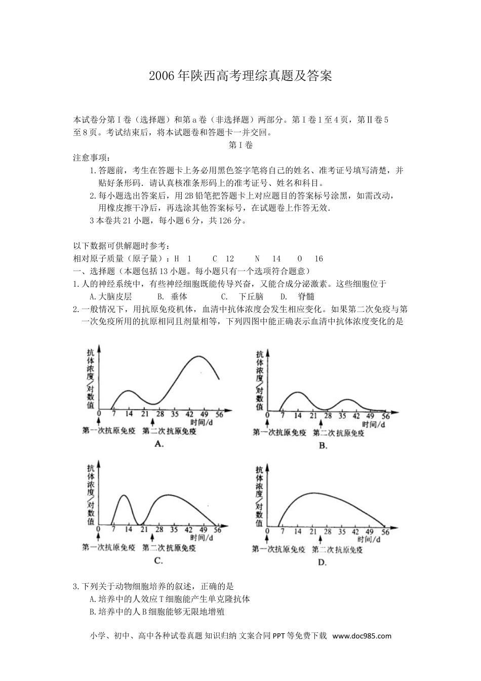 2006年陕西高考理综真题及答案本试卷分第I卷(选择题)和第a卷(非选择题)两部分。第I卷1至4页,第Ⅱ卷5至8页。考试结束后,将本试题卷和答题卡一并交回。第I卷注愈事项:1.答题前,考生在答题卡上务必用黑色签字笔将自己的姓名、准考证号填写清楚,并贴好条形码.请认真核准条形码上的准考证号、姓名和科目。2.每小题选出答案后,用2B铅笔把答题卡上对应题目的答案标号涂黑,如需改动,用橡皮擦干净后,再选涂其他答案标号,在试题卷上作答无效.3本卷共21小题,每小题6分,共126分。以下数据可供解题时参考:相对原子质量(原子量):H1C12N14O16一、选择题(本题包括13小题。每小题只有一个选项符合题意)1.人的神经系统中,有些神经细胞既能传导兴奋,又能合成分泌激素。这些细胞位于A.大脑皮层B.垂体C.下丘脑D.脊髓2.一般情况下,用抗原免疫机体,血清中抗体浓度会发生相应变化。如果第二次免疫与第一次免疫所用的抗原相同且剂量相等,下列四图中能正确表示血清中抗体浓度变化的是3.下列关于动物细胞培养的叙述,正确的是A.培养中的人效应T细胞能产生单克隆抗体B.培养中的人B细胞能够无限地增殖小学、初中、高中各种试卷真题知识归纳文案合同PPT等免费下载www.doc985.comC.人的成熟红细胞经过培养能形成细胞株D.用胰蛋白酶处理肝组织可获得单个肝细胞4.锄足蟾蝌蚪、雨蛙蝌蚪和蟾蜍蝌蚪均以浮游生物为食。在条件相同的四个池塘中,每池放养等量的三种蝌蚪,各池蝌蚪总数相同。再分别在四个池塘中放入不同数量的捕食者水螈。一段时间后,三种蝌蚪数量变化结果如图。下列分析,错误的是A.无水螈的池塘中,锄足蟾蝌蚪数量为J型增长B.三种蝌蚪之间为竞争关系C.水螈更喜捕食锄足蟾蝌蚪D.水螈改变了三种蝌蚪间相互作用的结果5.采用基因工程技术将人凝血因子基因导入山羊受精卵,培育出了转基因羊。但是,人凝血因子只存在于该转基因羊的乳汁中。以下有关叙述,正确的是A.人体细胞中凝血因子基因编码区的碱基对数目,等于凝血因子氨基酸数目的3倍B.可用显微注射技术将含有人凝血因子基因的重组DNA分子导入羊的受精卵C.在转基因羊中,人凝血因子基因存在于乳腺细胞,而不存在于其他体细胞中D.人凝血因子基因开始转录后,DNA连接酶以DNA分子的一条链为模板合成mRNA6.在常温常压下呈气态的化合物,降温使其固化得到的晶体属于A.分子晶体B.原子晶体C.离子晶体D.何种晶体无法判断7.下列叙述正确的是A.同一主族的元素,原子半径越大,其单质的熔点一定越高B.同一周期元素的原子,半径越小越容易失去电子C.同一主族的元素的氢化物,相对分子质量越大,它的沸点一定越高D.稀有气体元素的原子序数越大,其单质的沸点一定越高8.用AN代表阿伏加德罗常数,下列说法正确的是A.0.5molAl与足量盐酸反应转移电子数为1ANB.标准状况下,11.2L3SO所含的分子数为0.5ANC.0.1mol4CH所含的电子数为1AND.46g2NO和24NO的混合物含有的分子数为1AN小学、初中、高中各种试卷真题知识归纳文案合同PPT等免费下载www.doc985.com9.把分别盛有熔融的氯化钾、氯化镁、氯化铝的三个电解槽串连,在一定条件下通电一段时间后,析出钾、镁、铝的物质的量之比为A.1:2:3B.3:2:1C.6:3:1D.6:3:210.浓度均为0.1mol·L-1的三种溶液等体积混和,充分反映后没有沉淀的一组溶液是A.BaCl2NaOHNaHCO3B.Na2CO3MgCl2H2SO4C.AlCl3NH3·H2ONaOHD.Ba(OH)2CaCl2Na2SO411.在0.1mol·L-1CH3COOH溶液中存在如下电离平衡:CH3COOHCH3COO-+H+对于该平衡,下列叙述正确的是A.加入水时,平衡向逆反应方向移动B.加入少量NaOH固体,平衡向正反应方向移动C.加入少量0.1mol·L-1HCl溶液,溶液中c(H+)减小D.加入少量CH3COONa固体,平衡向正反应方向移动12.茉莉醛具有浓郁的茉莉花香,其结构简式如下所示:关于茉莉醛的下列叙述错误的是A.在加热和催化剂作用下,能被氢气还原B.能被高锰酸钾酸性溶液氧化C.在一定条件下能与溴发生取代反应D.不能与氢溴酸发生加成反应13.由硫酸钾、硫酸铝和硫酸组成的混和溶液,其pH=1,c(Al3+)=0.4mol·L-1,c(SO42-)=0.8mol·L-1,则c(K+)为A.0.15mol·L-1B.0.2mol·L-1C.0.3mol·L-1D.0.4mol·L-1...