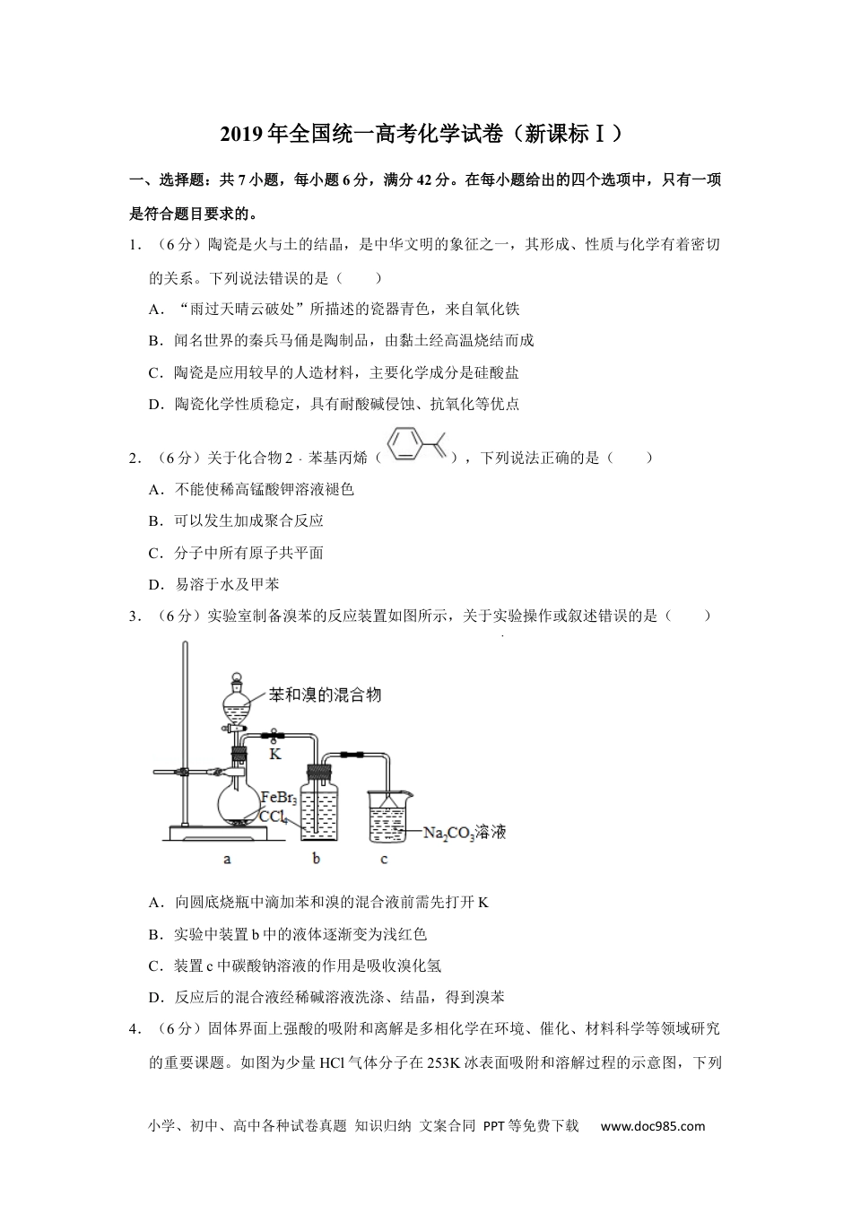 小学、初中、高中各种试卷真题知识归纳文案合同PPT等免费下载www.doc985.com2019年全国统一高考化学试卷(新课标Ⅰ)一、选择题:共7小题,每小题6分,满分42分。在每小题给出的四个选项中,只有一项是符合题目要求的。1.(6分)陶瓷是火与土的结晶,是中华文明的象征之一,其形成、性质与化学有着密切的关系。下列说法错误的是()A.“雨过天晴云破处”所描述的瓷器青色,来自氧化铁B.闻名世界的秦兵马俑是陶制品,由黏土经高温烧结而成C.陶瓷是应用较早的人造材料,主要化学成分是硅酸盐D.陶瓷化学性质稳定,具有耐酸碱侵蚀、抗氧化等优点2.(6分)关于化合物2﹣苯基丙烯(),下列说法正确的是()A.不能使稀高锰酸钾溶液褪色B.可以发生加成聚合反应C.分子中所有原子共平面D.易溶于水及甲苯3.(6分)实验室制备溴苯的反应装置如图所示,关于实验操作或叙述错误的是()A.向圆底烧瓶中滴加苯和溴的混合液前需先打开KB.实验中装置b中的液体逐渐变为浅红色C.装置c中碳酸钠溶液的作用是吸收溴化氢D.反应后的混合液经稀碱溶液洗涤、结晶,得到溴苯4.(6分)固体界面上强酸的吸附和离解是多相化学在环境、催化、材料科学等领域研究的重要课题。如图为少量HCl气体分子在253K冰表面吸附和溶解过程的示意图,下列小学、初中、高中各种试卷真题知识归纳文案合同PPT等免费下载www.doc985.com叙述错误的是()A.冰表面第一层中,HCl以分子形式存在B.冰表面第二层中,H+浓度为5×103﹣mol•L1﹣(设冰的密度为0.9g•cm3﹣)C.冰表面第三层中,冰的氢键网络结构保持不变D.冰表面各层之间,均存在可逆反应HCl⇌H++Cl﹣5.(6分)NaOH溶液滴定邻苯二甲酸氢钾(邻苯二甲酸H2A的Ka1=1.1×103﹣,Ka2=3.9×106﹣)溶液,混合溶液的相对导电能力变化曲线如图所示,其中b点为反应终点。下列叙述错误的是()A.混合溶液的导电能力与离子浓度和种类有关B.Na+与A2﹣的导电能力之和大于HA﹣的C.b点的混合溶液pH=7D.c点的混合溶液中,c(Na+)>c(K+)>c(OH﹣)6.(6分)利用生物燃料电池原理研究室温下氨的合成,电池工作时MV2+/MV+在电极与酶之间传递电子,示意图如下所示。下列说法错误的是()小学、初中、高中各种试卷真题知识归纳文案合同PPT等免费下载www.doc985.comA.相比现有工业合成氨,该方法条件温和,同时还可提供电能B.阴极区,在氢化酶作用下发生反应H2+2MV2+═2H++2MV+C.正极区,固氮酶为催化剂,N2发生还原反应生成NH3D.电池工作时质子通过交换膜由负极区向正极区移动7.(6分)科学家合成出了一种新化合物(如图所示),其中W、X、Y、Z为同一短周期元素,Z核外最外层电子数是X核外电子数的一半。下列叙述正确的是()A.WZ的水溶液呈碱性B.元素非金属性的顺序为X>Y>ZC.Y的最高价氧化物的水化物是中强酸D.该新化合物中Y不满足8电子稳定结构二、非选择题:共43分。第8~10题为必考题,每个试题考生都必须作答。第11~12为选考题,考生根据要求作答。(一)必考题:8.(14分)硼酸(H3BO3)是一种重要的化工原料,广泛应用于玻璃、医药、肥料等工业。一种以硼镁矿(含Mg2B2O5•H2O、SiO2及少量Fe2O3、Al2O3)为原料生产硼酸及轻质氧化镁的工艺流程如下:小学、初中、高中各种试卷真题知识归纳文案合同PPT等免费下载www.doc985.com回答下列问题:(1)在95℃“溶浸”硼镁矿粉,产生的气体在“吸收”中反应的化学方程式为。(2)“滤渣1”的主要成分有。为检验“过滤1”后的滤液中是否含有Fe3+离子,可选用的化学试剂是。(3)根据H3BO3的解离反应:H3BO3+H2O⇌H++B(OH)4﹣,Ka=5.81×1010﹣,可判断H3BO3是酸;在“过滤2”前,将溶液pH调节至3.5,目的是。(4)在“沉镁”中生成Mg(OH)2•MgCO3沉淀的离子方程式为,母液经加热后可返回工序循环使用。由碱式碳酸镁制备轻质氧化镁的方法是。9.(15分)硫酸铁铵[NH4Fe(SO4)2•xH2O]是一种重要铁盐。为充分利用资源,变废为宝,在实验室中探究采用废铁屑来制备硫酸铁铵,具体流程如图:回答下列问题:(1)步骤①的目的是去除废铁屑表面的油污,方法是。(2)步骤②需要加热的目的是,温度保持80...