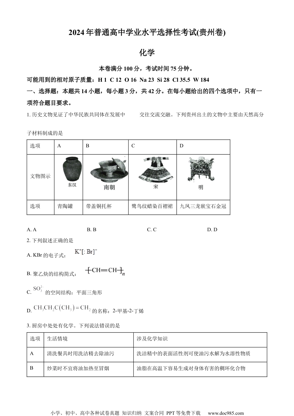 小学、初中、高中各种试卷真题知识归纳文案合同PPT等免费下载www.doc985.com2024年普通高中学业水平选择性考试(贵州卷)化学本卷满分100分,考试时间75分钟。可能用到的相对原子质量:H1C12O16Na23Si28Cl35.5W184一、选择题:本题共14小题,每小题3分,共42分。在每小题给出的四个选项中,只有一项符合题目要求。1.历史文物见证了中华民族共同体在发展中的交往交流交融。下列贵州出土的文物中主要由天然高分子材料制成的是选项ABCD文物图示选项青陶罐带盖铜托杯鹭鸟纹蜡染百褶裙九凤三龙嵌宝石金冠A.AB.BC.CD.D2.下列叙述正确的是A.KBr的电子式:B.聚乙炔的结构简式:C.的空间结构:平面三角形D.的名称:2-甲基-2-丁烯3.厨房中处处有化学。下列说法错误的是选项生活情境涉及化学知识A清洗餐具时用洗洁精去除油污洗洁精中的表面活性剂可使油污水解为水溶性物质B炒菜时不宜将油加热至冒烟油脂在高温下容易生成对身体有害的稠环化合物小学、初中、高中各种试卷真题知识归纳文案合同PPT等免费下载www.doc985.comC长期暴露在空气中的食盐变成了糊状食盐中常含有容易潮解的D久煮的鸡蛋蛋黄表面常呈灰绿色蛋白中硫元素与蛋黄中铁元素生成的FeS和蛋黄混合呈灰绿色A.AB.BC.CD.D4.贵州盛产灵芝等中药材。灵芝酸B是灵芝的主要活性成分之一,其结构简式如图。下列说法错误的是A.分子中只有4种官能团B.分子中仅含3个手性碳原子C.分子中碳原子的杂化轨道类型是和D.该物质可发生酯化反应、加成反应和氧化反应5.下列装置不能达到实验目的的是A.图①可用于实验室制B.图②可用于除去中少量的C.图③可用于分离和D.图④可用于制备明矾晶体6.二氧化氯可用于自来水消毒。实验室用草酸和制取的反应为。设为阿伏加德罗常数的值。下小学、初中、高中各种试卷真题知识归纳文案合同PPT等免费下载www.doc985.com列说法正确的是A.中含有的中子数为B.每生成,转移电子数为C.溶液中含有的数目为D.标准状况下,中含键数目为7.下列离子方程式书写错误的是A.用氢氟酸雕刻玻璃:B.用绿矾处理酸性废水中的C.用泡沫灭火器灭火的原理:D.工业电解饱和食盐水制烧碱和氯气:8.我国科学家首次合成了化合物[K(2,2,2-crypt)][K@Au12Sb20]。其阴离子[K@Au12Sb20]5-为全金属富勒烯(结构如图),具有与富勒烯C60相似的高对称性。下列说法错误的是A.富勒烯C60是分子晶体B.图示中的K+位于Au形成的二十面体笼内C.全金属富勒烯和富勒烯C60互为同素异形体D.锑(Sb)位于第五周期第ⅤA族,则其基态原子价层电子排布式是5s25p39.某化合物由原子序数依次增大的短周期主族元素W、X、Y、Z、Q组成(结构如图)。X的最外层电子数等于内层电子数,Y是有机物分子骨架元素,Q和W能形成两种室温下常见的液态化合物。下列说法错误的是小学、初中、高中各种试卷真题知识归纳文案合同PPT等免费下载www.doc985.comA.第一电离能:B.该化合物中Q和W之间可形成氢键C.X与Al元素有相似的性质D.W、Z、Q三种元素可形成离子化合物10.根据下列实验操作及现象所推出的结论正确的是选项实验操作及现象结论A将Zn和溶液与Cu和溶液组成双液原电池,连通后铜片上有固体沉积原电池中Zn作正极,Cu作负极B向洁净试管中加入新制银氨溶液,滴入几滴乙醛,振荡,水浴加热,试管壁上出现银镜乙醛有氧化性C向苯酚浊液中加入足量溶液,溶液由浑浊变澄清苯酚的酸性比强D向溶液中先通入适量,无明显现象,再加入稀,有白色沉淀生成稀有氧化性A.AB.BC.CD.D11.一种太阳能驱动环境处理的自循环光催化芬顿系统工作原理如图。光阳极发生反应:,。体系中与Mn(Ⅱ)/Mn(Ⅳ)发生反应产生的活性氧自由基可用于处理污水中的有机污染物。小学、初中、高中各种试卷真题知识归纳文案合同PPT等免费下载www.doc985.com下列说法错误的是A.该芬顿系统能量转化形式为太阳能电能化学能B.阴极反应式为C.光阳极每消耗,体系中生成D.在Mn(Ⅱ)/Mn(Ⅳ)的循环反应中表现出氧化性和还原性12.硼砂水溶液常用于pH计的校准。硼砂水解生成等物质的量的(硼酸)和(硼酸钠)。已知:①时,硼酸显酸性的原理②。下列说法正确的是A.硼砂稀溶液中B.硼酸水溶液中的主要来自水的电离C.25℃时,硼酸水溶液的D.等浓度等体积的和溶...