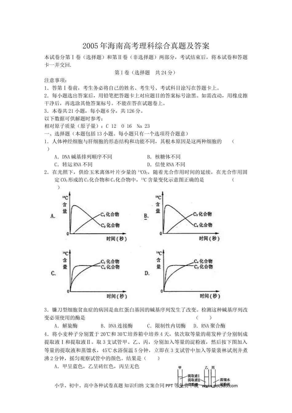 2005年海南高考理科综合真题及答案本试卷分第Ⅰ卷(选择题)和第Ⅱ卷(非选择题)两部分,考试结束后,将本试卷和答题卡一并交回.第I卷(选择题共24分)注意事项:1.答第Ⅰ卷前,考生务必将自己的姓名、考生号、考试科目涂写在答题卡上。2.每小题选出答案后,用铅笔把答题卡上对应题目的答案标号涂黑。如需改动,用橡皮擦干净后,再选涂其他答案标号。不能在答在试题卷上。3.本卷共21小题,每小题6分,共126分。以下数据可供解题时参考:相对原子质量(原子量):C12O16Na23一、选择题(本题包括13小题。每小题只有一个选项符合题意)1.人体神经细胞与肝细胞的形态结构和功能不同,其根本原因是这两种细胞的()A.DNA碱基排列顺序不同B.核糖体不同C.转运RNA不同D.信使RNA不同2.在光照下,供给玉米离体叶片少量的14CO2,随着光合作用时间的延续,在光合作用固定CO2形成的C3化合物和C4化合物中,14C含量变化示意图正确的是()3.镰刀型细胞贫血症的病因是血红蛋白基因的碱基序列发生了改变。检测这种碱基序列改变必须使用的酶是()A.解旋酶B.DNA连接酶C.限制性内切酶D.RNA聚合酶4.将小麦种子分别置于20℃和30℃培养箱中培养4天,依次取等量的萌发种子分别制成提取液Ⅰ和提取液Ⅱ。取3支试管甲、乙、丙,分别加入等量的淀粉液,然后按下图加入等量的提取液和蒸馏水,45℃水浴保温5分钟,立即在3支试管中加入等量裴林试剂并煮沸2分钟,摇匀观察试管中的颜色。结果是()A.甲呈蓝色,乙呈砖红色,丙呈无色小学、初中、高中各种试卷真题知识归纳文案合同PPT等免费下载www.doc985.comB.甲呈无色,乙呈砖红色,丙呈蓝色C.甲、乙皆呈蓝色,丙呈砖红色D.甲呈浅砖红色,乙呈砖红色,丙呈蓝色5.为了保护鱼类资源不受破坏,并能持续地获得量大捕鱼量,根据种群增长的S型曲线,应使被捕鱼群的种群数量保持在K/2水平。这是因为在这个水平上()A.种群数量相对稳定B.种群增长量最大C.种群数量最大D.环境条件所允许的种群数量最大6.下列分子中所有原子都满足最外层为8电子结构的是()A.BF3B.H2OC.SiCl4D.PCl57.等物质的量的主族金属A、B、C分别与足量的稀盐酸反应,所得氢气的体积依次为VA、VB、VC,已知VB=2VC,且VA=VB+VC,则在C的生成物中,该金属元素的化合价为()A.+1B.+2C.+3D.+48.已知Q与R的摩尔质量之比为9:22,在反应X+2Y=2Q+R中,当1.6gX与Y完全反应后,生成4.4gR,则参与反应的Y和生成物Q的质量之比为()A.46:9B.32:9C.23:9D.16:99.下列说法中正确的是()A.非金属元素呈现的最高化合价不超过该元素原子的最外层电子数B.非金属元素呈现的最低化合价,其绝对值等于该元素原子的最外层电子数C.最外层有2个电子的原子都是金属原子D.最外层有5个电子的原子都是非金属原子10.在pH=1的溶液中,可以大量共存的离子是()A.K+、Na+、SO42—、S2O32—B.NH4+、Mg2+、SO42—、Cl—C.Na+、K+、HCO3—、Cl—D.K+、Na+、AlO2—、NO3—11.关于电解NaCl水溶液,下列叙述正确的是()A.电解时在阳极得到氯气,在阴极得到金属钠B.若在阳极附近的溶液中滴入KI溶液,溶液呈棕色C.若在阴极附近的溶液中滴入酚酞试液,溶液呈无色D.电解一段时间后,将全部电解液转移到烧杯中,充分搅拌后溶液呈中性12.右图是温度和压强对X+Y2Z反应影响的示意图。图中横坐标表示温度,纵坐标表示平衡混合气体中Z的体积分数。下列叙述正确的是()A.上述可逆反应的正反应为放热反应B.X、Y、Z均为气态C.X和Y中只有一种为气态,Z为气态D.上述反应的逆反应的△H>013.已知充分燃烧ag乙炔气体时生成1mol二氧化碳气体和液态水,并放出热量bkJ,则乙炔燃烧的热化学方小学、初中、高中各种试卷真题知识归纳文案合同PPT等免费下载www.doc985.com程式正确的是()A.2C2H2(g)+5O2(g)4CO2(g)+2H2O(l);△H=-4bkJ/molB.C2H2(g)+O2(g)2CO2(g)+H2O(l);△H=2bkJ/molC.2C2H2(g)+5O2(g)4CO2(g)+2H2O(l);△H=-2bkJ/molD.2C2H2(g)+5O2(g)4CO2(g)+2H2O(l);△H=bkJ/mol二、选择题(本题包括8小题。每小题给出的四个选项中,有的只有一个选项...
