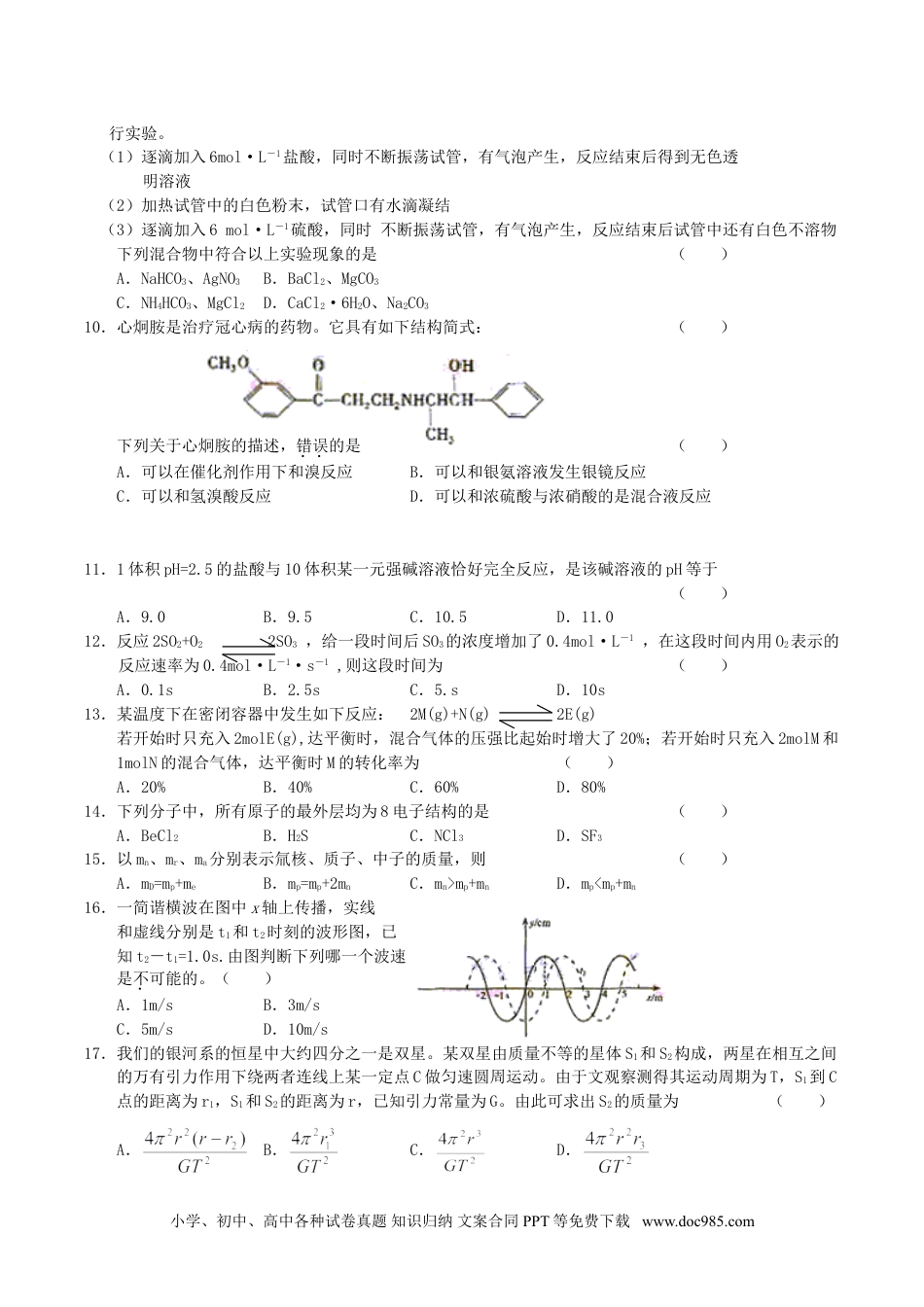 2004年海南高考理科综合真题及答案本试卷分第I卷(选择题)和第II卷(非选择题)两部分。第I卷(选择题共21题每题6分共126分)以下数据可供解题时参考:原子量:H1O16Mg24Al27Cl35.5Ca40Fe56Zn651.研究表明,大多数动物如蛙的受精卵在卵裂期随着卵裂的进行胚胎的体积并不增大,但胚胎细胞棱的总质量与细胞质的总质量(核/质)比值却发生变化。下列符合卵裂期核质质量比值变化趋势的示意图是()2.下列有关小麦根系吸收矿质元素的叙述,正确的是()A.根吸收矿质元素所需的ATP直接来源于光合作用B.根吸收矿质元素所需的ATP直接来源于呼吸作用C.根尖表皮细胞对各种矿质元素的吸收量相等D.各种矿质元素进入根尖表皮细胞需要同一膜载体的协助3.手术切除成年大白鼠的整个甲状腺,一段时间后,该大白鼠表现为()A.分解代射增强B.生长发育加快C.自由活动减少D.食欲增强4.抗维生素D佝偻病是位于X染色体的显性致病基因决定的一种遗传病,这种疾病的遗传特点之一是()A.男患者与女患者结婚,其女儿正常B.男患者与正常女子结婚,其子女均正常C.女患者与正常男子结婚,必然儿子正常女儿患病D.患者的正常子女不携带该患者传递的致病基因5.寒带针叶林中两个动物种群(N1、N2)的数量变化如右图所示,据图判断这两个种群的关系是()A.捕食关系,N1为捕食者,N2为被捕食者B.捕食关系,N2为捕食者,N1为被捕食者C.竟争关系,N1为竟争中的胜者,N2为失败者D.共生关系,N1、N2彼此依赖,相互有利6.下列分子含有的电子数目与HF相同,且只有两个极性共价键的是()A.CO2B.N2OC.H2OD.CH47.久置空气中会发生颜色变化,但颜色变化不是由于跟氧气反应引起的物质是()A.过氧化钠固体B.亚硫酸钠固体C.硫酸业铁晶体D.苯酚晶体8.若1.8g某金属跟足量盐酸充分反应,放出2.24L(标准状况)氢气,则该金属是()A.AlB.MgC.FeD.Zn9.有一种白色粉末由等质量的两种物质混合而成,分别取适量该白色粉末置于三支试管中进小学、初中、高中各种试卷真题知识归纳文案合同PPT等免费下载www.doc985.com行实验。(1)逐滴加入6mol·L-1盐酸,同时不断振荡试管,有气泡产生,反应结束后得到无色透明溶液(2)加热试管中的白色粉末,试管口有水滴凝结(3)逐滴加入6mol·L-1硫酸,同时不断振荡试管,有气泡产生,反应结束后试管中还有白色不溶物下列混合物中符合以上实验现象的是()A.NaHCO3、AgNO3B.BaCl2、MgCO3C.NH4HCO3、MgCl2D.CaCl2·6H2O、Na2CO310.心炯胺是治疗冠心病的药物。它具有如下结构简式:()下列关于心炯胺的描述,错误的是()A.可以在催化剂作用下和溴反应B.可以和银氨溶液发生银镜反应C.可以和氢溴酸反应D.可以和浓硫酸与浓硝酸的是混合液反应11.1体积pH=2.5的盐酸与10体积某一元强碱溶液恰好完全反应,是该碱溶液的pH等于()A.9.0B.9.5C.10.5D.11.012.反应2SO2+O22SO3,给一段时间后SO3的浓度增加了0.4mol·L-1,在这段时间内用O2表示的反应速率为0.4mol·L-1·s-1,则这段时间为()A.0.1sB.2.5sC.5.sD.10s13.某温度下在密闭容器中发生如下反应:2M(g)+N(g)2E(g)若开始时只充入2molE(g),达平衡时,混合气体的压强比起始时增大了20%;若开始时只充入2molM和1molN的混合气体,达平衡时M的转化率为()A.20%B.40%C.60%D.80%14.下列分子中,所有原子的最外层均为8电子结构的是()A.BeCl2B.H2SC.NCl3D.SF315.以mn、mr、ma分别表示氚核、质子、中子的质量,则()A.mD=mp+meB.mp=mp+2mnC.mn>mp+mnD.mp<mp+mn16.一简谐横波在图中x轴上传播,实线和虚线分别是t1和t2时刻的波形图,已知t2-t1=1.0s.由图判断下列哪一个波速是不可能的。()A.1m/sB.3m/sC.5m/sD.10m/s17.我们的银河系的恒星中大约四分之一是双星。某双星由质量不等的星体S1和S2构成,两星在相互之间的万有引力作用下绕两者连线上某一定点C做匀速圆周运动。由于文观察测得其运动周期为T,S1到C点的距离为r1,S1和S2的距离为r,已知引力常量为G。由此可求出S2的质量为()A.B.C.D.小学、初中、高中各种试卷真题知识归纳文案合同PPT等免费下载www.doc985....