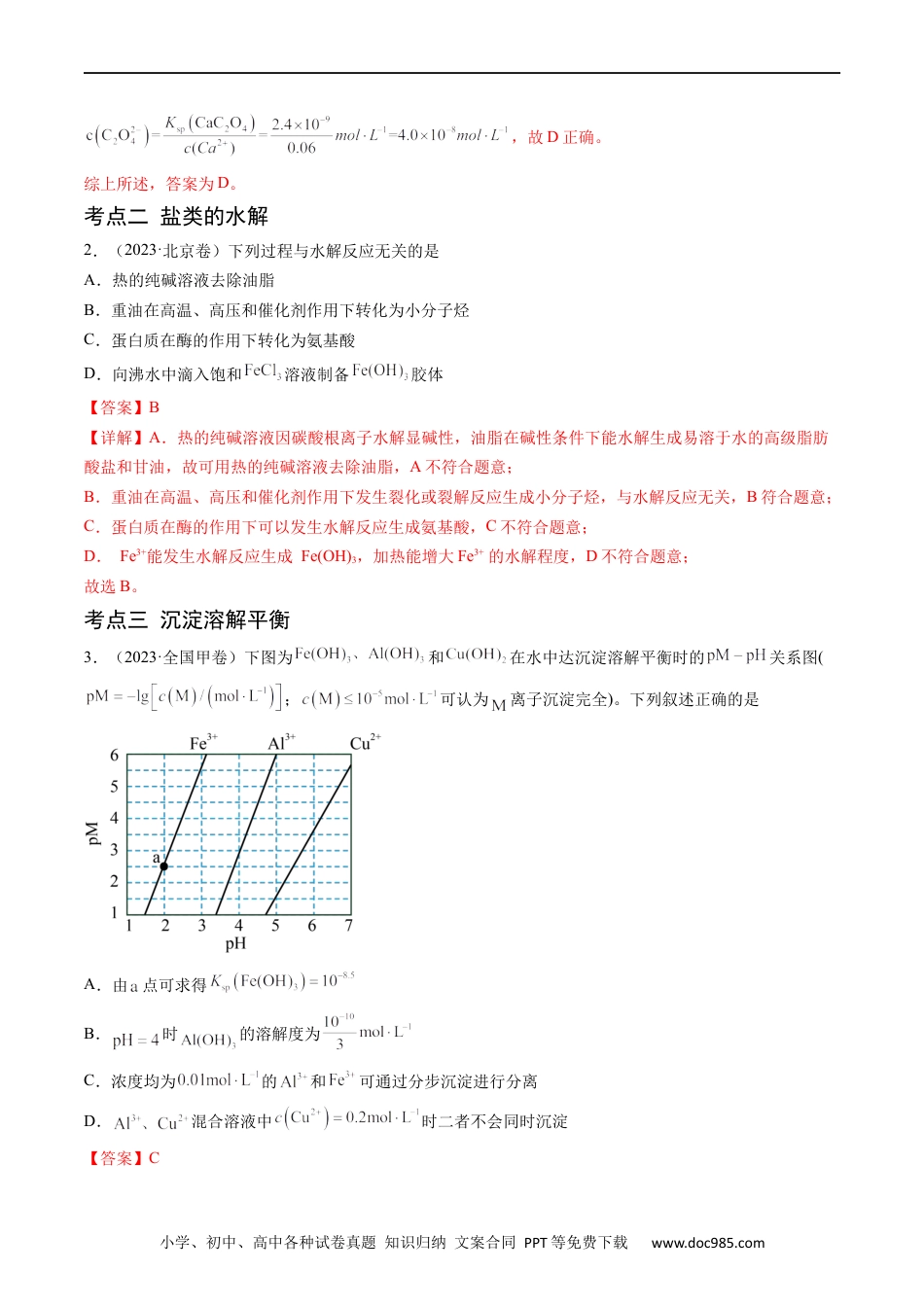 小学、初中、高中各种试卷真题知识归纳文案合同PPT等免费下载www.doc985.com五年(2019-2023)年高考真题分项汇编专题10水溶液中的离子反应与平衡〖2023年高考真题〗考点一电离平衡1.(2023·浙江卷)草酸()是二元弱酸。某小组做如下两组实验:实验I:往溶液中滴加溶液。实验Ⅱ:往溶液中滴加溶液。[已知:的电离常数,溶液混合后体积变化忽略不计],下列说法正确的是A.实验I可选用甲基橙作指示剂,指示反应终点B.实验I中时,存在C.实验Ⅱ中发生反应D.实验Ⅱ中时,溶液中【答案】D【详解】A.溶液被氢氧化钠溶液滴定到终点时生成显碱性的草酸钠溶液,为了减小实验误差要选用变色范围在碱性范围的指示剂,因此,实验I可选用酚酞作指示剂,指示反应终点,故A错误;B.实验I中时,溶质是、且两者物质的量浓度相等,,,则草酸氢根的电离程度大于草酸根的水解程度,因此存在,故B错误;C.实验Ⅱ中,由于开始滴加的氯化钙量较少而过量,因此该反应在初始阶段发生的是,该反应的平衡常数为,因为平衡常数很大,说明反应能够完全进行,当完全消耗后,再和发生反应,故C错误;D.实验Ⅱ中时,溶液中的钙离子浓度为,溶液中小学、初中、高中各种试卷真题知识归纳文案合同PPT等免费下载www.doc985.com,故D正确。综上所述,答案为D。考点二盐类的水解2.(2023·北京卷)下列过程与水解反应无关的是A.热的纯碱溶液去除油脂B.重油在高温、高压和催化剂作用下转化为小分子烃C.蛋白质在酶的作用下转化为氨基酸D.向沸水中滴入饱和溶液制备胶体【答案】B【详解】A.热的纯碱溶液因碳酸根离子水解显碱性,油脂在碱性条件下能水解生成易溶于水的高级脂肪酸盐和甘油,故可用热的纯碱溶液去除油脂,A不符合题意;B.重油在高温、高压和催化剂作用下发生裂化或裂解反应生成小分子烃,与水解反应无关,B符合题意;C.蛋白质在酶的作用下可以发生水解反应生成氨基酸,C不符合题意;D.Fe3+能发生水解反应生成Fe(OH)3,加热能增大Fe3+的水解程度,D不符合题意;故选B。考点三沉淀溶解平衡3.(2023·全国甲卷)下图为和在水中达沉淀溶解平衡时的关系图(;可认为离子沉淀完全)。下列叙述正确的是A.由点可求得B.时的溶解度为C.浓度均为的和可通过分步沉淀进行分离D.混合溶液中时二者不会同时沉淀【答案】C小学、初中、高中各种试卷真题知识归纳文案合同PPT等免费下载www.doc985.com【详解】A.由点a(2,2.5)可知,此时pH=2,pOH=12,则===,故A错误;B.由点(5,6)可知,此时pH=5,pOH=9,则===,时的溶解度为=10-3,故B错误;C.由图可知,当铁离子完全沉淀时,铝离子尚未开始沉淀,可通过调节溶液pH的方法分步沉淀和,故C正确;D.由图可知,沉淀完全时,,pM5,此时pH约为4.7,在此pH下刚开始沉淀的浓度为,而题中>,则会同时沉淀,故D错误;答案选C。4.(2023·全国乙卷)一定温度下,AgCl和Ag2CrO4的沉淀溶解平衡曲线如图所示。下列说法正确的是A.a点条件下能生成Ag2CrO4沉淀,也能生成AgCl沉淀B.b点时,c(Cl-)=c(CrO),Ksp(AgCl)=Ksp(Ag2CrO4)C.Ag2CrO4+2Cl-2AgCl+CrO的平衡常数K=107.9D.向NaCl、Na2CrO4均为0.1mol·L-1的混合溶液中滴加AgNO3溶液,先产生Ag2CrO4沉淀【答案】C【分析】根据图像,由(1.7,5)可得到Ag2CrO4的溶度积Ksp(Ag2CrO4)=c2(Ag+)·c(CrO)=(1×10-5)2×1×10-1.7=10-11.7,由(4.8,5)可得到AgCl的溶度积Ksp(AgCl)=c(Ag+)·c(Cl)=1×10-5×1×10-4.8=10-9.8,据此数据计算各选项结果。【详解】A.假设a点坐标为(4,6.5),此时分别计算反应的浓度熵Q得,Q(AgCl)=10-10.5,Q(Ag2CrO4)=10-17,二者的浓度熵均小于其对应的溶度积Ksp,二者不会生成沉淀,A错误;B.Ksp为难溶物的溶度积,是一种平衡常数,平衡常数只与温度有关,与浓度无关,根据分析可知,二者的溶度积不相同,B错误;小学、初中、高中各种试卷真题知识归纳文案合同PPT等免费下载www.doc985.comC.该反应的平衡常数表达式为K=,将表达式转化为与两种难溶物的溶度积有关的式子得K=====1×107.9,C正确;D.向NaCl、Na2CrO4均为0.1mol·L-1的混合溶液中滴加AgNO3,开始沉淀时所需要的c(Ag+)分别为10-8...