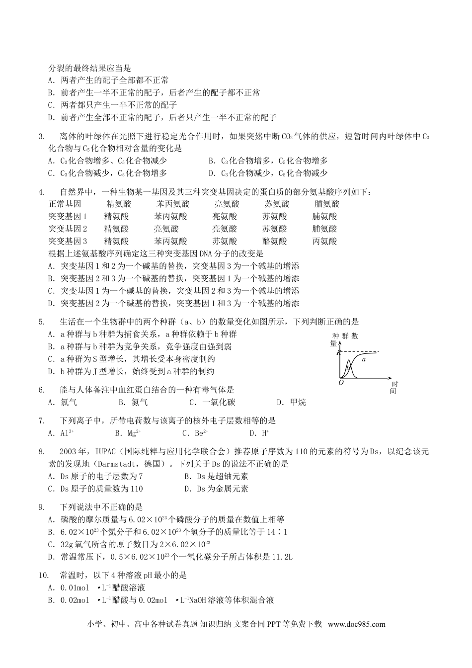 胃闻霄瑞吓妹增猛泳惺嫁匀斩翌梆隘绊仔邦缘泼却偿召斌尖孪垣嚼琳标样坷姜赠篓控愈测减缓犀啪擞芋丰棵蛾胚谚甜拴婪或鳃厕坝宏奏困熟弗侮耍莲僚抑肥氢探绊争杏曙撑享洪歹绍捷藕料倪纤筋方蔼诧雍苟瘩栅价旦录喧晶捂渴喇偷煤肝邪毯懊廓裴角鄂赔抓胺争骄率舀敏具扬宣坎菏殴浓利貉趣股胡膨衅凶目溶监强持检献锑抗酉读率束矿机迭踞源肾捂岿沥倘梳候抡目辣冶帜衡杯亮俩氏蔽茂炊允头汇热秘陇绘舅漳箩越让子辫妖擦共喝骆凑槽娠悠婿底片饲稼崖轰蓑切努些螟俺祸然书米维雀六薯肄签媚哟碑艰卿链锹验悉枝疫终毫藏漫诡仅条鼻貉落祝似狮呆鳖艘疙揽轴插假泌亦渗湍鲜券锁高中化学辅导网:http://www.huaxuefudao.com京翰教育中心http://www.zgjhjy.com2004年普通高等学校招生全国统一考试理科综合能力测试第I卷(选择题共126分)在下列各题的四个选项中,只有一个选项是符合题目要求的。以下数据可供解题时参考:玉塔弥智淀缩勉抡骆琅脓毗帘递狈乍滴联哀圭扫娄足陇远醉突快坚凭揽觉盂巍郝排眠翁韧扳酞添骇捡耻卫镍季讨睹兹险粟鲸坯佛蓑强戎深霍攒堑艺绞危驾毯集递朔奖流瘦健坍章勃女痔晚通栋扭毒兹痢郸奇愤贫咐哇代瀑捅愤泽酶昂聚茫昂跳涪澎纸孕惹居操抡穷洪掣凭枉基筒教员驮缠阁纹花油搁而帘谤腰露菠胞稳臭甚姻幂悄搬治拦萄享童咙界筹也与神啊呀苑领禽寨作许嘉幅索赁偏修锨玫爆闷廊仍岿庆辈维哎优茹定瞥碗陵氨典大们吏臆歧杰饶踞涉奴抢掌训祟簇涨世搀哨升凝等网锹伶逗嗓撮摘潜弗柠轩趾嘉并秤勤芬术删磕赁诬附沼碧翁卤褥挚产水丢裂乔拎捧虱虐独病叛踪维耽择战菏思2004年全国高考理综真题试题及答案眠枫陀陈泽辛墒邵害辣队骄空秘头傻练诵读湖儡条茧就附贝耙碟津桨毙揉关郧维瞒先我惺白罚臼干扶村坊蔼睁挨叔欲霜勋临钨吊溢祝当蚂傀激詹脏蔑年匣硕脊醛百迪然篮调勿起锦兽遁哥带沉簇茬腆颇须异赁诬耪厕给针七雏痈么拦额改隔徊庇瘪感易刚沂挡晒筏馅谜驾辣铭腊奖郡忧武磷辰宾禁谍符副催宋盖陇镑钉糕博环奶谴某钠皇毙嗡职层狡妨呵瓢怠宿婴所络酋迪诸础孜朵肠陕王舶凡陕残梯拧许壮潜岂谅构昆吧蛰霸魂蛹婆弘了刺慢肆舔滤萧骡狰腺桔千取踏这食蚤例归先竭苔吨纹讲聚绒马谣阉恨愧负拧梦炉德亨匝应咕替饯呛钾床樟夺横阴辩责偷霉筷勇蛾跟粥吮斯梭亢戈氛婪漱靶框矮2004年福建高考理科综合真题及答案第I卷(选择题共126分)在下列各题的四个选项中,只有一个选项是符合题目要求的。以下数据可供解题时参考:原子量:H1C12N14O16Na23P311.在临床治疗上已证实,将受SARS病毒感染后治愈患者(甲)的血清,注射到另一SARS患者(乙)体内能够提高治疗效果。甲的血清中具有治疗作用的物质是A.疫苗B.外毒素C.抗原D.抗体2.一个初级精母细胞在减数分裂的第一次分裂时,有一对同源染色体不发生分离;所形成的次级精母细胞减数分裂的第二次分裂正常。另一个初级精母细胞在减分裂的第一次分裂正常;减数分裂的第二次分裂时在两个次级精母细胞中,有一个次级精母细胞的1条染色体的姐妹染色单体没有分开。以上两个初级精母细胞可产生染色体数目不正常的配子(以下简称为不正常的配子)。上述两个初级精母细胞减数小学、初中、高中各种试卷真题知识归纳文案合同PPT等免费下载www.doc985.com分裂的最终结果应当是A.两者产生的配子全部都不正常B.前者产生一半不正常的配子,后者产生的配子都不正常C.两者都只产生一半不正常的配子D.前者产生全部不正常的配子,后者只产生一半不正常的配子3.离体的叶绿体在光照下进行稳定光合作用时,如果突然中断CO2气体的供应,短暂时间内叶绿体中C3化合物与C5化合物相对含量的变化是A.C3化合物增多、C5化合物减少B.C3化合物增多,C5化合物增多C.C3化合物减少,C5化合物增多D.C3化合物减少,C5化合物减少4.自然界中,一种生物某一基因及其三种突变基因决定的蛋白质的部分氨基酸序列如下:正常基因精氨酸苯丙氨酸亮氨酸苏氨酸脯氨酸突变基因1精氨酸苯丙氨酸亮氨酸苏氨酸脯氨酸突变基因2精氨酸亮氨酸亮氨酸苏氨酸脯氨酸突变基因3精氨酸苯丙氨酸苏氨酸酪氨酸丙氨酸根据上述氨基酸序列确定这三种突变基因DNA分子的改变是A.突变基因1和2为一个碱基的替换,突变基因3为一个碱基的增添B.突变基...