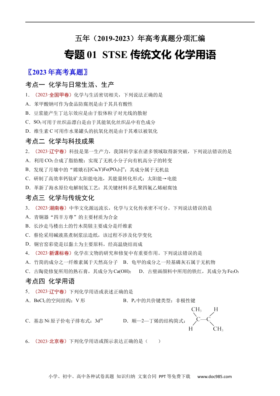 小学、初中、高中各种试卷真题知识归纳文案合同PPT等免费下载www.doc985.com五年(2019-2023)年高考真题分项汇编专题01STSE传统文化化学用语〖2023年高考真题〗考点一化学与日常生活、生产1.(2023·全国甲卷)化学与生活密切相关,下列说法正确的是A.苯甲酸钠可作为食品防腐剂是由于其具有酸性B.豆浆能产生丁达尔效应是由于胶体粒子对光线的散射C.SO2可用于丝织品漂白是由于其能氧化丝织品中有色成分D.维生素C可用作水果罐头的抗氧化剂是由于其难以被氧化考点二化学与科技成果2.(2023·辽宁卷)科技是第一生产力,我国科学家在诸多领域取得新突破,下列说法错误的是A.利用CO2合成了脂肪酸:实现了无机小分子向有机高分子的转变B.发现了月壤中的“嫦娥石[(Ca8Y)Fe(PO4)7]”:其成分属于无机盐C.研制了高效率钙钛矿太阳能电池,其能量转化形式:太阳能→电能D.革新了海水原位电解制氢工艺:其关键材料多孔聚四氟乙烯耐腐蚀考点三化学与传统文化3.(2023·湖南卷)中华文化源远流长,化学与文化传承密不可分。下列说法错误的是A.青铜器“四羊方尊”的主要材质为合金B.长沙走马楼出土的竹木简牍主要成分是纤维素C.蔡伦采用碱液蒸煮制浆法造纸,该过程不涉及化学变化D.铜官窑彩瓷是以黏土为主要原料,经高温烧结而成4.(2023·新课标卷)化学在文物的研究和修复中有重要作用。下列说法错误的是A.竹简的成分之一纤维素属于天然高分子B.龟甲的成分之一羟基磷灰石属于无机物C.古陶瓷修复所用的熟石膏,其成分为Ca(OH)2D.古壁画颜料中所用的铁红,其成分为Fe2O3考点四化学用语5.(2023·辽宁卷)下列化学用语或表述正确的是A.BeCl2的空间结构:V形B.P4中的共价键类型:非极性键C.基态Ni原子价电子排布式:3d10D.顺—2—丁烯的结构简式:6.(2023·北京卷)下列化学用语或图示表达正确的是()小学、初中、高中各种试卷真题知识归纳文案合同PPT等免费下载www.doc985.comA.的电子式为B.的VSEPR模型为C.电子云图为D.基态原子的价层电子轨道表示式为7.(2023·浙江卷)下列化学用语表示正确的是A.分子的球棍模型:B.的价层电子对互斥模型:C.的电子式:D.的名称:3−甲基戊烷8.(2023·湖南卷)下列化学用语表述错误的是A.HClO的电子式:B.中子数为10的氧原子:OC.NH3分子的VSEPR模型:D.基态N原子的价层电子排布图:9.(2023·湖北卷)化学用语可以表达化学过程,下列化学用语的表达错误的是A.用电子式表示的形成:B.用离子方程式表示溶于烧碱溶液:C.用电子云轮廓图表示H-H的s-sσ键形成的示意图:D.用化学方程式表示尿素与甲醛制备线型脲醛树脂:小学、初中、高中各种试卷真题知识归纳文案合同PPT等免费下载www.doc985.com10.(2023·全国乙卷)一些化学试剂久置后易发生化学变化。下列化学方程式可正确解释相应变化的是A硫酸亚铁溶液出现棕黄色沉淀B硫化钠溶液出现浑浊颜色变深C溴水颜色逐渐褪去D胆矾表面出现白色粉末11.(2023·辽宁卷)下列有关物质的工业制备反应错误的是A.合成氨:N2+3H22NH3B.制HCl:H2+Cl22HClC.制粗硅:SiO2+2CSi+2COD.冶炼镁:2MgO(熔融)2Mg+O2↑12.(2023·湖南卷)下列有关电极方程式或离子方程式错误的是A.碱性锌锰电池的正极反应:MnO2+H2O+e-=MnO(OH)+OH-B.铅酸蓄电池充电时的阳极反应:Pb2++2H2O-2e-=PbO2+4H+C.K3[Fe(CN)6]溶液滴入FeCl2溶液中:K++Fe2++[Fe(CN)6]3-=KFe[Fe(CN)6]↓D.TiCl4加入水中:TiCl4+(x+2)H2O=TiO2·xH2O↓+4H++4Cl-〖2022年高考真题〗考点一化学与日常生活13.(2022·全国乙卷)生活中处处有化学,下列叙述正确的是A.HB铅笔芯的成分为二氧化铅B.碳酸氢钠可做食品膨松剂C.青铜和黄铜是不同结构的单质铜D.焰火中红色来源于钠盐灼烧14.(2022·全国甲卷)化学与生活密切相关。下列叙述正确的是A.漂白粉与盐酸可混合使用以提高消毒效果B.温室气体是形成酸雨的主要物质C.棉花、麻和蚕丝均为碳水化合物D.干冰可用在舞台上制造“云雾”考点三化学与科技成果15.(2022·天津卷)近年我国在科技领域不断取得新成就。对相关成就所涉及的化学知识理解错误的是A.我国科学...