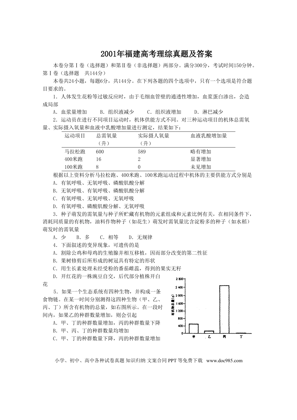 2001年福建高考理综真题及答案本卷分第Ⅰ卷(选择题)和第Ⅱ卷(非选择题)两部分。满分300分,考试时间150分钟。第Ⅰ卷(选择题共144分)本卷共24小题,每题6分,共144分。在下列各题的四个选项中,只有一个选项是符合题目要求的。1.人体发生花粉等过敏反应时,由于毛细血管壁的通透性增加,血浆蛋白渗出,会造成局部A.血浆量增加B.组织液减少C.组织液增加D.淋巴减少2.运动员在进行不同项目运动时,机体供能方式不同。对三种运动项目的机体总需氧量、实际摄入氧量和血液中乳酸增加量进行测定,结果如下:运动项目总需氧量(升)实际摄人氧量(升)血液乳酸增加量马拉松跑600589略有增加400米跑162显著增加100米跑80未见增加根据以上资料分析马拉松跑、400米跑、100米跑运动过程中机体的主要供能方式分别是A.有氧呼吸、无氧呼吸、磷酸肌酸分解B.无氧呼吸、有氧呼吸、磷酸肌酸分解C.有氧呼吸、无氧呼吸、无氧呼吸D.有氧呼吸、磷酸肌酸分解、无氧呼吸3.种子萌发的需氧量与种子所贮藏有机物的元素组成和元素比例有关,在相同条件下,消耗同质量的有机物,油料作物种子(如花生)萌发时需氧量比含淀粉多的种子(如水稻)萌发时的需氧量A.少B.多C.相等D.无规律4.下面叙述的变异现象,可遗传的是A.割除公鸡和母鸡的生殖腺并相互移植,因而部分改变的第二性征B.果树修剪后所形成的树冠具有特定的形状C.用生长素处理未经受粉的番茄雌蕊,得到的果实无籽D.开红花的一株豌豆自交,后代部分植株开白花5.如果一个生态系统有四种生物,并构成一条食物链。在某一时间分别测得这四种生物(甲、乙、丙、丁)所含有机物的总量,如右图所示。在一段时间内,如果乙的种群数量增加,则会引起A.甲、丁的种群数量增加,丙的种群数量下降B.甲、丙、丁的种群数量均增加C.甲、丁的种群数量下降,丙的种群数量增加小学、初中、高中各种试卷真题知识归纳文案合同PPT等免费下载www.doc985.comD.甲的种群数量下降,丙、丁的种群数量增加6.当下列物质:①大理石②钟乳石③锅垢④贝壳⑤蛋壳,分别滴加醋酸时,会产生相同气体的A.只有①②B.只有④⑤C.只有①②③D.是①②③④⑤7.下列盛放试剂的方法正确的是A.氢氟酸或浓硝酸存放在带橡皮塞的棕色玻璃瓶中B.汽油或煤油存放在带橡皮塞的棕色玻璃瓶中C.碳酸钠溶液或氢氧化钙溶液存放在配有磨口塞的棕色玻璃瓶中D.氯水或硝酸银溶液存放在配有磨口塞的棕色玻璃瓶中8.下列各组物理量中,都不随取水量的变化而变化的是A.水的沸点;蒸发水所需热量B.水的密度;水中通人足量CO2后溶液的pHC.水的体积;电解水所消耗的电量D.水的物质的量;水的摩尔质量9.在一支25mL的酸式滴定管中盛入0.lmol·L-1HCl溶液,其液面恰好在5mL的刻度处,若把滴定管中的溶液全部放入烧杯中,然后以0.lmol·L-1NaOH溶液进行中和.则所需NaOH溶液的体积A.大于20mLB.小于20mLC.等于20mLD.等于5mL10.已知天然气的主要成份CH4是一种会产生温室效应的气体,等物质的量的CH4和CO2产生的温室效应,前者大。下面是有关天然气的几种叙述:①天然气与煤、柴油相比是较清洁的能源;②等质量的CH4和CO2产生的温室效应也是前者大;③燃烧天然气也是酸雨的成因之一。其中正确的A.是①、②、③B.只有①C.是①和②D.只有③11.具有单双键交替长链(如:…)的高分子有可能成为导电塑料。2000年诺贝尔(Nobel)化学奖即授予开辟此领域的3位科学家。下列高分子中可能成为导电塑料的是A聚乙烯B.聚丁二烯C.聚苯乙烯D.聚乙炔12.有一种磷的结构式是,有关它的下列叙述不正确的是A.它完全燃烧时的产物是P2O5B.它不溶于水C.它在常温下呈固态D.它与白磷互为同分异构体13.将ag含NaOH样品溶解在bmL0.lmol·L-1的硫酸中,再加入cmL0.1mol·L-1的氢氧化钡溶液,反应后所得溶液恰好呈中性,则样品中NaOH的纯度是(NaOH式量为40)A.[(b-c)/125a]×100%B.[(b-2c)/125a]×100%C.[(b-c)/250a]×100%D.[(8b-8c)/a]×100%小学、初中、高中各种试卷真题知识归纳文案合同PPT等免费下载www.doc985.com14.已知化合物B3N3H6(硼氮苯)与C6H6(苯)的分子结构相似...