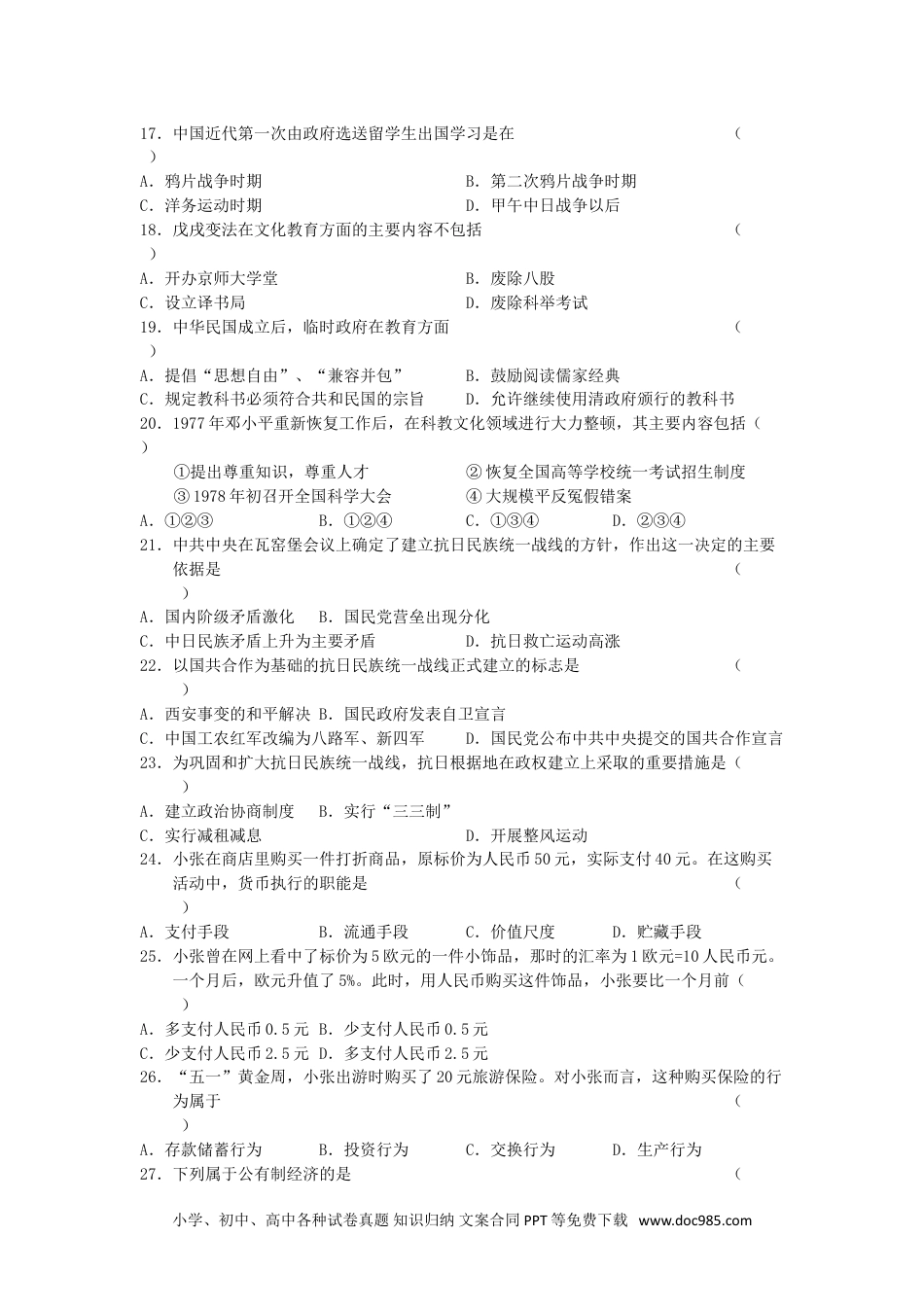 2005年新疆高考文科综合真题及答案本试卷分为第Ⅰ卷(选择题)和第Ⅱ卷(非选择题)两部分.第I卷1至7页,第Ⅱ卷8至14页。考试结束后,将本试卷和答题卡一并交回。第I卷注意事项:1.答第I卷前,考生务必将自己的姓名、准考证号、考试科目涂写在答题卡上.2.每小题选出答案后,用铅笔把答题卡上对应题目的答案标号涂黑.如需改动,用橡皮擦干净后,再选涂其它答案标号.不能答在试题卷上.3.本卷共35小题,每小题4分,共140分.在每小题给出的四个选项中,只有一项是符合题目要求的.2004年7月28日我国第一个北极科学考察站——黄河站(78°55′N,11°56′E)建成。据此回答1—2题。1.从黄河站往正南方,将到达()A.斯堪的纳维亚半岛B.西伯利亚C.阿拉斯加D.大不列颠岛2.黄河站至北极点的距离约为()A.600千米B.900千米C.1200千米D.1500千米2005年3月28日23时9分(东7区区时),印度尼西亚的尼亚斯岛附近海域发生8.7级强烈地震。不久又相继在该岛西略偏北100千米海底和该岛正南约190千米海底发生强烈余震,这些地震均发生在靠近两大板块界线的地方,据此回答3—5题。3.该8.7级地震发生时,纽约(西5区)为()A.29日10时9分B.27日11时9分C.27日12时9分D.28日11时9分4.该岛附近作为板块边界的海沟的走向为()A.东西向B.东北——西南向C.南北向D.西北——东南向5.该海沟两侧的板块是()A.亚欧板块、太平洋板块B.南极洲板块、印度洋板块C.亚欧板块、印度洋板块D.印度洋板块、非洲板块图1表示世界四个地点的气温降水状况。据此回答6—9题。6.位于热带气候区的地点是()A.①B.②C.③D.④小学、初中、高中各种试卷真题知识归纳文案合同PPT等免费下载www.doc985.com7.位于南半球的地点是()A.①B.②C.③D.④8.位于地中海气候区的地点是()A.①②B.②③C.③④D.④①9.位于中高纬度大陆东岸的地点是()A.①B.②C.③D.④图2表示中国、日本、韩国2000年度某贸易关系,图中箭头①—⑥表示贸易方向,相应的贸易量见表1,据此回答10—11题。表1①②③④⑤⑥(单位:吨)2909133692821558082472773610.甲、乙、丙代表的国家依次是()A.韩国、日本、中国B.日本、中国、韩国C.日本、韩国、中国D.中国、韩国、日本11.甲国每年大量进口蔬菜的原因之一是()A.气候不适宜种植蔬菜B.农业用地比例小、蔬菜种植成本高C.山地众多,交通不便D.生产力水平较低,农业粗放在中国历史上,可以经常见到各种思想文化之间的相互借鉴和吸收,回答12—15题12.南北朝时期,陶弘景建立起道教的神仙体系,其中吸收了()A.佛教教义B.法家思想C.墨子学说D.《神灭论》的观点13.宋代以朱熹为代表的新儒学所吸收的思想是()A.佛教和道教思想B.法家思想和“经世致用”学说C.佛教、通教和法家思想D.佛教思想和“经世致用”学说14.为了推翻清朝的统治,洪秀全创立拜上帝教,其教义综合了多种思想,主要有()①西方基督教教义②资产阶级启蒙思想③农民的平均主义④儒家大同思想A.①②③B.①②④C.①③④D.②③④15.康有为的维新思想吸收了西方资本主义政治学说的内容,其中最主要的是()A.民主共和思想B.三权分立学说C.君主立宪思想D.人文主义思想16.派遣留学生到唐朝学习先进文化,推动了本国政治经济改革的国家是()A.天竺B.日本C.暹罗D.波斯小学、初中、高中各种试卷真题知识归纳文案合同PPT等免费下载www.doc985.com17.中国近代第一次由政府选送留学生出国学习是在()A.鸦片战争时期B.第二次鸦片战争时期C.洋务运动时期D.甲午中日战争以后18.戊戌变法在文化教育方面的主要内容不包括()A.开办京师大学堂B.废除八股C.设立译书局D.废除科举考试19.中华民国成立后,临时政府在教育方面()A.提倡“思想自由”、“兼容并包”B.鼓励阅读儒家经典C.规定教科书必须符合共和民国的宗旨D.允许继续使用清政府颁行的教科书20.1977年邓小平重新恢复工作后,在科教文化领域进行大力整顿,其主要内容包括()①提出尊重知识,尊重人才②恢复全国高等学校统一考试招生制度③1978年初召开全国科学大会④大规模平反冤假错...