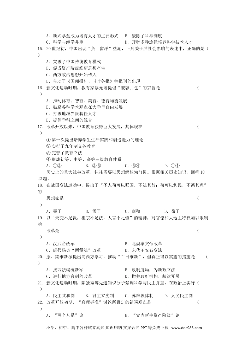 2001年新疆高考文综真题及答案第Ⅰ卷(共140分)一、本卷共35小题,每小题4分,共计140分。在每小题列出的四个选项中,只有一项是符合题目要求的。图1中阴影表示黑夜。读图1判断1—2题。1.图示的时刻前后数日内()A.漠河的白天比广州长B.南极长城站处于极昼时期C.密西西比河处于枯水期D.硅谷地区天气干热2.图示的时刻,北京时间是()A.8时20分B.20时20分C.9时40分D.21时40分下表中人口数、GDP、铁路长度为1999年资料。读下表,回答3—8题。云南贵州陕西甘肃青海人口(万人)4192371036182543510GDP(亿元)18569121488932238铁路长度(km)18731654194123231092年均降水量(mm)1000—15001100—1400500—100030—86020—700面积(万km2)38171939723.按人口密度从大到小排列,各省依次是()A.青海、甘肃、陕西、贵州、云南B.贵州、陕西、云南、甘肃、青海C.陕西、云南、贵州、甘肃、青海D.云南、贵州、陕西、甘肃、青海4.各省人均GDP远低于全国人均6350元的水平,其中()A.云南的人均GDP约为5500元B.青海的人均GDP最接近全国平均水平C.贵州的人均GDP仅达全国平均水平的50%D.陕西的人均GDP约为4100元5.各地区降水存在差异()A.青海因海拔高且多山而少雨B.陕西的纬度介于云、贵和甘、青之间,故降水量也居中C.云、贵秋季有丰沛的西南季风雨D.甘肃部分地区处于非季风区,故降水量较少小学、初中、高中各种试卷真题知识归纳文案合同PPT等免费下载www.doc985.com图16.交通一直是限制这些地区发展的因素。青海省单位面积铁路线为15km/万km2,仅为全国平均水平的30%,为改变此状况,“十五”期间将建成()A.青藏铁路B.青新铁路C.兰青铁路D.川青铁路7.要改变上述地区经济发展的落后状况,地方政府应当因地制宜,制定相应的发展战略,这其中蕴含的哲学道理是()A.一切从实际出发,实事求是B.实践是认识发展的源泉和目的C.发挥意识的主观能动作用D.外因必须通过内因起作用8.为促进上述地区的经济发展,国家首先应采取的措施是()A.加强行政管理职能B.加快基础设施建设C.大力吸引外部资金D.组织劳力外出打工图2为世界地图上的一段纬线。P点以西为海洋,Q点以东为海洋,PQ为陆地。读图2,判断9—12题。9.PQ线位于()A.北半球,东半球B.南半球,西半球C.北半球,西半球D.南半球,东半球10.下列四项,属于X地所在国的是()A.大堡礁B.泰姬陵C.好望角D.格林尼治天文台11.北京一年中雨量最多的季节,X地()A.每月降水量在10毫米以下B.盛行东北季风C.时逢干季D.气旋活动频繁12.Y地所在国()A.处于环太平洋火山、地震带B.东岸附近海域有寒流流过C.是世界主要的小麦生产和出口国之一D.是世界主要水稻生产国之一中国教育有着辉煌的历史,自孔子兴学以来,教育发展与社会变迁息息相关。根据相关历史常识,回答13—17题。13.宋代教育的特点是()A.书院在教育体制中占据重要地位B.严格控制思想,不允许学生发表不同见解C.学校教育未受变法运动的影响D.道德培养与能力培养并重14.19世纪后半期,中国教育发生了历史性变化()小学、初中、高中各种试卷真题知识归纳文案合同PPT等免费下载www.doc985.com30.5°(纬度)QYXP120°E135°E150°E图2A.新式学堂成为培育人才的主要形式B.废除了科举制度C.科学与经学并重D.开辟多种途径培养科学技术人才15.20世纪初,中国出现“负留洋”热潮,下列关于其社会影响的表述中,正确的是()A.突破了中国传统教育模式B.促成资产阶级维新思想产生C.西方政治思想开始传人D.带动了《国闻报》、《时务报》等报刊的出现16.新文化运动时期,教育家蔡元培提倡“兼容并包”的宗旨是()A.推动体育、智育、美育、德育均衡发展B.鼓励各种学术观点在大学里自由发展C.打破地域界限聘任人才D.提倡学科之间的综合17.改革开放以来,中国教育获得巨大发展,其体现在()①第一次提出培养学生生活实践和创造能力的理论②实行了九年制义务教育③完善了教育立法④形成初等、中等、高等三级教育体系A.①②B.②③C.③④D.①④历史上的重大社会改革,往往需要以思想解放为前提。根据相关历史知...