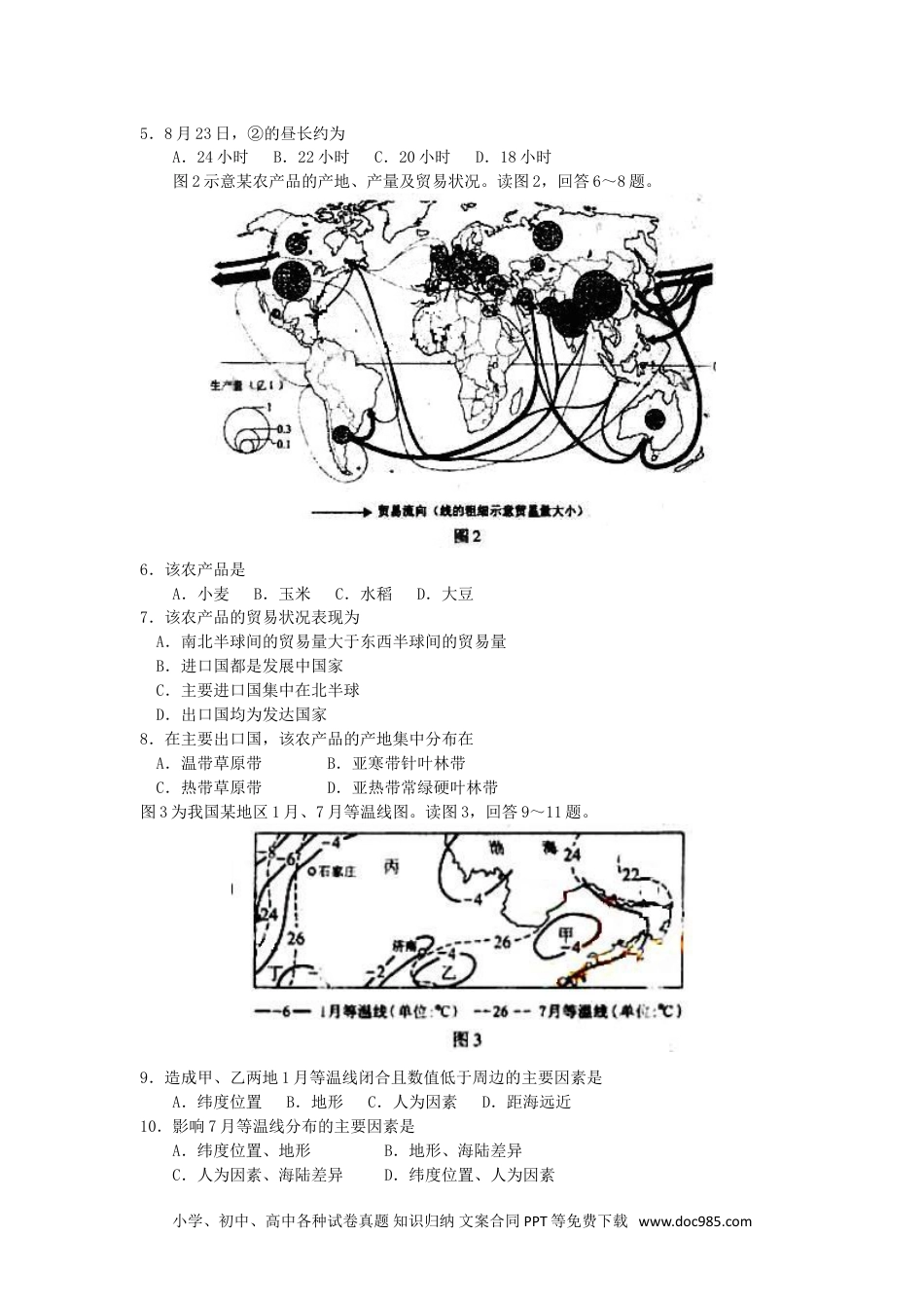 2006年吉林高考文综真题及答案本试卷分选择题和非选择题两部分,共40题,共300分,共13页。考试结束后,将本试卷和答题卡一并交回。注意事项:1.答题前,考生现将自己的姓名、准考证号填写清楚,将条形码准确粘贴在条形码区域内。2.选择题必须使用2B铅笔填涂;非选择题必须使用0.5毫米黑色字迹的签字笔书写,字体工整、笔迹清楚。3.请按照题号顺序在各题目的答题区域作答,超出答题区域书写的答案无效;在草稿纸、试题卷上答题无效。4.作图可先使用铅笔画出,确定后必须用黑色字迹的签字笔描黑。5.保持卡面清洁,不要折叠、不要弄破、弄皱,不准使用涂改液、修正带、刮纸刀。选择题(选择题(选择题共35小题,每小题4分,共140分。在每小题给出的四个选项中,只有一项是最符合题目要求的。)自20世纪80年代以来,香港的劳动密集型制造企业大量迁入内地。回答1~2题。1.这种产业迁移A.是第三产业的迁移B.是技术指向型产业的迁移C.阻碍了迁入地的城市进程D.可能对迁入地的环境造成污染2.香港制造企业迁移的原因有①香港地价较高②内地服务业发达③内地工资水平较低④香港人口数量剧减A.①②B.①③C.②③D.②④图1四条曲线分别示意四地3月21日到6月30日的日出时间。读图1,回答3~5题。3.与摩尔曼斯克地区日出时间对应的曲线是A.①B.②C.③D.④4.④地位于A.南半球中纬度B.北半球低纬度C.副热带高压带D.副极地低压带小学、初中、高中各种试卷真题知识归纳文案合同PPT等免费下载www.doc985.com5.8月23日,②的昼长约为A.24小时B.22小时C.20小时D.18小时图2示意某农产品的产地、产量及贸易状况。读图2,回答6~8题。6.该农产品是A.小麦B.玉米C.水稻D.大豆7.该农产品的贸易状况表现为A.南北半球间的贸易量大于东西半球间的贸易量B.进口国都是发展中国家C.主要进口国集中在北半球D.出口国均为发达国家8.在主要出口国,该农产品的产地集中分布在A.温带草原带B.亚寒带针叶林带C.热带草原带D.亚热带常绿硬叶林带图3为我国某地区1月、7月等温线图。读图3,回答9~11题。9.造成甲、乙两地1月等温线闭合且数值低于周边的主要因素是A.纬度位置B.地形C.人为因素D.距海远近10.影响7月等温线分布的主要因素是A.纬度位置、地形B.地形、海陆差异C.人为因素、海陆差异D.纬度位置、人为因素小学、初中、高中各种试卷真题知识归纳文案合同PPT等免费下载www.doc985.com11.下列四组地方,气温年较差相差最大的是A.甲地、黄河口附近B.石家庄福建、黄海沿岸C.丙地、乙地D.甲地、丁地近代以来,中国经历了从遭受列强宰割到国家强盛的历程。回答12~15题。12.英国通过《虎门条约》取得了“片面最惠国待遇”,这意味着:A.英国取得了在中国东南沿海通商口岸进行贸易的特权。B.其他列强从中国攫取的各项特权,英国可以援例享有。C.英国取得了独占中国内地市场的贸易特权。D.英国取得了与中国共同商定中国关税税率的特权。13.《马关条约》签订后,列强对华经济侵略进入一个新阶段。这主要体现在A.列强强迫清政府承担巨赔款B.列强势力开始进入中国腹地C.列强从商品输出为主转为资本输出为主D.列强开始争夺在华路矿权14.南京临时政府成立后,承认清政府与列强签订的一些不平等条约,其目的是A.打破列强的外交封锁B.换取列强的支持C.尽快稳定国内政局D.争取列强严守中立15.1971年10月,第26届联合国大会通过决议:“恢复中华人民共和国(在联合国)的一切权利……”决议使用“恢复”一词的原因是①中国是《联合国家宣言》的签字国②中国是《联合国宪章》的签字国③中华人民共和国在联合国的合法席位长期被剥夺④中华人民共和国政府是中国的唯一合法政府A.①②③B.①②④C.①③④D.②③④工业化需要大量的资金,各国工业化资金的来源有所不同。回答16—19题16.在第一次工业革命中,从殖民地掠夺财富最多并将其用于工业化的国家最有可能是A.英国B.法国C.美国D.俄国17.19世纪60年代—90年代是中国近代工业化的早期阶段。下列关于该阶段工业资金来源的表述,正确的是A.军事工业的资金最初来自官办民用企业B.民用工业的资金最初来...