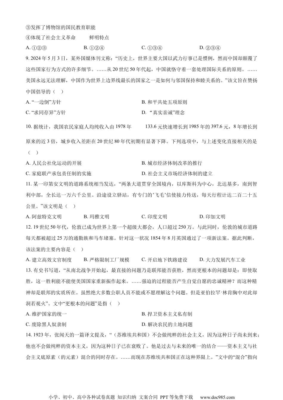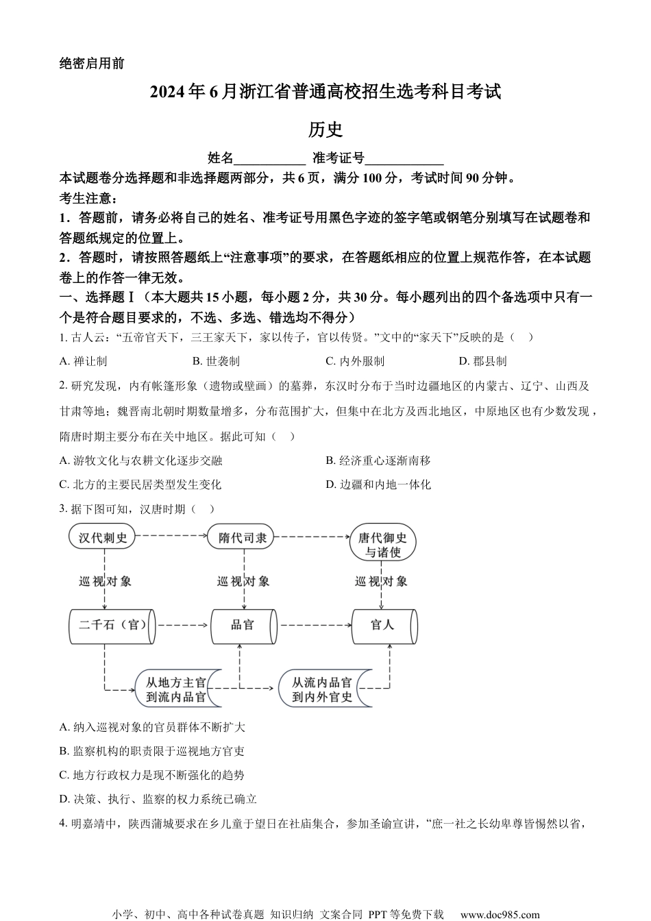 小学、初中、高中各种试卷真题知识归纳文案合同PPT等免费下载www.doc985.com绝密启用前2024年6月浙江省普通高校招生选考科目考试历史姓名___________准考证号____________本试题卷分选择题和非选择题两部分,共6页,满分100分,考试时间90分钟。考生注意:1.答题前,请务必将自己的姓名、准考证号用黑色字迹的签字笔或钢笔分别填写在试题卷和答题纸规定的位置上。2.答题时,请按照答题纸上“注意事项”的要求,在答题纸相应的位置上规范作答,在本试题卷上的作答一律无效。一、选择题Ⅰ(本大题共15小题,每小题2分,共30分。每小题列出的四个备选项中只有一个是符合题目要求的,不选、多选、错选均不得分)1.古人云:“五帝官天下,三王家天下,家以传子,官以传贤。”文中的“家天下”反映的是()A.禅让制B.世袭制C.内外服制D.郡县制2.研究发现,内有帐篷形象(遗物或壁画)的墓葬,东汉时分布于当时边疆地区的内蒙古、辽宁、山西及甘肃等地;魏晋南北朝时期数量增多,分布范围扩大,但集中在北方及西北地区,中原地区也有少数发现,隋唐时期主要分布在关中地区。据此可知()A.游牧文化与农耕文化逐步交融B.经济重心逐渐南移C.北方的主要民居类型发生变化D.边疆和内地一体化3.据下图可知,汉唐时期()A.纳入巡视对象的官员群体不断扩大B.监察机构的职责限于巡视地方官吏C.地方行政权力是现不断强化的趋势D.决策、执行、监察的权力系统已确立4.明嘉靖中,陕西蒲城要求在乡儿童于望日在社庙集合,参加圣谕宣讲,“庶一社之长幼卑尊皆惕然以省,小学、初中、高中各种试卷真题知识归纳文案合同PPT等免费下载www.doc985.com翕然以悟,而无悖德悖礼者也”。雍正十年(1732)以后,清朝在湖南永绥、粤东等少数民族聚居区开设义学,宣讲《圣谕广训》,使苗、黎儿童渐知礼义,然后课以经书。这可以反映出明清时期()A.儒学开始渗透基层B.儿童的教化受到重视C.边疆局势日趋稳固D.乡约与法律逐渐合流5.1875年,《申报》评论某经济实体时写道:“夫贸易可以设立公司者,其需本总在数百万与数十万也,故无论至富之家可以与分,即中下之产亦可以与分。盖每股份出银多则千两,少则百两,必须数百十人以共集成。”次年,又评论“其生意之兴隆几将与西船并驾齐驱”。该经济实体是()A.上海平准股票公司B.先施百货公司C.轮船招商局D.福州船政局6.在中国共产党发起的一次重大战役中,广大农民一致表示:“反蒋、保田、保饭碗!”“要人出人,要钱出钱,要粮出粮!”战士队列里常回响着歌声:“翻了身,上前线,个个都是英雄汉。浩浩荡荡出山东,鲁苏豫皖都走遍。”此战役发生在()A.北伐战争时期B.红军长征时期C.全面抗战时期D.解放战争时期7.1938年,《抗战漫画》第1期刊登了一幅漫画(见下图)。下列标题中,最契合漫画主题的是()A.《全世界起来打鬼子》B.《远东之恶魔,人类之公敌》C.《击破敌人侵略的迷梦》D.《大丈夫不怕死,好男儿要当兵》8.新中国成立初期,内务部公布《革命烈士家属、革命军人家属优待暂行条例》《关于评选烈属军属、革命残废军人、复员军人模范及拥军优属模范的指示》等政策法规。同时,各地博物馆积极征集革命文物,如北京大学博物馆多方搜集革命史料充实李大钊烈士纪念室的陈列,汉口烈士博物馆征集董存瑞等烈士的遗物与事迹并展陈。这些举措()①弘扬了英勇奋斗的革命传统②涵育了人民群众的家国情怀小学、初中、高中各种试卷真题知识归纳文案合同PPT等免费下载www.doc985.com③发挥了博物馆的国民教育职能④体现了社会主义革命的鲜明特点A.①②③B.①②④C.①③④D.②③④9.2024年5月3日,某外国媒体刊文称:“历史上,世界主要大国以武力行事已是惯例,然而中国却颠覆了这些国家行为方式的许多细节。……从20世纪50年代起,中国就恪守着一套处理国际关系的原则。……美国永远无法理解,中国作为世界上边界线最长的国家之一是如何与邻国保持和睦关系的。”该文旨在赞扬中国倡导的()A.“一边倒”方针B.和平共处五项原则C.“求同存异”方针D.“真实亲诚”理念10.据统计,我国农民家庭人均纯收入由1978年的133.6元快速增长到1985年的397.6元,8年增长到原来...