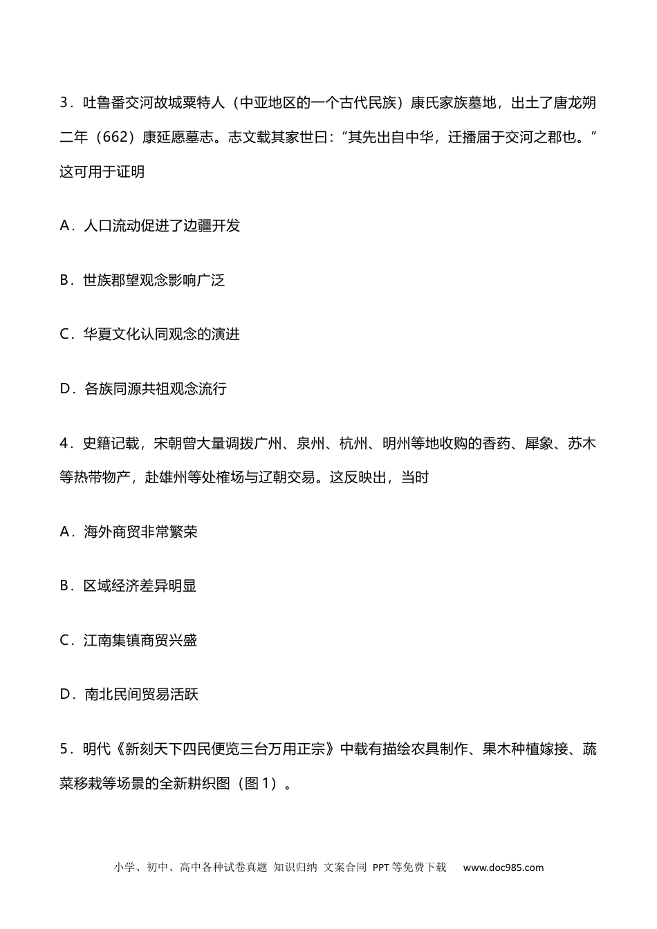 小学、初中、高中各种试卷真题知识归纳文案合同PPT等免费下载www.doc985.com2023年河北省普通高中学业水平选择性考试历史试题一、选择题:本题共16小题,每小题3分,共48分。在每小题给出的四个选项中,只有一项是符合题目要求的。1.张家口尚义四台遗址文化遗存分为五组。第一组出土了打制、磨制石器,第三组发现了炭化的粟与黍,第一至四组发现了半地穴式房址,五个组都出土了陶器。下列与其文化特征最相近的考古遗址是A.北京人遗址B.河姆渡遗址C.兴隆洼遗址D.二里头遗址2.春秋时期诸侯所铸青铜器的铭文中有“徐王”“越王”等称谓,而《左传》等文献却称上述诸侯为“子”。由此可知A.该时期贵族等级分封制解体B.出土文物信息较为可信C.当时各国君主专制逐步确立D.史料会体现一定主观性小学、初中、高中各种试卷真题知识归纳文案合同PPT等免费下载www.doc985.com3.吐鲁番交河故城粟特人(中亚地区的一个古代民族)康氏家族墓地,出土了唐龙朔二年(662)康延愿墓志。志文载其家世曰:“其先出自中华,迁播届于交河之郡也。”这可用于证明A.人口流动促进了边疆开发B.世族郡望观念影响广泛C.华夏文化认同观念的演进D.各族同源共祖观念流行4.史籍记载,宋朝曾大量调拨广州、泉州、杭州、明州等地收购的香药、犀象、苏木等热带物产,赴雄州等处榷场与辽朝交易。这反映出,当时A.海外商贸非常繁荣B.区域经济差异明显C.江南集镇商贸兴盛D.南北民间贸易活跃5.明代《新刻天下四民便览三台万用正宗》中载有描绘农具制作、果木种植嫁接、蔬菜移栽等场景的全新耕织图(图1)。小学、初中、高中各种试卷真题知识归纳文案合同PPT等免费下载www.doc985.com图1这可用于说明,明代A.农业生产精耕细作B.农具制造工艺革新C.种植物种日渐增多D.集体劳作形式盛行6.中英《北京条约》的签订打破了清政府不与外国在京谈判和订约的惯例,且条约规定:"(清朝皇帝)允于即日降谕京外各省督抚大吏,将此原约及续约各条发抄给阅,并令刊刻,悬布通衢,咸使知悉。”而对布告条约谕令,部分地方官员持消极抵触心态。由此可知,当时A.地方对中央离心力增强小学、初中、高中各种试卷真题知识归纳文案合同PPT等免费下载www.doc985.comB.统治集团试图挽救国家颓势C.英国在华势力范围扩大D.清廷对外关系在阵痛中转变7.晚清时期,常关、海关、厘金局三者业务范围变化示意图(图2)如下:19世纪50年代19世纪70年代19世纪90年代注:常关负责管理水路沿岸与主要内陆贸易,收入归中央;厘金局负责管理地方贸易,收入主要归地方。图2这一变化过程表明A.清政府财政自主权逐步削弱B.列强资本输出缓慢增加C.税收机构重叠影响行政效率D.地方财政收入日益减少小学、初中、高中各种试卷真题知识归纳文案合同PPT等免费下载www.doc985.com8.图3为留存至今的一封实寄信件封面,上面贴有1930年3月“赣西南赤色邮政”的邮票。图3由上述材料可知A.革命根据地注重基层组织建设B.苏维埃政府初具国家政权形态小学、初中、高中各种试卷真题知识归纳文案合同PPT等免费下载www.doc985.comC.江西和湖南革命政权走向联合D.革命统一战线影响力不断提升9.第一个五年计划期间,全国总工会号召在国营企业开展劳动竞赛。上海机床厂劳动模范盛利改进了39种工具,创造了3年完成5年工作量、产品质量合格率月均达到99%以上的优异成绩。这体现出A.社会主义工业化建设顺利推进B.社会主义建设总路线得到贯彻C.技术革新助力了经济体制改革D.社会主义改造工作的有序开展10.根据国家统计局数据,2001—2015年中国三大产业国内生产总值变化如图4所示。对图示解释合理的是小学、初中、高中各种试卷真题知识归纳文案合同PPT等免费下载www.doc985.com图4注:一般意义上,第一产业指农业,第二产业指工业,第三产业指除第一产业、第二产业之外的其他行业。A.家庭联产承包责任制加速了农业发展B.加入世界贸易组织促进了工业发展C.国家电子商务立法保障第三产业发展D.亚投行的成立推动了中国经济发展11.古代印度种姓制度形成后,个人种姓地位不能变动,但低级种姓以职业集团为单位,通过传统所容许的途径,在其原...