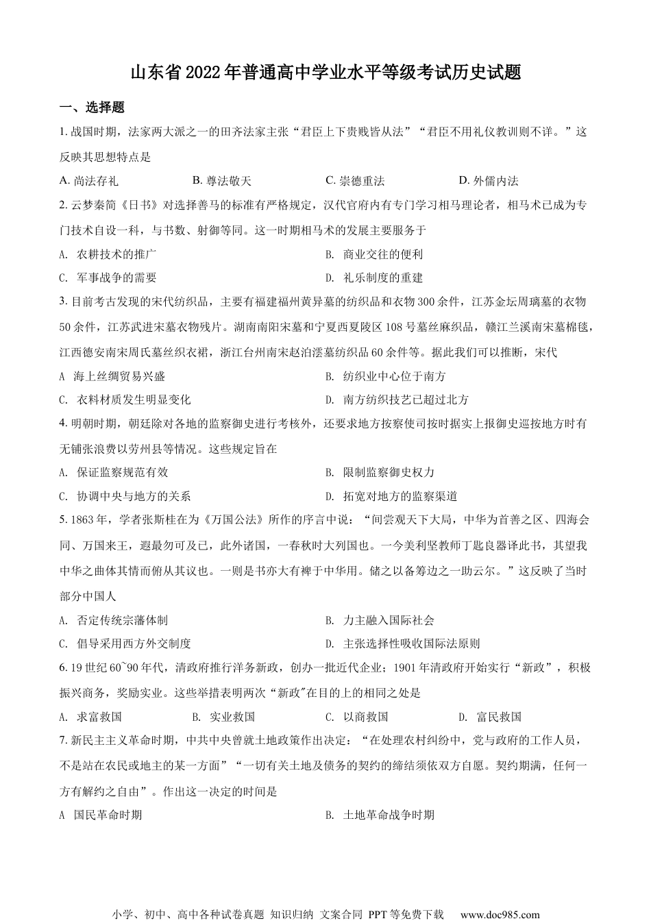 小学、初中、高中各种试卷真题知识归纳文案合同PPT等免费下载www.doc985.com山东省2022年普通高中学业水平等级考试历史试题一、选择题1.战国时期,法家两大派之一的田齐法家主张“君臣上下贵贱皆从法”“君臣不用礼仪教训则不详。”这反映其思想特点是A.尚法存礼B.尊法敬天C.崇德重法D.外儒内法2.云梦秦简《日书》对选择善马的标准有严格规定,汉代官府内有专门学习相马理论者,相马术已成为专门技术自设一科,与书数、射御等同。这一时期相马术的发展主要服务于A.农耕技术的推广B.商业交往的便利C.军事战争的需要D.礼乐制度的重建3.目前考古发现的宋代纺织品,主要有福建福州黄异墓的纺织品和衣物300余件,江苏金坛周璃墓的衣物50余件,江苏武进宋墓衣物残片。湖南南阳宋墓和宁夏西夏陵区108号墓丝麻织品,赣江兰溪南宋墓棉毯,江西德安南宋周氏墓丝织衣裙,浙江台州南宋赵泊澐墓纺织品60余件等。据此我们可以推断,宋代A.海上丝绸贸易兴盛B.纺织业中心位于南方C.衣料材质发生明显变化D.南方纺织技艺已超过北方4.明朝时期,朝廷除对各地的监察御史进行考核外,还要求地方按察使司按时据实上报御史巡按地方时有无铺张浪费以劳州县等情况。这些规定旨在A.保证监察规范有效B.限制监察御史权力C.协调中央与地方的关系D.拓宽对地方的监察渠道5.1863年,学者张斯桂在为《万国公法》所作的序言中说:“间尝观天下大局,中华为首善之区、四海会同、万国来王,遐最勿可及已,此外诸国,一春秋时大列国也。一今美利坚教师丁匙良器译此书,其望我中华之曲体其情而俯从其议也。一则是书亦大有裨于中华用。储之以备筹边之一助云尔。”这反映了当时部分中国人A.否定传统宗藩体制B.力主融入国际社会C.倡导采用西方外交制度D.主张选择性吸收国际法原则6.19世纪60~90年代,清政府推行洋务新政,创办一批近代企业;1901年清政府开始实行“新政”,积极振兴商务,奖励实业。这些举措表明两次“新政"在目的上的相同之处是A.求富救国B.实业救国C.以商救国D.富民救国7.新民主主义革命时期,中共中央曾就土地政策作出决定:“在处理农村纠纷中,党与政府的工作人员,不是站在农民或地主的某一方面”“一切有关土地及债务的契约的缔结须依双方自愿。契约期满,任何一方有解约之自由”。作出这一决定的时间是A.国民革命时期B.土地革命战争时期小学、初中、高中各种试卷真题知识归纳文案合同PPT等免费下载www.doc985.comC.全民族抗日战争时期D.解放战争时期8.20世纪七八十年代,中国除向非洲国家提供大量经援贷款外,还与非洲国家开展了广泛的济技术合作。1974~1980年,中国先后与45个非洲国家签订了100多项经济技术合作协定。这表明我国致力于与非洲人民一起A.建立区域性经济合作组织B.改善非洲的经济治理机制C.促进发展中国家的均衡发展D.推动国际经济新秩序的建立9.如图为1983~1993年我国第一产业占国内生产总值比例(%)变化情况。导致这一变化的主要因素是A.家庭联产承包责任制全面推行B.全方位对外开放格局形成C.社会主义市场经济体制的建立D.经济体制改革的不断深入10.如图所列为12世纪前期法兰西卡佩王朝路易六世在位期间的若干举措。这些举措旨在A.推动城市崛起B.加强国王权力C.建立民族国家D.发展庄园经济11.如图为世界物种交流过程中两种作物的传播路线示意图,两种作物是小学、初中、高中各种试卷真题知识归纳文案合同PPT等免费下载www.doc985.comA.小麦、玉米B.玉米、水稻C.小麦、甘蔗D.水稻、甘蔗12.18世纪的一些英国思想家认为,以自然状态和社会契约理论来描写和设计未来社会的图景,用理性来设计未来的国家体制,是非历史的和荒谬的……未来的社会,应该是每个人都参与到市场交换活动之中,通过市场、法律和道德三大基本要素来实现“文明和改善"的社会。这表明他们A.否定理性的社会变革B.反对政府的过多干预C.倡导发挥人的主体作用D.强调社会分工的主导性13.1913年,列宁在《马克思学说的历史命运》中说:“极大的世界风暴的新的发源地已在亚洲出现。……八亿人民的亚洲投入了为实现和欧洲相同的理想的斗争。”“相同的理想”指的是A.推翻帝国主义的压迫B.建立资产阶级共和国C.摧毁资本主义...
