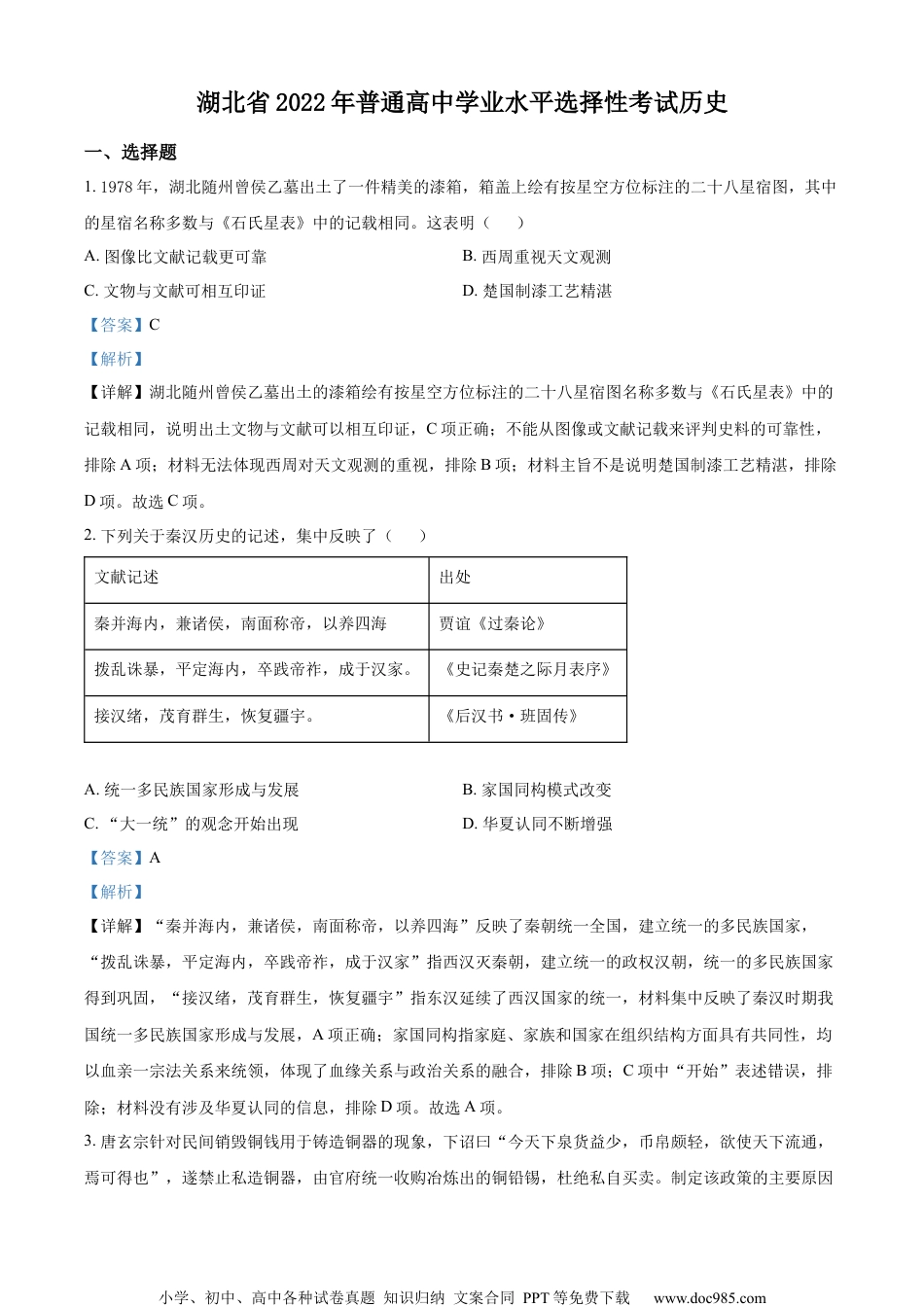 小学、初中、高中各种试卷真题知识归纳文案合同PPT等免费下载www.doc985.com湖北省2022年普通高中学业水平选择性考试历史一、选择题1.1978年,湖北随州曾侯乙墓出土了一件精美的漆箱,箱盖上绘有按星空方位标注的二十八星宿图,其中的星宿名称多数与《石氏星表》中的记载相同。这表明()A.图像比文献记载更可靠B.西周重视天文观测C.文物与文献可相互印证D.楚国制漆工艺精湛【答案】C【解析】【详解】湖北随州曾侯乙墓出土的漆箱绘有按星空方位标注的二十八星宿图名称多数与《石氏星表》中的记载相同,说明出土文物与文献可以相互印证,C项正确;不能从图像或文献记载来评判史料的可靠性,排除A项;材料无法体现西周对天文观测的重视,排除B项;材料主旨不是说明楚国制漆工艺精湛,排除D项。故选C项。2.下列关于秦汉历史的记述,集中反映了()文献记述出处秦并海内,兼诸侯,南面称帝,以养四海贾谊《过秦论》拨乱诛暴,平定海内,卒践帝祚,成于汉家。《史记秦楚之际月表序》接汉绪,茂育群生,恢复疆宇。《后汉书·班固传》A.统一多民族国家形成与发展B.家国同构模式改变C.“大一统”的观念开始出现D.华夏认同不断增强【答案】A【解析】【详解】“秦并海内,兼诸侯,南面称帝,以养四海”反映了秦朝统一全国,建立统一的多民族国家,“拨乱诛暴,平定海内,卒践帝祚,成于汉家”指西汉灭秦朝,建立统一的政权汉朝,统一的多民族国家得到巩固,“接汉绪,茂育群生,恢复疆宇”指东汉延续了西汉国家的统一,材料集中反映了秦汉时期我国统一多民族国家形成与发展,A项正确;家国同构指家庭、家族和国家在组织结构方面具有共同性,均以血亲一宗法关系来统领,体现了血缘关系与政治关系的融合,排除B项;C项中“开始”表述错误,排除;材料没有涉及华夏认同的信息,排除D项。故选A项。3.唐玄宗针对民间销毁铜钱用于铸造铜器的现象,下诏曰“今天下泉货益少,币帛颇轻,欲使天下流通,焉可得也”,遂禁止私造铜器,由官府统一收购冶炼出的铜铅锡,杜绝私自买卖。制定该政策的主要原因小学、初中、高中各种试卷真题知识归纳文案合同PPT等免费下载www.doc985.com是()A.国家财政的入不敷出B.铸币材料严重短缺C.铜铅锡专卖措施失效D.铜钱流通范围有限【答案】B【解析】【详解】民间销毁铜钱铸造铜器导致严重钱荒,迫使政府严禁私造铜器、实行铜铅锡国有等,说明其改革的主要原因是,铸币材料严重短缺,B项正确;唐玄宗时期,财政的入不敷出并非国家强化控制铸币材料的主要原因,排除A项;铜铅锡专卖是新政策,并非改革原因,排除C项;唐代铜钱在全国流通,使用范围广泛,排除D项。故选B项。4.宋初《百家姓》以“赵钱孙李”为首,而唐末五代河西节度使张议潮割据敦煌时期形成的《敦煌百家姓》写本以“张王李赵”为首。二者排序不同体现了()A.地域文化观念的差异B.崇文抑武政策的实施C.社会流动的日渐固化D.门第观念的历史遗留【答案】D【解析】【详解】赵匡胤建立宋朝,皇帝赵匡胤的皇姓“赵”字为《百家姓》第一姓,张议潮割据敦煌时期形成的《敦煌百家姓》以“张”为第一姓,可见,《百家姓》中姓氏排列体现了封建社会的门第观念,D项正确;《百家姓》中姓氏排列并非反映的是地域文化观念的差异,排除A项;河西节度使张议潮是武将,无法体现崇文抑武政策,排除B项;C项与材料信息无关,排除。故选D项。5.明代不少士子凭借记诵时文范文应试,而不注重阅读儒家经典。正德年间,官员徐文薄上奏:“近时时文流布四方,书肆资之以贾利,士子假此以侥幸,宜加痛革……其书坊刊刻一应时文,悉宜烧毁,不得鬻贩。”该奏疏主要针对的现象是()A.士子应考投机取巧B.书商刊刻时文牟利C.儒学正统地位动摇D.八股文体日益僵化【答案】A【解析】【详解】根据“明代不少士子凭借记诵时文范文应试,而不注重阅读儒家经典”可知,该奏疏主要针对的现象是士子凭借记诵时文范文应试,投机取巧,A项正确;B项不是最主要原因,排除;明代儒学仍然处于正统地位,排除C项;材料没有涉及八股文体日益僵化的信息,排除D项。故选A项。6.英国公使馆1861年进驻北京后,非常重视中文学习。公使馆负责汉文处的威妥玛...