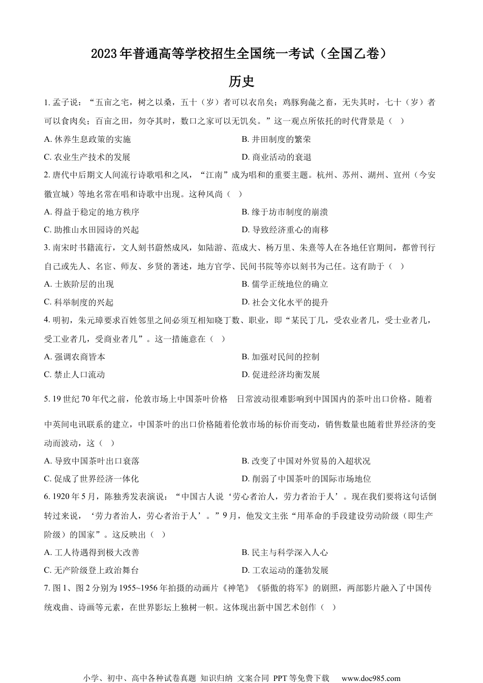 小学、初中、高中各种试卷真题知识归纳文案合同PPT等免费下载www.doc985.com2023年普通高等学校招生全国统一考试(全国乙卷)历史1.孟子说:“五亩之宅,树之以桑,五十(岁)者可以衣帛矣;鸡豚狗彘之畜,无失其时,七十(岁)者可以食肉矣;百亩之田,勿夺其时,数口之家可以无饥矣。”这一观点所依托的时代背景是()A.休养生息政策的实施B.井田制度的繁荣C.农业生产技术的发展D.商业活动的衰退2.唐代中后期文人间流行诗歌唱和之风,“江南”成为唱和的重要主题。杭州、苏州、湖州、宣州(今安徽宣城)等地名常在唱和诗歌中出现。这种风尚()A.得益于稳定的地方秩序B.缘于坊市制度的崩溃C.助推山水田园诗的兴起D.导致经济重心的南移3.南宋时书籍流行,文人刻书蔚然成风,如陆游、范成大、杨万里、朱熹等人在各地任官期间,都曾刊行自己或先人、名宦、师友、乡贤的著述,地方官学、民间书院等亦以刻书为己任。这有助于()A.士族阶层的出现B.儒学正统地位的确立C.科举制度的兴起D.社会文化水平的提升4.明初,朱元璋要求百姓邻里之间必须互相知晓丁数、职业,即“某民丁几,受农业者几,受士业者几,受工业者几,受商业者几”。这一措施意在()A.强调农商皆本B.加强对民间的控制C.禁止人口流动D.促进经济均衡发展5.19世纪70年代之前,伦敦市场上中国茶叶价格的日常波动很难影响到中国国内的茶叶出口价格。随着中英间电讯联系的建立,中国茶叶的出口价格随着伦敦市场的标价而变动,销售数量也随着世界经济的变动而波动,这()A.导致中国茶叶出口衰落B.改变了中国对外贸易的入超状况C.促成了世界经济一体化D.削弱了中国茶叶的国际市场地位6.1920年5月,陈独秀发表演说:“中国古人说‘劳心者治人,劳力者治于人’。现在我们要将这句话倒转过来说,‘劳力者治人,劳心者治于人’。”9月,他发文主张“用革命的手段建设劳动阶级(即生产阶级)的国家”。这反映出()A.工人待遇得到极大改善B.民主与科学深入人心C.无产阶级登上政治舞台D.工农运动的蓬勃发展7.图1、图2分别为1955~1956年拍摄的动画片《神笔》《骄傲的将军》的剧照,两部影片融入了中国传统戏曲、诗画等元素,在世界影坛上独树一帜。这体现出新中国艺术创作()小学、初中、高中各种试卷真题知识归纳文案合同PPT等免费下载www.doc985.comA.探索民族化道路的取向B.以进入世界市场为主要目标C.摆脱外来艺术形式影响D.服务于对外开放的基本国策8.1981年,北京京剧团实行改革,职工工资只发70%,国家不再负担大部分福利;剧团演出费用自行解决,演出盈余留存公积金30%,上交剧院10%,其余根据“按劳分配”原则分红。经过试验,职工收入明显增加。上述改革反映出()A.非公有资本成为文化建设投资主体B.国有文化事业单位整体改制为企业C.新的分配方式有利于激发职工积极性D.社会主义市场经济体制改革目标确立9.公元前6世纪中后期,庇西特拉图先后三次攫取雅典城邦的统治权。他依照法律处理公共事务,关怀农民,支持平民反对贵族,时人称其统治时期为“盛世”。该“盛世”的出现,得益于()A.梭伦改革的制度基础B.雅典民主政治的确立C.五百人议事会的产生D.贵族特权被彻底铲除10.1661年,英国民兵法案宣布:民兵、海陆军队以及所有军事要塞和驻地的唯一最高的统辖权、指挥权和部署权,历来属于国王陛下,这是不容置疑的。议会两院或其中任何一院都不能也不应要求这种权力。这说明当时英国()A.国王处于“统而不治”地位B.国王力图巩固统治权力C.强化王权以对抗“无敌舰队”D.君主立宪政体已经确立11.20世纪30年代,美国出现了各种各样的法西斯组织。他们采用恐怖手段破坏工人集会,杀害共产党员、工会活动分子、黑人和犹太人。到1938年底,美国类似的组织至少有800多个。这一现象反映出当时美国()A.经济困境冲击社会秩序B.开始推行自由放任主义小学、初中、高中各种试卷真题知识归纳文案合同PPT等免费下载www.doc985.comC.国家干预经济成效甚微D.扩军备战引发统治危机12.1960~1970年,发展中国家对发达资本主义国家的出口额从197.8亿美元增加到397.5亿美元,从发达资本主义国家的进口额也从218亿美元增加到413.6亿美元...