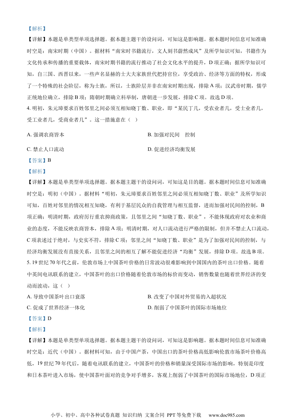 小学、初中、高中各种试卷真题知识归纳文案合同PPT等免费下载www.doc985.com2023年普通高等学校招生全国统一考试(全国乙卷)历史1.孟子说:“五亩之宅,树之以桑,五十(岁)者可以衣帛矣;鸡豚狗彘之畜,无失其时,七十(岁)者可以食肉矣;百亩之田,勿夺其时,数口之家可以无饥矣。”这一观点所依托的时代背景是()A.休养生息政策的实施B.井田制度的繁荣C.农业生产技术的发展D.商业活动的衰退【答案】C【解析】【详解】本题是单类型单项选择题。根据主题干设问词可知本题是背景题。时空是:战国时期(中国)。根据材料可知,材料主要内容是小农生生产生活的景象,这一观点是孟子提出的,孟子生活在战国时期,结合所学知识可知,孟子能够提出这一观点是因为战国时期出现铁犁牛耕,农业生产技术得到极大发展,使小农生产取代了井田制下集体生产,C项正确;休养生息政策是源于道家无为而治顺其自然的观点,排除A项;这一时期井田制走向瓦解,排除B项;这一时期,工商食官不断崩溃,私营工商业不断发展,商业活动较之前而言是发展的,排除D项。故选C项。2.唐代中后期文人间流行诗歌唱和之风,“江南”成为唱和的重要主题。杭州、苏州、湖州、宣州(今安徽宣城)等地名常在唱和诗歌中出现。这种风尚()A.得益于稳定的地方秩序B.缘于坊市制度的崩溃C.助推山水田园诗的兴起D.导致经济重心的南移【答案】A【解析】【详解】本题是多类型单项选择题。根据次题干提示词可知本题是本原因题、影响题。时空是:唐中后期(中国)。根据材料内容可知,材料主要内容是唐中后期文人流行诗歌唱和,江南是重要主题。结合所学知识可知,诗歌唱和主要体现的是文人之间作诗与别人相酬和,而诗人之间这种诗歌唱和基本以江南为主题,主要是因为唐中后期,南方相对北方,社会秩序更加安定,A项正确;唐朝时期坊市制度没有崩溃,排除B项;山水田园诗兴起于魏晋时期,排除C项;经济重心的南移是因为安史之乱,排除D项。故选A项。3.南宋时书籍流行,文人刻书蔚然成风,如陆游、范成大、杨万里、朱熹等人在各地任官期间,都曾刊行自己或先人、名宦、师友、乡贤的著述,地方官学、民间书院等亦以刻书为己任。这有助于()A.士族阶层的出现B.儒学正统地位的确立C.科举制度的兴起D.社会文化水平的提升【答案】D小学、初中、高中各种试卷真题知识归纳文案合同PPT等免费下载www.doc985.com【解析】【详解】本题是单类型单项选择题。据本题主题干的设问词,可知这是影响题。据本题时间信息可知准确时空是:南宋时期(中国)。据材料“南宋时书籍流行,文人刻书蔚然成风”及所学知识可知,书籍作为文化传承和传播的重要载体,南宋时期书籍的流行推动了社会文化水平的提升,D项正确;据所学知识可知,自三国、西晋以来,一些声名显赫的士大夫家族世代把持官位,享受政治、经济等方面的特权,形成了一个特殊的社会阶层,称为士族,所以,士族阶层并非在南宋时期出现,排除A项;汉武帝时期,儒学正统地位确立,排除B项;隋朝时期确立科举制,唐朝进一步发展,排除C项。故选D项。4.明初,朱元璋要求百姓邻里之间必须互相知晓丁数、职业,即“某民丁几,受农业者几,受士业者几,受工业者几,受商业者几”。这一措施意在()A.强调农商皆本B.加强对民间的控制C.禁止人口流动D.促进经济均衡发展【答案】B【解析】【详解】本题是单类型单项选择题。据本题主题干的设问词,可知这是目的题。据本题时间信息可知准确时空是:明初(中国)。据材料“明初,朱元璋要求百姓邻里之间必须互相知晓丁数、职业”及所学知识可知,百姓对邻里的情况相互知晓,有利于基层民众的自我管理与相互监督,进而加强对民间的控制,B项正确;明清时期,政府厉行重农抑商政策,且邻里之间“知晓丁数、职业”,不能体现政府对农业和商业的态度,不能反映农商皆本,排除A项;明清时期,对人口流动进行严格的限制,但并不禁止人口流动,C项表述过于绝对,与史实不符,排除C项;邻里之间“知晓丁数、职业”是为了加强对民间的控制,与经济均衡发展没有直接关系,且邻里之间的相互了解不能促进经济“均衡”发展,排除D项。故选B项。5.19世纪70年代之前...