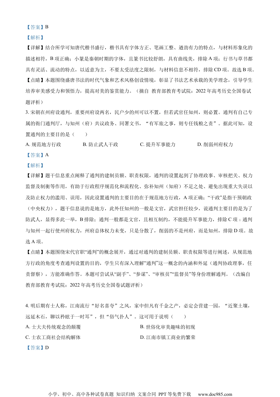 小学、初中、高中各种试卷真题知识归纳文案合同PPT等免费下载www.doc985.com2022年全国乙卷文综历史试题1.据下图可知,商、西周青铜器铸造的繁荣()A.推动了南北农业经济进步B.依赖大规模商业活动开展C.反映了南北方联系的加强D.缘于统治区域扩大到江南【答案】C【解析】【详解】依据图示可知,商周政治重心位于黄河流域,而重要铜矿位于长江流域,长途运输成为必要,南北方联系由此加强,C符合题意;结合所学可知,青铜器比较珍贵且坚韧度不够好,未广泛用于农业,A排除;青铜铸造由官府垄断,B排除;地图未标示统治区域,无法得出扩大到江南,且青铜铸造的繁荣主要缘于技术进步等因素,地理因素不是主因,D排除。故选C项。【点睛】本题以商周青铜器为切入点,揭示了商周青铜文明与长江流域铜矿开发的关系,引导学生得出黄河、长江两大流域共同塑造了早期华夏文明的结论,深化学生对中华文明多元一体发展的历史认知。(摘自教育部教育考试院:2022年高考历史全国卷试题评析;解析参考:商周制造青铜器的原料是从哪来的?)2.盛唐洋溢着刚健丰伟、庄重博大的时代气象,这在书法艺术上亦有体现。宋代书法家米芾推崇唐代某位书法家的作品“如项羽挂甲,樊哙排突,硬弩欲张,铁柱将立,昂然有不可犯之色”。能够突出体现这一风格的书体是()A.小篆B.楷书C.行书D.草书小学、初中、高中各种试卷真题知识归纳文案合同PPT等免费下载www.doc985.com【答案】B【解析】【详解】结合所学可知唐代楷书盛行,楷书具有字体方正、笔画工整、遒劲有力的特点,与材料形象化的描述相符,B项正确;小篆是秦朝时期的字体,且篆书比较舒朗,具有曲线美,排除A项;行书与草书都具有灵活、流动的特点,以适意为主,不要太受法度之限制,与材料信息不相符,排除CD项。故选B项。【点睛】本题围绕盛唐书法的时代气象和艺术风格创设情境,彰显了书法艺术承载的美学理念,引导学生培养审美感受力和领悟力,提高对美的鉴赏能力。(摘自教育部教育考试院:2022年高考历史全国卷试题评析)3.宋朝在州府设通判,重要州府设两名,民户少的州可以不置,但若武官任知州,则必置。通判有自己专属的衙门通判厅,与知州(府)共议政务、同署文书,“有军旅之事,则专任钱粮之责”。据此可知,设置通判的主要目的是()A.规范地方行政B.防止武人干政C.提升军事能力D.削弱州府权力【答案】A【解析】【详解】题干信息重点阐释了通判的建制员额、职责权限,通判的设置起到了协理政事、审核把关、权力监督及制衡等作用,有助于行政程序规范化和流程化、弥补知州(知府)不足之处、避免出现重大失误以及防止权力的滥用、误用,因此设置通判的主要目的在于规范地方行政,A项正确;“干政”是指干预朝政(中央权力),题干信息说的是地方,此外任知州的一般是文官,武官担任较少,说通判主要目的是为了防武人,显得多此一举,B排除;通判一般都是文官,且相互制约,不能提升军事能力,排除C项﹔通判与知州一起行使州府权力,州府总体权力未变,只是分散了,削弱的不是州府,而是知州,排除D项。故选A项。【点睛】本题围绕宋代官职“通判”的概念展开,通过对通判的建制员额、职责权限等进行阐述,从规范地方行政的角度考查通判设置的目的,学生只有深入理解“通判”这一概念的内涵和外延(通判协政理事,任责督察),方能准确作答。本题可尝试从“副手”、“参谋”、“审核员”“监督员”等身份理解通判。(改编自教育部教育考试院:2022年高考历史全国卷试题评析)4.明后期有士人称,江南流行“好名喜夸”之风,家中但凡有千金之产,必定会营建一园,“近聚土壤,远延木石,聊以矜眩于一时耳”,但“俗气扑人”。这可用于说明()A.士大夫传统观念的颠覆B.世俗化审美趣味的初现C.士农工商社会结构解体D.江南市镇工商业的繁荣【答案】D小学、初中、高中各种试卷真题知识归纳文案合同PPT等免费下载www.doc985.com【解析】【详解】结合所学可知,明后期随着商品经济的发展,江南地区出现了资本主义萌芽、市镇普遍兴起,市镇经济对传统的社会意识、当地风俗产生冲击,形成了“好名喜夸”之风,D项正确;“颠覆”表述过于绝对,士大夫...