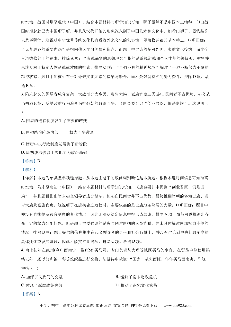 小学、初中、高中各种试卷真题知识归纳文案合同PPT等免费下载www.doc985.com海南省2024年普通高中学业水平选择性考试历史试题一、选择题:本大题共15小题,每小题3分,共45分。分为单项选择题Ⅰ和单项选择题Ⅱ两部分。单项选择题Ⅰ:1~13题,每题3分,共39分。每题只有一个正确选项。1.西藏地区考古资料显示:距今5000年前后的卡若遗址出现了粟的栽培和猪的饲养;在昌果沟遗址发现了距今3370年前后的炭化聚和上百粒青稞;在故如甲木和曲踏遗址发现了2-4世纪的茶叶、丝绸以及青铜与铁等金属制品遗存。这有力佐证了西藏地区()A.生态环境受到新物种引进的严重影响B.与其他地区存在持续的物质文化交流C.在旧石器时代就已经出现了人类活动D.青铜铸造是手工业生产中的主要部门【答案】B【解析】【详解】本题为单类型单项选择题。从本题主题干的设问词判断这是本质题。根据本题时间信息可知准确时空为:距今5000年前后至2-4世纪(中国)。结合本题材料与所学知识可知,西藏地区的考古发现包括了粟、猪、青稞、茶叶、丝绸以及青铜与铁等物品,这些发现表明西藏与周边乃至更远地区存在着较为频繁的物质文化交流活动,B项正确;虽然材料中提到了外来作物如粟和青稞的出现,但没有具体证据显示它们对当地生态造成了显著影响,排除A项;题目中的考古发现主要集中在新石器时代晚期及以后的时间段内,并未直接支持该选项的说法,故不选C项;虽然发现了青铜制品,但这不足以证明青铜铸造就是手工业生产的主导行业,且题目信息更多强调的是跨区域交流而非某一特定行业的地位,排除D项。故选B项。2.狮子不是中国本土物种。有学者研究认为,狮子在战国时期就已经为中国人所了解,其形象从汉代起扎根于中国艺术,代表有看门狮子、象征祥瑞的器物装饰以及狮子舞等,舞狮作为中国民间节庆常有的节目,也成为中国文化的标志之一。这体现了中华优秀传统文化()A.见贤思齐的重要内涵B.兼收并蓄的基本特点C.崇德尚贤的思想理念D.自强不息的精神境界【答案】B【解析】【详解】本题为单类型单项选择题。从本题主题干的设问词判断这是本质题。根据本题时间信息可知准确小学、初中、高中各种试卷真题知识归纳文案合同PPT等免费下载www.doc985.com时空为:战国时期至现代(中国)。结合本题材料与所学知识可知,狮子虽然不是中国本土物种,但自战国时期起就已为中国所了解,并且从汉代开始其形象深入到了中国艺术和文化中,如看门狮子、器物装饰以及舞狮等。这说明中华优秀传统文化具有吸收外来文化的包容性,即兼收并蓄的基本特点,B项正确;“见贤思齐的重要内涵”是指向他人学习美德和优点,而题目中讨论的是对外国元素的文化接纳,而非个人道德修养上的追求,排除A项;“崇德尚贤的思想理念”指的是重视道德和个人才能的价值观,材料并未涉及对于特定人物品德或才能的推崇,排除C项;“自强不息的精神境界”描述了一种不断努力不懈的精神状态,题目中的核心在于对外来文化元素的接纳与融合,而不是强调持续的努力奋斗,排除D项。故选B项。3.隋末起义的领导者成分复杂,大致可分为乡民,贵胄大族、豪族官吏三类,起自民间者不占优势。起义从当初逃兵役、反暴政的行为演变为推翻朝的政治斗争。《唐会要》记“创业君臣,俱是贵族”。这说明()A.隋唐的选官制度发生了重要的转变B.唐初统治阶级内部的权力斗争激烈C.隋唐中央行政制度发展到了新阶段D.唐初统治仍以士族地主为政治基础【答案】D【解析】【详解】本题为单类型单项选择题。从本题主题干的设问词判断这是本质题。根据本题时间信息可知准确时空为:隋末至唐初(中国)。结合本题材料与所学知识可知,《唐会要》中提到“创业君臣,俱是贵族”,并且题目指出隋末起义领导者成分复杂,但起自民间者并不占优势,最终推翻隋朝的多为贵族、贵胄大族及豪族官吏。这说明了在唐初建立政权时,主要依靠的是士族地主阶层的力量,D项正确;题目中并没有直接提及选官制度的变化情况,因此无法从给定信息中得出该结论,排除A项;虽然可以推测出存在一定的权力分配问题,但是题目主要强调的是参与创建唐朝的人员背景,并未具体描述内部权力斗争的情况,排除B项;题目...