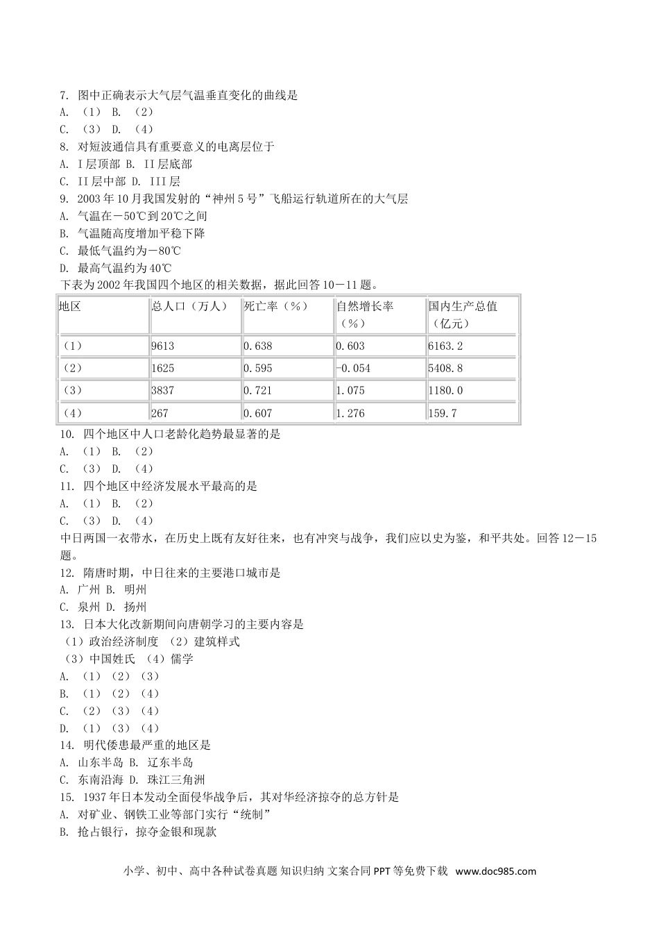 2004年贵州高考文科综合真题及答案本试卷分第I卷(选择题)和第II卷(非选择题)两部分。第I卷1至7页,第II卷8至15页。考试结束后,将本试卷和答题卡一并交回。第I卷注意事项:1.答第I卷前,考生务必将自己的姓名、准考证号、考试科目涂写在答题卡上。2.每小题选出答案后,用铅笔把答题卡上对应题目的答案标号涂黑。如需改动,用橡皮擦干净后,再选涂其他答案标号。不能答在试题卷上。3.本卷共35小题,每小题4分,共140分。在每题给出的四个选项中,只有一项是最符合题目要求的。图1是某地区土地利用现状示意图,读图1回答1-3题。1.如果现状布局合理,则当地盛行风向可能是A.东南风B.东北风C.南风D.西南风2.如果要布局新的居住用地,较合理的地区是A.(1)B.(2)C.(3)D.(4)3.适宜在P点布局的是小学、初中、高中各种试卷真题知识归纳文案合同PPT等免费下载www.doc985.comA.钢铁厂B.造纸厂C.印染厂D.自来水厂我国沿海某省一个课外小组某日测得当地日出、日落时间分别为北京时间6:40、16:40。据此回答4-6题。4.该地的经度约为A.120°EB.125°EC.115°ED.110°E5.该日可能在A.11月B.9月C.7月D.5月6.该月可能出现的现象是A.南海海水经马六甲海峡流向印度洋B.印度洋海水经马六甲海峡流向南海C.拉普拉塔河进入枯水期D.印度河进入丰水期图2示意大气垂直分层,读图2回答7-9题。小学、初中、高中各种试卷真题知识归纳文案合同PPT等免费下载www.doc985.com7.图中正确表示大气层气温垂直变化的曲线是A.(1)B.(2)C.(3)D.(4)8.对短波通信具有重要意义的电离层位于A.I层顶部B.II层底部C.II层中部D.III层9.2003年10月我国发射的“神州5号”飞船运行轨道所在的大气层A.气温在-50℃到20℃之间B.气温随高度增加平稳下降C.最低气温约为-80℃D.最高气温约为40℃下表为2002年我国四个地区的相关数据,据此回答10-11题。地区总人口(万人)死亡率(%)自然增长率(%)国内生产总值(亿元)(1)96130.6380.6036163.2(2)16250.595-0.0545408.8(3)38370.7211.0751180.0(4)2670.6071.276159.710.四个地区中人口老龄化趋势最显著的是A.(1)B.(2)C.(3)D.(4)11.四个地区中经济发展水平最高的是A.(1)B.(2)C.(3)D.(4)中日两国一衣带水,在历史上既有友好往来,也有冲突与战争,我们应以史为鉴,和平共处。回答12-15题。12.隋唐时期,中日往来的主要港口城市是A.广州B.明州C.泉州D.扬州13.日本大化改新期间向唐朝学习的主要内容是(1)政治经济制度(2)建筑样式(3)中国姓氏(4)儒学A.(1)(2)(3)B.(1)(2)(4)C.(2)(3)(4)D.(1)(3)(4)14.明代倭患最严重的地区是A.山东半岛B.辽东半岛C.东南沿海D.珠江三角洲15.1937年日本发动全面侵华战争后,其对华经济掠夺的总方针是A.对矿业、钢铁工业等部门实行“统制”B.抢占银行,掠夺金银和现款小学、初中、高中各种试卷真题知识归纳文案合同PPT等免费下载www.doc985.comC.控制中国的交通命脉D.将沦陷区经济变为日本的附庸经济在历史上,各民族不断交流融合,对中华文明的发展起到了重要作用。回答16-19题。16.西域的葡萄、石榴陆续移植内地是在A.西周时期B.春秋战国时期C.西汉时期D.隋唐时期17.匈奴分裂为南北二部,南匈奴南下与汉人杂居发生在A.秦朝B.西汉C.东汉D.西晋18.中国古代实行两面官(南面官和北面官)制度的政权是A.北魏B.金C.辽D.西夏19.下列关于我国民族区域自治制度的表述,不正确的是A.民族区域自治是解决民族问题的基本政策,是我国的一项基本政治制度B.其内容是在少数民族聚居区建立自治地方,设立自治机关,行使自治权C.体现民族平等、民族团结与共同发展繁荣的原则D.是在十一届三中全会以后逐步建立起来的中国的农民运动在不同历史时期带有不同的时代色彩。回答20-23题。20.下列关于陈胜吴广起义的表述,不正确的是A.迫使汉初统治者采取休养生息政策B.提出“王侯将相宁有种乎”的口号C.是中国历史上第一次大规模农民战争D.推翻了秦始皇的统治21.下列选项中,带有反抗民族压迫色彩的农民起义是A.秦末农民起义B.隋末农民起义C.元末农民起义D.明末农民起义22.太平天国政权颁布的《天朝...