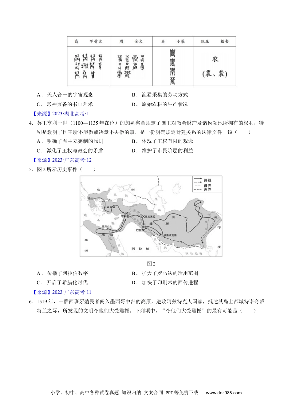 小学、初中、高中各种试卷真题知识归纳文案合同PPT等免费下载www.doc985.com五年(2019-2023)年高考真题分项汇编专题08古代文明的产生、发展与中古时期的世界命题点真题分布频次题型分值考查内容古代文明的产生与发展2023·湖北高考·112023·湖北高考·12023·广东高考·112023·北京高考·112023·浙江高考·102023·湖南高考·112023·全国甲卷·322023·全国新课标卷·322023·全国新课标卷·312023·高考全国乙卷·322023·浙江高考·122022·重庆高考·112022·天津高考·152022·辽宁高考·122022·湖北高考·112022·湖南高考·162022·湖南高考·112022.1·浙江高考·162021·全国甲卷·322021·海南高考·142021·辽宁高考·112021·福建高考·112021·河北高考·112020·北京高考·112020·海南高考·142019·新课标全国Ⅰ卷高考·322019·江苏高考·142019·浙江4月高考选考·302019·天津高考·35年32考选择题全国卷4分地方卷3分1、罗马帝国及其扩张2、原始农耕3、希腊化时代4、罗马共和国和罗马法5、种姓制度6、东罗马帝国的衰落7、《汉谟拉比法典》8、雅典民主政治9、荷马史诗10、古代埃及11、新古典主义艺术12、希腊公民素养小学、初中、高中各种试卷真题知识归纳文案合同PPT等免费下载www.doc985.com2023·湖南高考·19题2022.6·浙江高考·27题2022.1·浙江高考·29题材料分析题10分8分15分1葡萄酒的发展史2雅典城邦政治3罗马法的发展中古时期的欧洲2023·湖北高考·122023·广东高考·122022·辽宁高考·132022·北京高考·122022·海南高考·112022·山东高考·105年6考选择题3分1.中世纪庄园经济的发展2.英格兰的王权有限3.法兰西王权的加强4.中世纪的英国议会5.中世纪城市的发展中古时期的亚洲、非洲与美洲2023·浙江高考·112023·湖南高考·122023·浙江高考·112022·海南高考·102022·海南高考·152021·福建高考·125年6考选择题3分1.阿兹克特文明2.日本土地制度的变化3.印第安人创造的文化成就4.历史研究1.13世纪时,英格兰的一则小品剧中,庄园领主在法庭上公开讨论小麦、奶酪、鸡蛋和小乳猪的价格。无独有偶,《田庄总管职责》也提醒领主和总管,羊毛应该论包或以一只羊一次所剪的毛为单位出售,怎样卖收益最大、好处最多,就怎样卖。上述材料反映英格兰()A.封建庄园制度已濒临崩溃B.庄园农产品获利丰厚C.农业的经济转型趋势初显D.圈地运动正迅速开展【来源】2023·湖北高考·122.某学者关注世界历史上的一位著名统治者,研究其在位时期的文治武功。该统治者以恢复旧日罗马帝国的荣耀为己任,力图建立“一位皇帝、一部法律、一个帝国”的新秩序。最符合该研究主题的史实是()A.罗马帝国一分为二B.都城改名为伊斯坦布尔C.颁布第一部成文法D.征服占领北非和意大利【来源】2023·湖北高考·113.象形文字在一定程度上可以反映创字时的生态环境、经济生活和思想观念等。下表是“农”字的演变历程,其创意是在树木众多的地方以蜃(蚌壳)制工具从事劳作。“农”字的创制可反映当时()小学、初中、高中各种试卷真题知识归纳文案合同PPT等免费下载www.doc985.comA.天人合一的宇宙观念B.渔猎采集的劳动方式C.形神兼备的书画艺术D.原始农耕的生产状况【来源】2023·湖北高考·14.英王亨利一世(1100—1135年在位)的加冕宪章规定了国王对教会财产及诸侯领地所拥有的权利,特别是载明了国王所不能做或决意不去做的事,是一份明确规定封建关系的法律文件。该()A.明确了君主立宪制的原则B.体现了王权有限的观念C.激化了王权与教会的矛盾D.维护了市民阶层的利益【来源】2023·广东高考·125.图2所示历史事件()图2A.传播了阿拉伯数字B.扩大了罗马法的适用范围C.开启了希腊化时代D.加快了印刷术的西传进程【来源】2023·广东高考·116.1519年,一群西班牙殖民者闯入墨西哥中部的高原,进攻阿兹特克人国家,抵达其岛上都城特诺奇蒂特兰之际,所发现的文明令他们大受震撼。下列项中,“令他们大受震撼”的最有可能是()小学、初中、高中各种试卷真题知识归纳文案合同PPT等免费下载www.doc985.com【来源】2023·浙江高考·117...