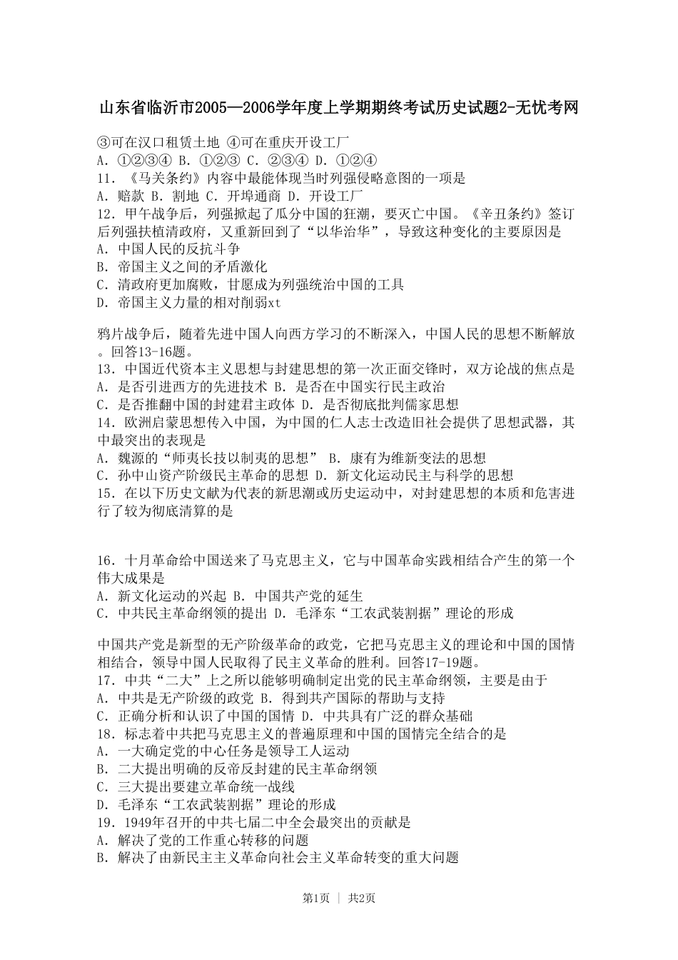 第1页|共2页山东省临沂市2005—2006学年度上学期期终考试历史试题2-无忧考网③可在汉口租赁土地④可在重庆开设工厂A.①②③④B.①②③C.②③④D.①②④11.《马关条约》内容中最能体现当时列强侵略意图的一项是A.赔款B.割地C.开埠通商D.开设工厂12.甲午战争后,列强掀起了瓜分中国的狂潮,要灭亡中国。《辛丑条约》签订后列强扶植清政府,又重新回到了“以华治华”,导致这种变化的主要原因是A.中国人民的反抗斗争B.帝国主义之间的矛盾激化C.清政府更加腐败,甘愿成为列强统治中国的工具D.帝国主义力量的相对削弱xt鸦片战争后,随着先进中国人向西方学习的不断深入,中国人民的思想不断解放。回答13-16题。13.中国近代资本主义思想与封建思想的第一次正面交锋时,双方论战的焦点是A.是否引进西方的先进技术B.是否在中国实行民主政治C.是否推翻中国的封建君主政体D.是否彻底批判儒家思想14.欧洲启蒙思想传入中国,为中国的仁人志士改造旧社会提供了思想武器,其中最突出的表现是A.魏源的“师夷长技以制夷的思想”B.康有为维新变法的思想C.孙中山资产阶级民主革命的思想D.新文化运动民主与科学的思想15.在以下历史文献为代表的新思潮或历史运动中,对封建思想的本质和危害进行了较为彻底清算的是16.十月革命给中国送来了马克思主义,它与中国革命实践相结合产生的第一个伟大成果是A.新文化运动的兴起B.中国共产党的延生C.中共民主革命纲领的提出D.毛泽东“工农武装割据”理论的形成中国共产党是新型的无产阶级革命的政党,它把马克思主义的理论和中国的国情相结合,领导中国人民取得了民主义革命的胜利。回答17-19题。17.中共“二大”上之所以能够明确制定出党的民主革命纲领,主要是由于A.中共是无产阶级的政党B.得到共产国际的帮助与支持C.正确分析和认识了中国的国情D.中共具有广泛的群众基础18.标志着中共把马克思主义的普遍原理和中国的国情完全结合的是A.一大确定党的中心任务是领导工人运动B.二大提出明确的反帝反封建的民主革命纲领C.三大提出要建立革命统一战线D.毛泽东“工农武装割据”理论的形成19.1949年召开的中共七届二中全会最突出的贡献是A.解决了党的工作重心转移的问题B.解决了由新民主主义革命向社会主义革命转变的重大问题第2页|共2页C.加强了党的自身建设,防止了腐朽思想的滋长D.解决了社会主义过渡时期的重大问题2005年5月,中国国民党主席连战访问大陆,爱到胡锦涛主席的接见,国共两党最高领导人时隔60年后第一次握手。回答20-22题。20.国民党一大召开,标志着国共两党合作的实现。两党合作的政治基础是A.孙中山提出的新三民主义B.“联俄、联共、扶助农工”的三大政策C.共产党员以个人身份加入国民党D.中国共产党的民主革命纲领‘===========无忧考网https://www.kaowang.com/show/569388.html===========11欢迎访问无忧考网官方网站:www.kaowang.com微信公众号:无忧考网