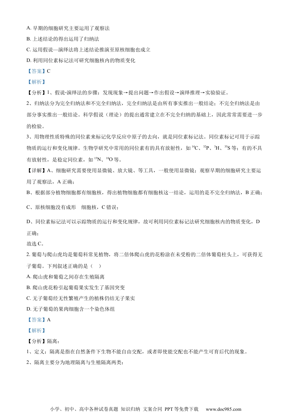 小学、初中、高中各种试卷真题知识归纳文案合同PPT等免费下载www.doc985.com机密★启用前2023年辽宁省普通高等学校招生选择性考试科目:生物学(试题卷)注意事项:1.答卷前,考生须在答题卡和试题卷上规定的位置,准确填写本人姓名、准考证号,并核对条形码上的信息。确认无误后,将条形码粘贴在答题卡上相应位置。2.考生须在答题卡上各题目规定答题区域内答题,超出答题区域书写的答案无效。在草稿纸、试题卷上答题无效。3.考试结束,将本试题卷和答题卡一并交回。4.本试题卷共10页,如缺页,考生须声明,否则后果自负。姓名_____准考证号_____机密★启用前2023年辽宁省普通高等学校招生选择性考试生物学注意事项:1.答卷前,考生务必将自己的姓名、准考证号填写在答题卡上。2.答选择题时,选出每小题答案后,用铅笔把答题卡对应题目的答案标号涂黑。如需改动,用橡皮擦干净后,再选涂其他答案标号。答非选择题时,将答案写在答题卡上。写在本试卷上无效。3.考试结束后,将本试卷和答题卡一并交回。一、选择题:本题共15小题,每小题2分,共30分。在每小题给出的四个选项中,只有一项符合题目要求。1.科学家根据对部分植物细胞观察的结果,得出“植物细胞都有细胞核”的结论。下列叙述错误的是()小学、初中、高中各种试卷真题知识归纳文案合同PPT等免费下载www.doc985.comA.早期的细胞研究主要运用了观察法B.上述结论的得出运用了归纳法C.运用假说—演绎法将上述结论推演至原核细胞也成立D.利用同位素标记法可研究细胞核内的物质变化【答案】C【解析】【分析】1、假说-演绎法的步骤:发现现象→提出问题→作出假设→演绎推理→实验验证。2、归纳法分为完全归纳法和不完全归纳法,完全归纳法是由所有事实推出一般结论;不完全归纳法是由部分事实推出一般结论。科学假说(理论)的提出通常建立在不完全归纳的基础上,因此常常需要进一步的检验。3、用物理性质特殊的同位素来标记化学反应中原子的去向,就是同位素标记法。同位素标记可用于示踪物质的运行和变化规律。生物学研究中常用的同位素有的具有放射性,如14C、32P、3H、35S等;有的不具有放射性,是稳定同位素,如15N、18O等。【详解】A、细胞研究需要使用显微镜、放大镜、等工具,一般使用显微镜;观察早期的细胞研究主要运用了观察法,A正确;B、根据部分植物细胞都有细胞核,得出植物细胞都有细胞核这一结论,运用的是不完全归纳法,B正确;C、原核细胞没有成形的细胞核,C错误;D、同位素标记法可以示踪物质的运行和变化规律,故可利用同位素标记法研究细胞核内的物质变化,D正确;故选C。2.葡萄与爬山虎均是葡萄科常见植物,将二倍体爬山虎的花粉涂在未受粉的二倍体葡萄柱头上,可获得无子葡萄。下列叙述正确的是()A.爬山虎和葡萄之间存在生殖隔离B.爬山虎花粉引起葡萄果实发生了基因突变C.无子葡萄经无性繁殖产生的植株仍结无子果实D.无子葡萄的果肉细胞含一个染色体组【答案】A【解析】【分析】隔离:1、定义:隔离是指在自然条件下生物不能自由交配,或者即使能交配也不能产生可育后代的现象。2、隔离主要分为地理隔离与生殖隔离两类:小学、初中、高中各种试卷真题知识归纳文案合同PPT等免费下载www.doc985.com(1)地理隔离是指生物的种群之间由于地理环境的阻隔,不能相互交配繁殖产生后代的现象。(2)生殖隔离是指在自然条件下,由于生物之间不能交配或者交配后不能产生可育后代的现象。生物之间无法交配,不能完成受精或杂种不活、杂种不育等都属于生殖隔离。【详解】A、生殖隔离是指在自然条件下,由于生物之间不能交配或者交配后不能产生可育后代的现象。生物之间无法交配,不能完成受精或杂种不活、杂种不育等都属于生殖隔离。将二倍体爬山虎的花粉涂在未受粉的二倍体葡萄柱头上,获得的葡萄中没有种子,则爬山虎花粉中的精子与葡萄的卵细胞没有完成受精,所以爬山虎和葡萄之间存在生殖隔离,A正确;B、涂在未受粉的二倍体葡萄柱头上的爬山虎花粉不能引起葡萄果实发生基因突变,而是促使葡萄产生生长素,促进子房发育成无子葡萄,B错误;C、这种无子葡萄是经生长素作用产生的,其细胞中遗传物质...