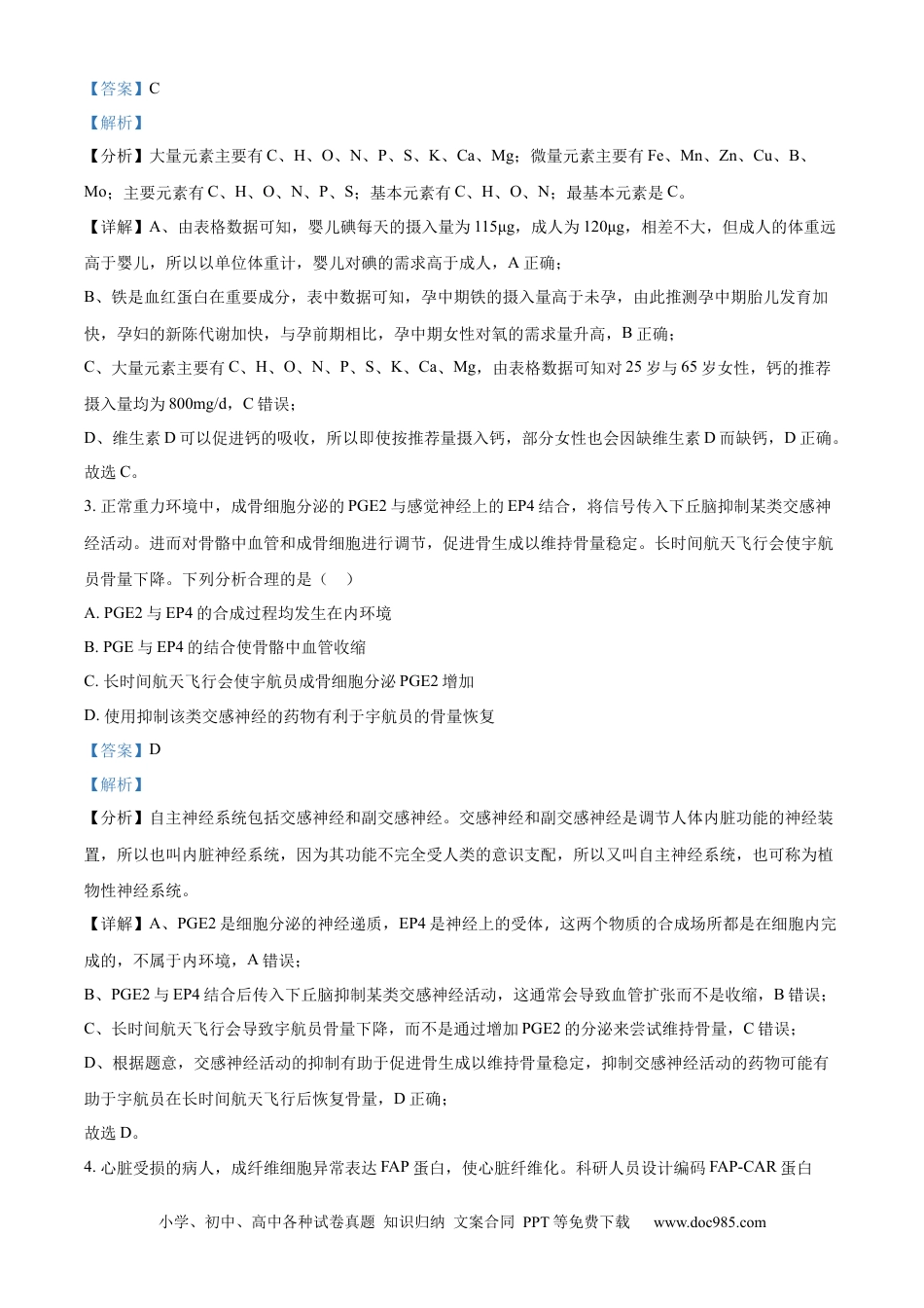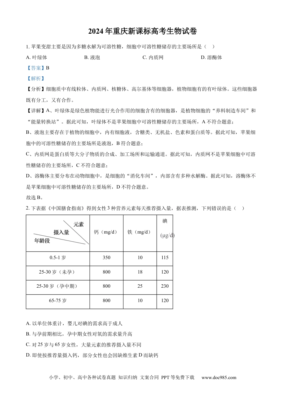 小学、初中、高中各种试卷真题知识归纳文案合同PPT等免费下载www.doc985.com2024年重庆新课标高考生物试卷1.苹果变甜主要是因为多糖水解为可溶性糖,细胞中可溶性糖储存的主要场所是()A.叶绿体B.液泡C.内质网D.溶酶体【答案】B【解析】【分析】细胞质中有线粒体、内质网、核糖体、高尔基体等细胞器,植物细胞有的有叶绿体。这些细胞器既有分工,又有合作。【详解】A、叶绿体是绿色植物能进行光合作用的细胞含有的细胞器,是植物细胞的“养料制造车间”和“能量转换站”。据此可知,叶绿体不是苹果细胞中可溶性糖储存的主要场所,A不符合题意;B、液泡主要存在于植物的细胞中,内有细胞液,含糖类、无机盐、色素和蛋白质等。据此可知,苹果细胞中的可溶性糖储存的主要场所是液泡,B符合题意;C、内质网是蛋白质等大分子物质的合成、加工场所和运输通道。据此可知,内质网不是苹果细胞中可溶性糖储存的主要场所,C不符合题意;D、溶酶体主要分布在动物细胞中,是细胞的“消化车间”,内部含有多种水解酶。据此可知,溶酶体不是苹果细胞中可溶性糖储存的主要场所,D不符合题意。故选B。2.下表据《中国膳食指南》得到女性3种营养元素每天推荐摄入量,据表推测,下列错误的是()钙(mg/d)铁(mg/d)碘0.5-1岁3501011525-30岁(未孕)8001812025-30岁(孕中期)8002523065-75岁80010120A.以单位体重计,婴儿对碘的需求高于成人B.与孕前期相比,孕中期女性对氧的需求量升高C.对25岁与65岁女性,大量元素的推荐摄入量不同D.即使按推荐量摄入钙,部分女性也会因缺维生素D而缺钙小学、初中、高中各种试卷真题知识归纳文案合同PPT等免费下载www.doc985.com【答案】C【解析】【分析】大量元素主要有C、H、O、N、P、S、K、Ca、Mg;微量元素主要有Fe、Mn、Zn、Cu、B、Mo;主要元素有C、H、O、N、P、S;基本元素有C、H、O、N;最基本元素是C。【详解】A、由表格数据可知,婴儿碘每天的摄入量为115μg,成人为120μg,相差不大,但成人的体重远高于婴儿,所以以单位体重计,婴儿对碘的需求高于成人,A正确;B、铁是血红蛋白在重要成分,表中数据可知,孕中期铁的摄入量高于未孕,由此推测孕中期胎儿发育加快,孕妇的新陈代谢加快,与孕前期相比,孕中期女性对氧的需求量升高,B正确;C、大量元素主要有C、H、O、N、P、S、K、Ca、Mg,由表格数据可知对25岁与65岁女性,钙的推荐摄入量均为800mg/d,C错误;D、维生素D可以促进钙的吸收,所以即使按推荐量摄入钙,部分女性也会因缺维生素D而缺钙,D正确。故选C。3.正常重力环境中,成骨细胞分泌的PGE2与感觉神经上的EP4结合,将信号传入下丘脑抑制某类交感神经活动。进而对骨骼中血管和成骨细胞进行调节,促进骨生成以维持骨量稳定。长时间航天飞行会使宇航员骨量下降。下列分析合理的是()A.PGE2与EP4的合成过程均发生在内环境B.PGE与EP4的结合使骨骼中血管收缩C.长时间航天飞行会使宇航员成骨细胞分泌PGE2增加D.使用抑制该类交感神经的药物有利于宇航员的骨量恢复【答案】D【解析】【分析】自主神经系统包括交感神经和副交感神经。交感神经和副交感神经是调节人体内脏功能的神经装置,所以也叫内脏神经系统,因为其功能不完全受人类的意识支配,所以又叫自主神经系统,也可称为植物性神经系统。【详解】A、PGE2是细胞分泌的神经递质,EP4是神经上的受体,这两个物质的合成场所都是在细胞内完成的,不属于内环境,A错误;B、PGE2与EP4结合后传入下丘脑抑制某类交感神经活动,这通常会导致血管扩张而不是收缩,B错误;C、长时间航天飞行会导致宇航员骨量下降,而不是通过增加PGE2的分泌来尝试维持骨量,C错误;D、根据题意,交感神经活动的抑制有助于促进骨生成以维持骨量稳定,抑制交感神经活动的药物可能有助于宇航员在长时间航天飞行后恢复骨量,D正确;故选D。4.心脏受损的病人,成纤维细胞异常表达FAP蛋白,使心脏纤维化。科研人员设计编码FAP-CAR蛋白小学、初中、高中各种试卷真题知识归纳文案合同PPT等免费下载www.doc985.com(识别FAP)的mRNA,用脂质体携带靶向运输到某种T细胞中表达,再由囊泡运输到T细胞膜上,作用于受损的成纤维细胞...